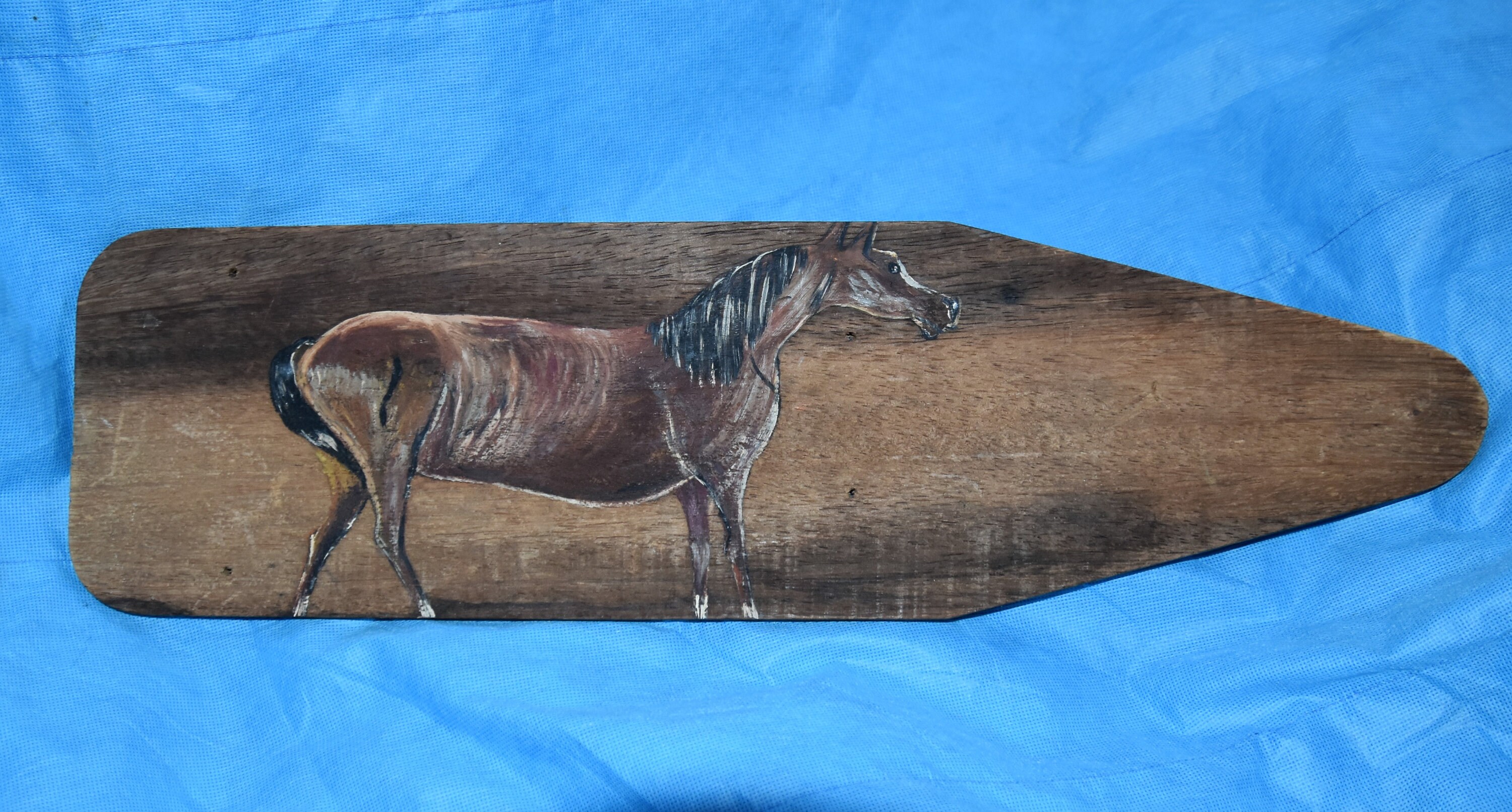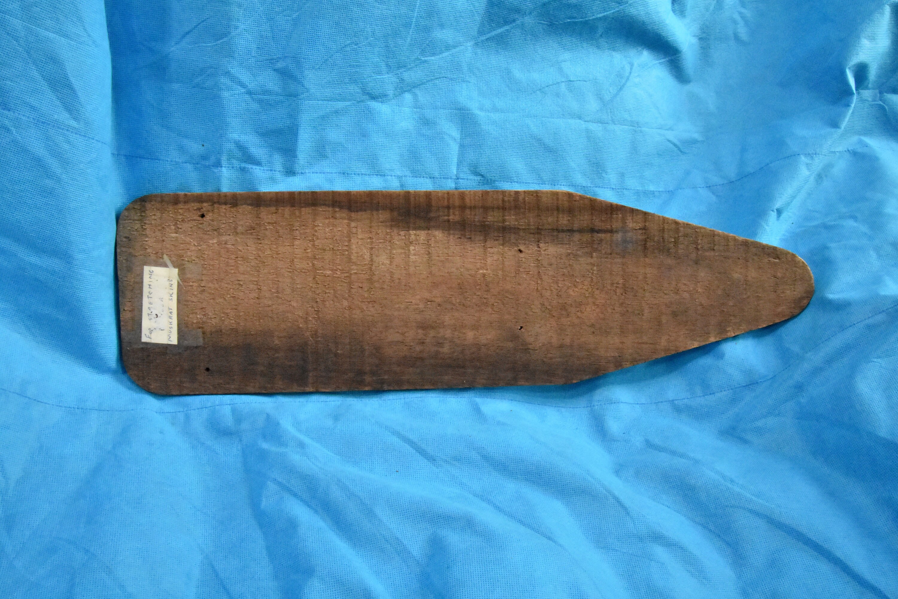 Vintage or antique muskrat pelt stretcher. Was in a family for at least two generations, was taken out of use, painted (horse painting) and then hung on a wall. The paper note on the back was apparently glued or pinned by one generation then taped more recently.
