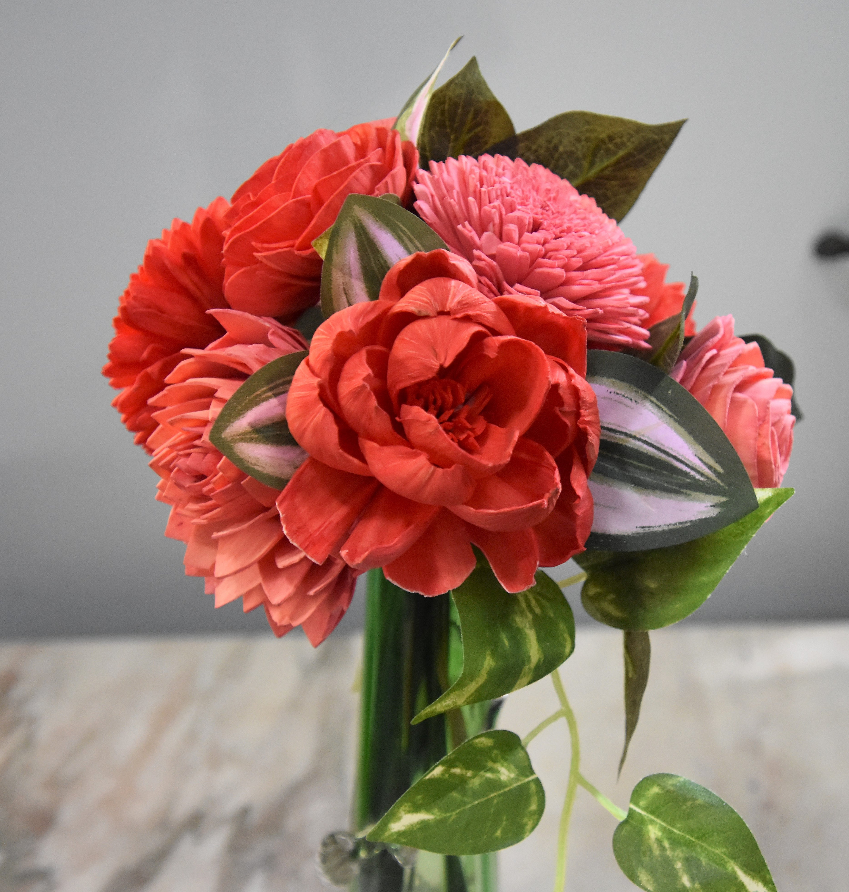 This stunning arrangement features hand dyed sustainable *Sola wood flowers and faux fillers.