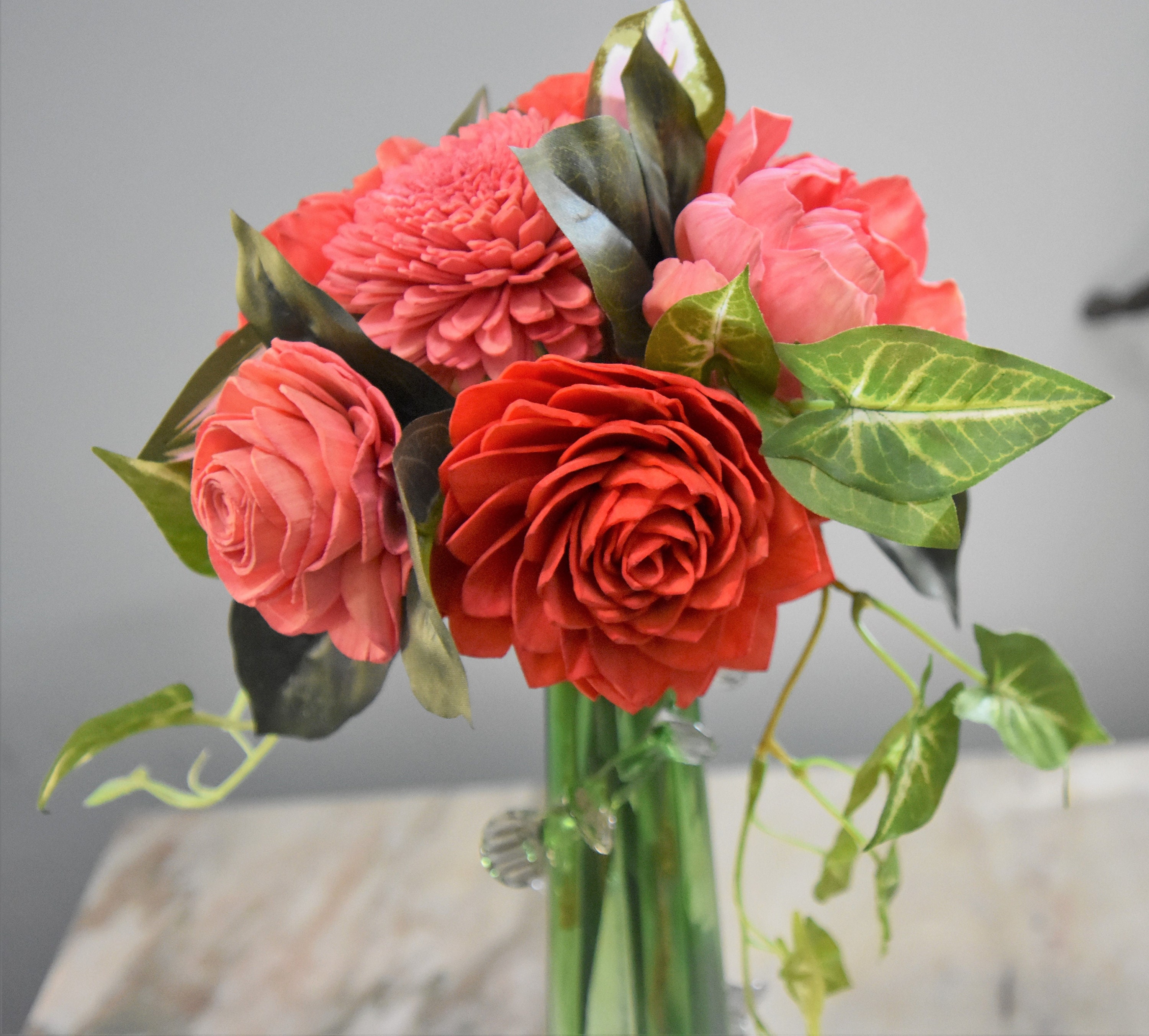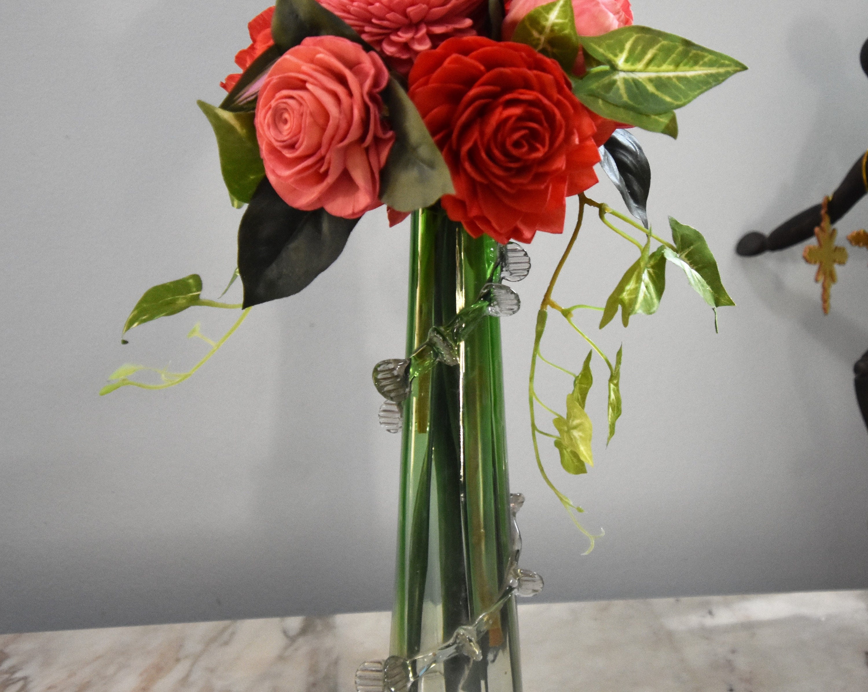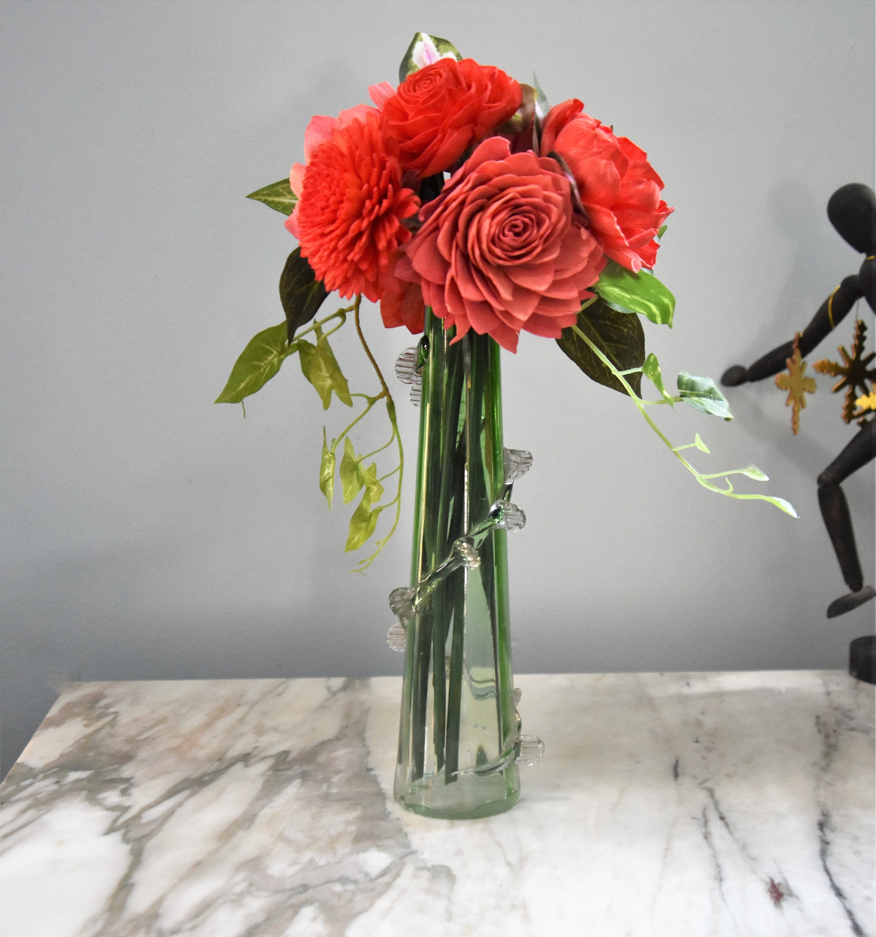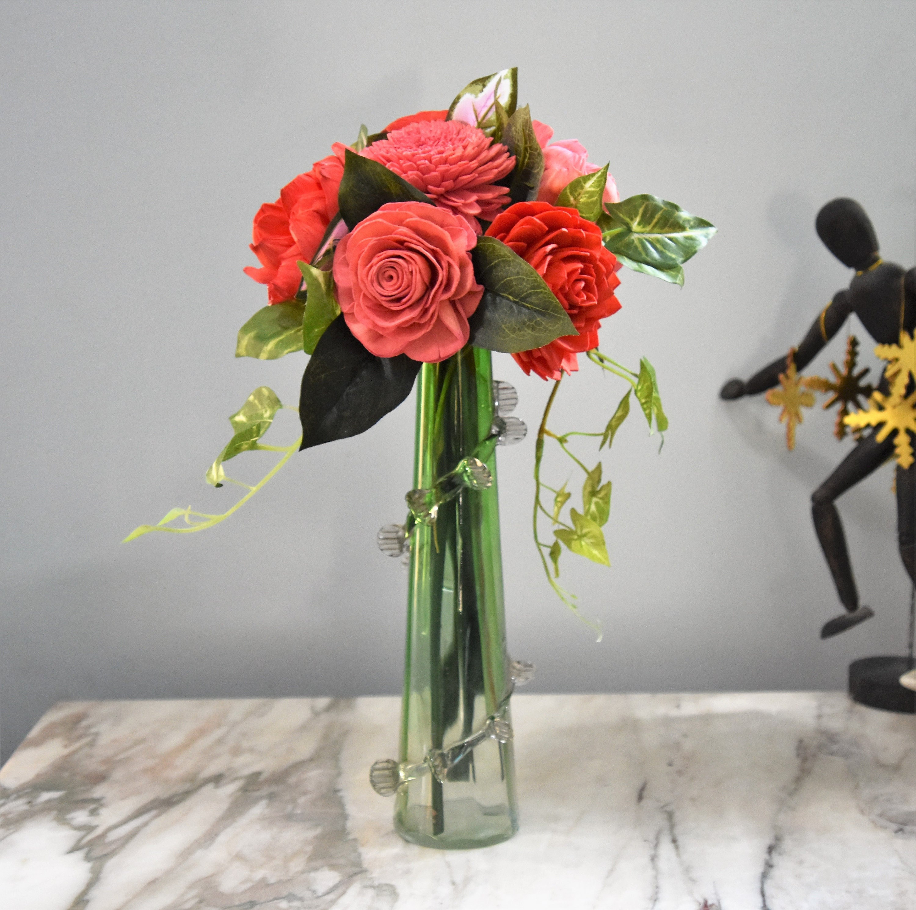 The featured flowers include 3 to 4 inch peonies, zinnias, roses dyed in watermelon red and coral pink in a vintage unique handmade fluted clear green hombre style, darker at the top clearer at the base with a glass vine-twisting around the from bottom to the top.