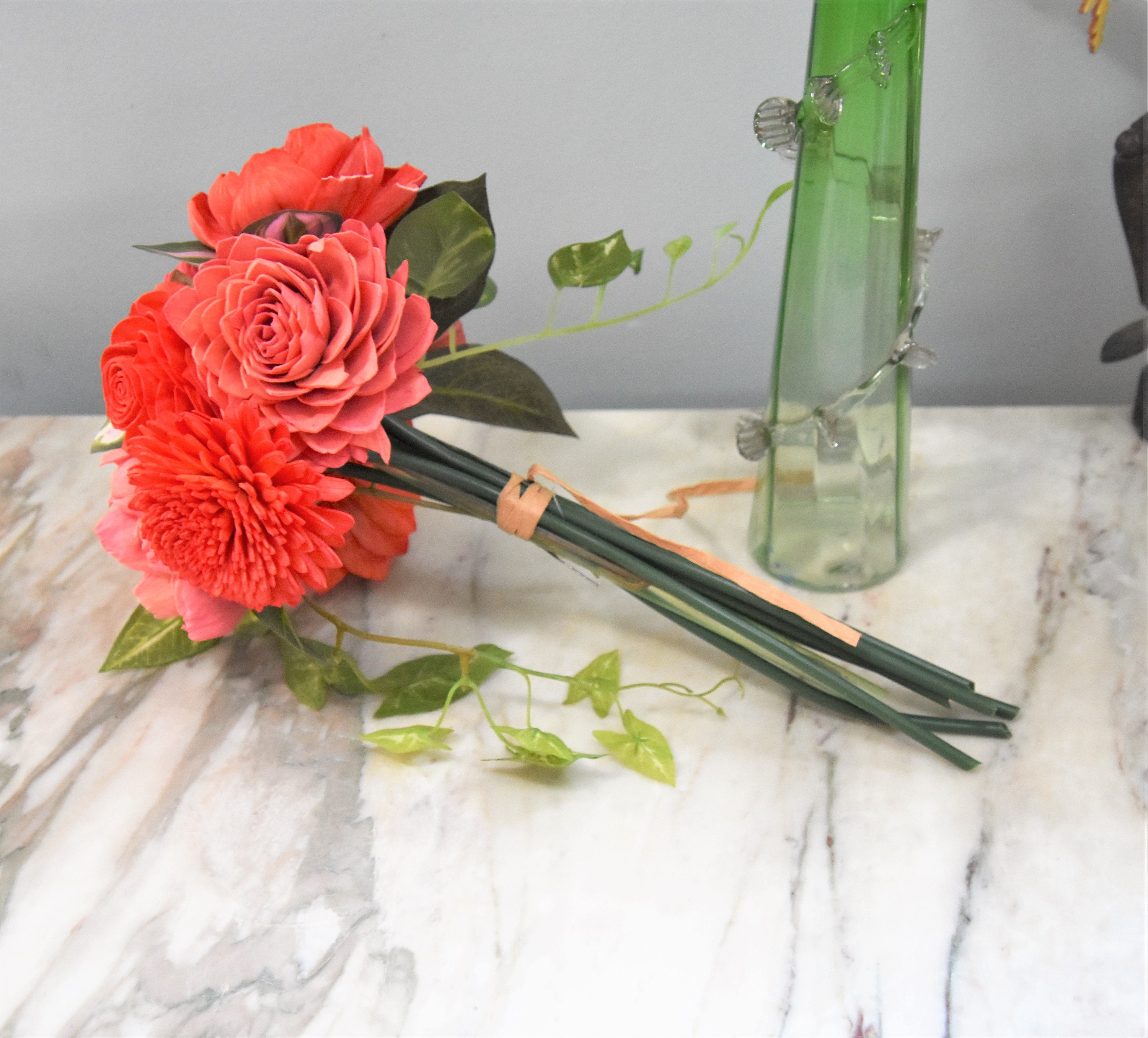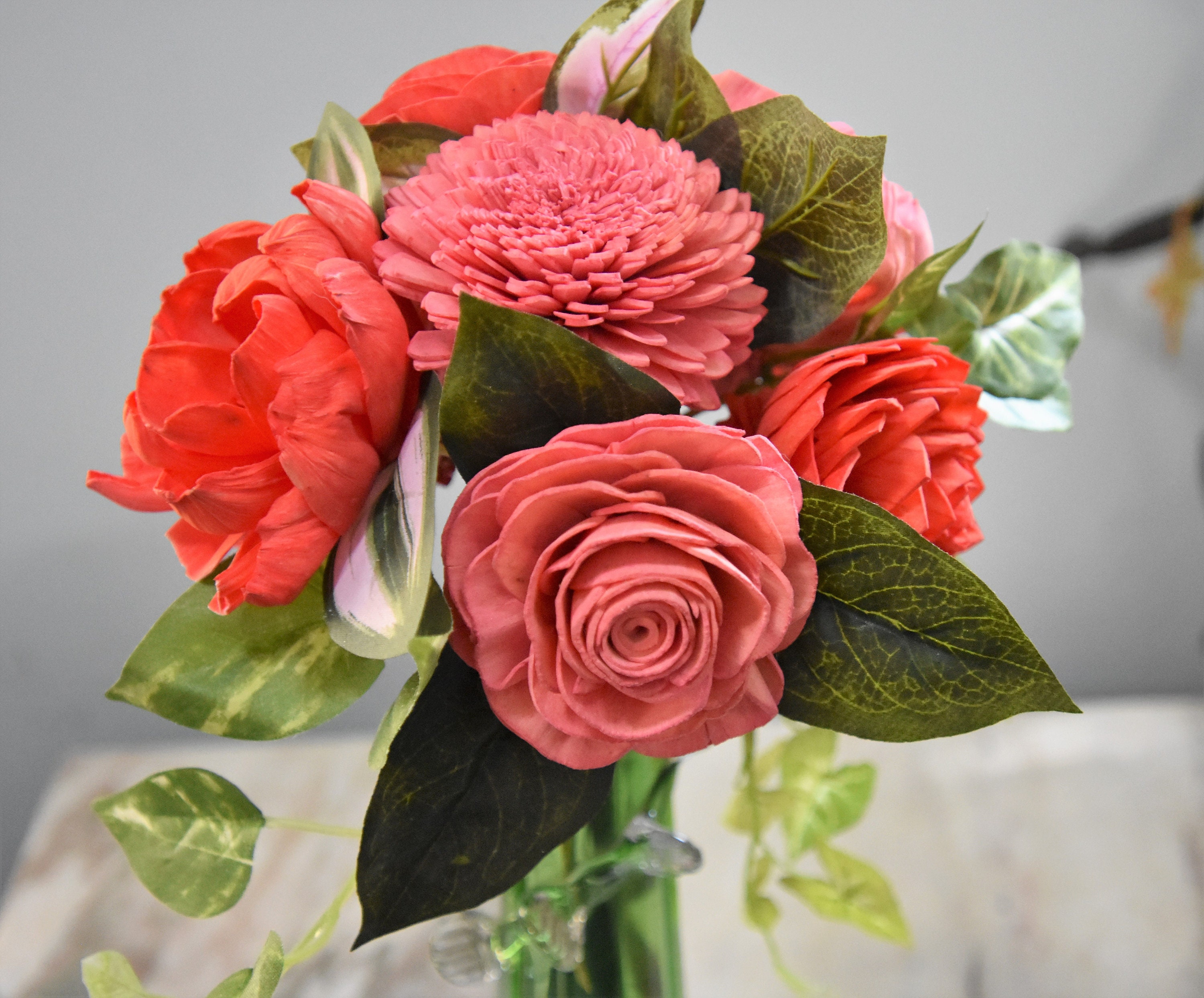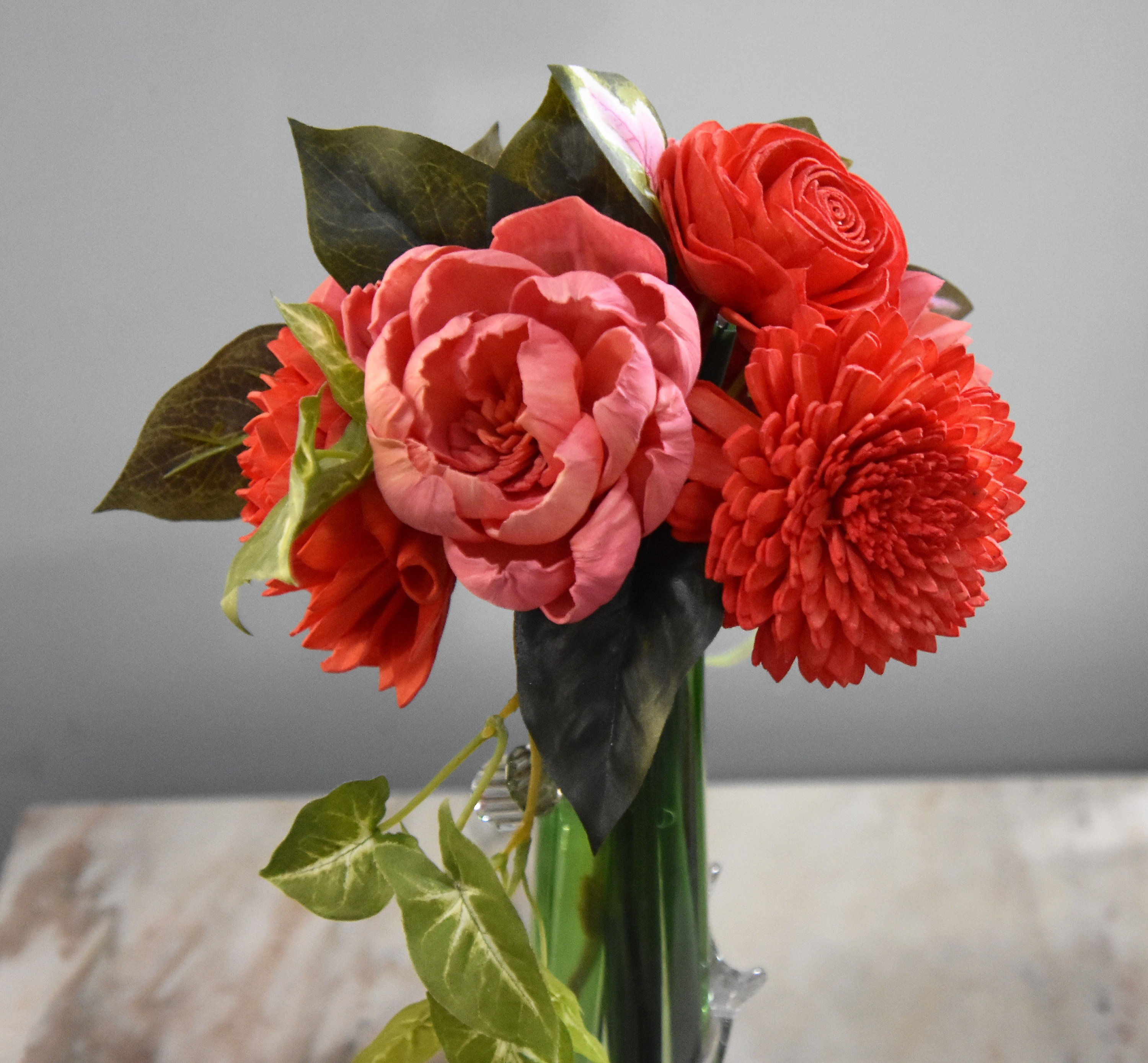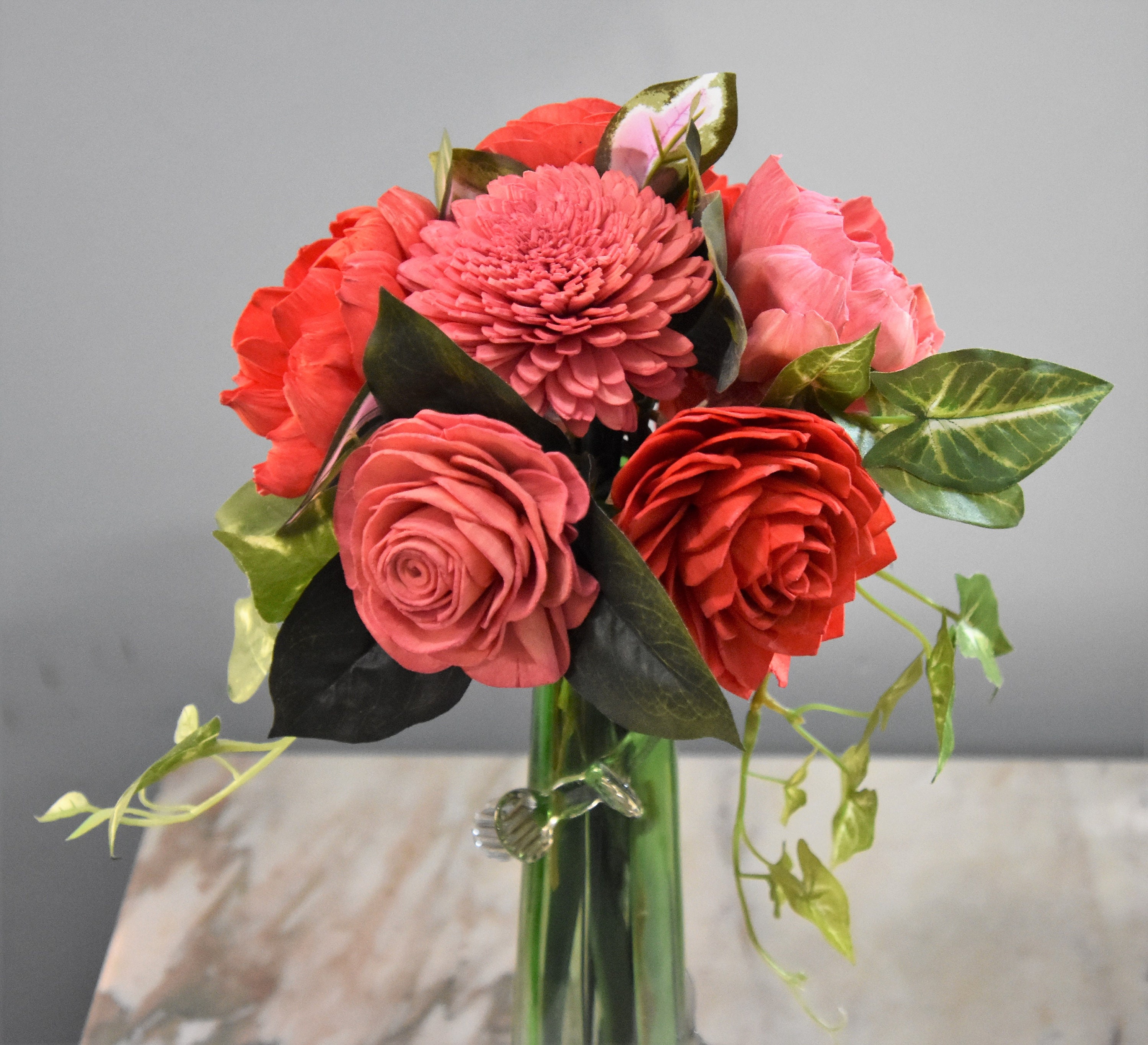 The featured flowers include 3 to 4 inch peonies, zinnias, roses dyed in watermelon red and coral pink in a vintage unique handmade fluted clear green hombre style, darker at the top clearer at the base with a glass vine-twisting around the from bottom to the top.