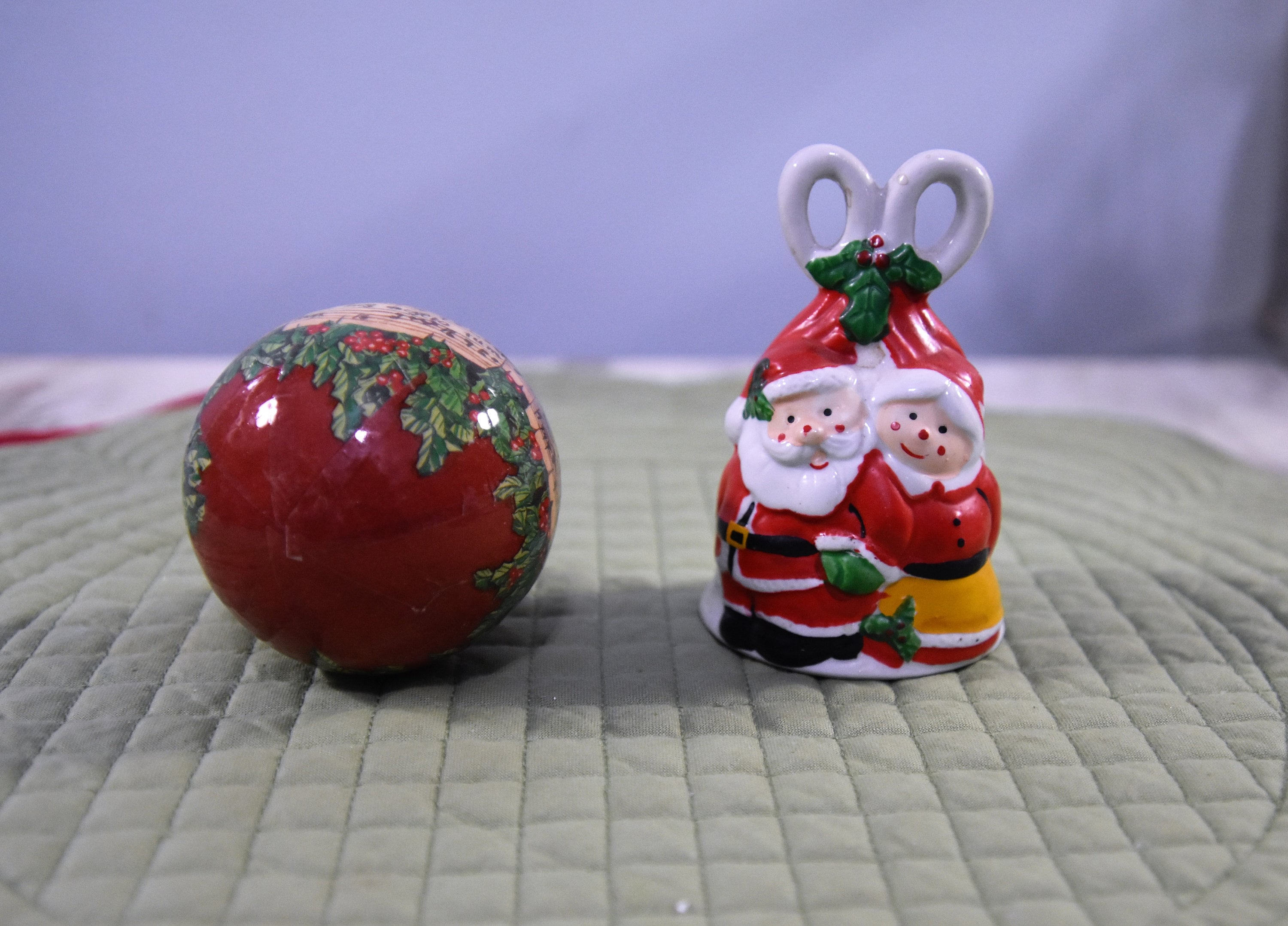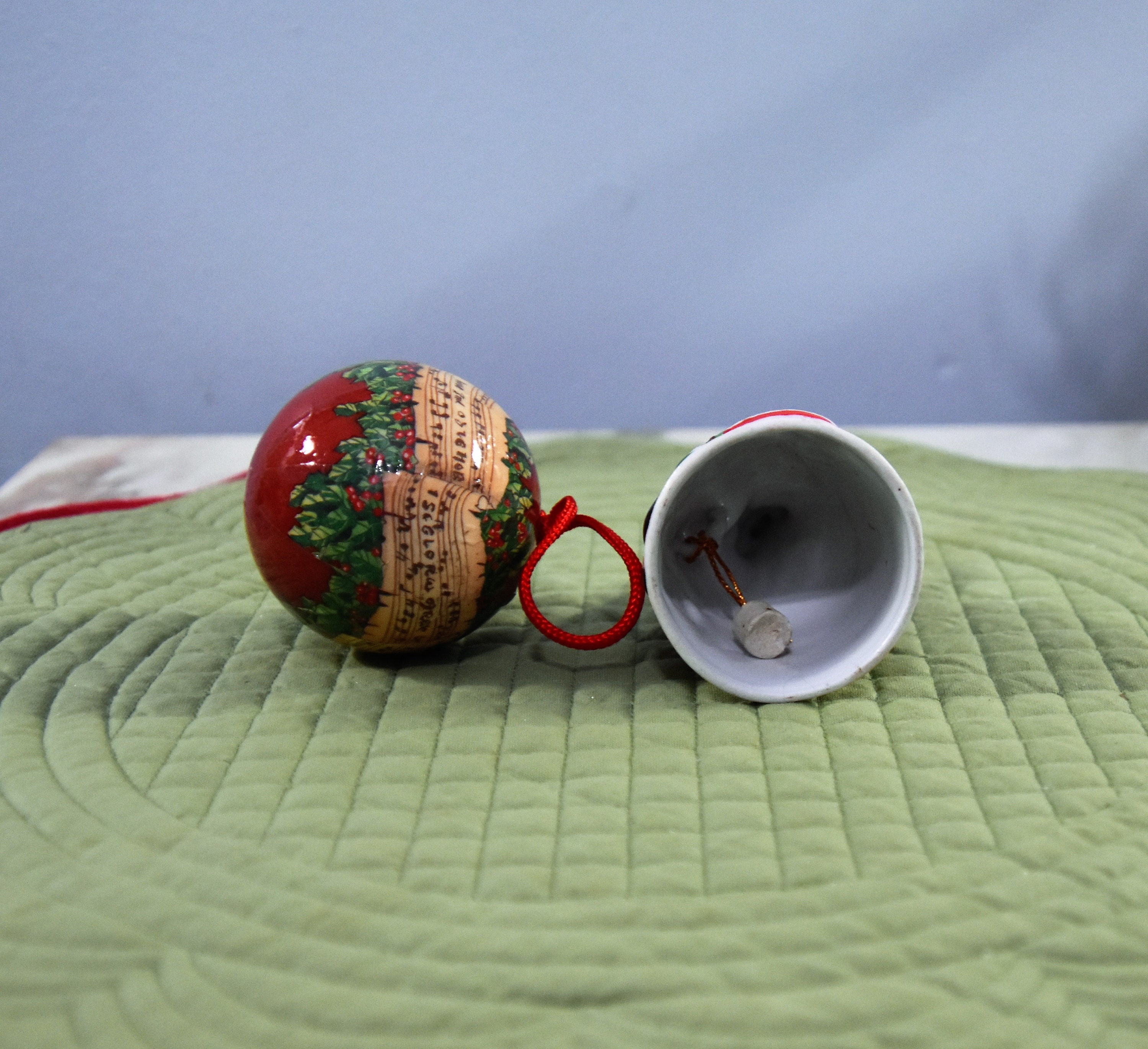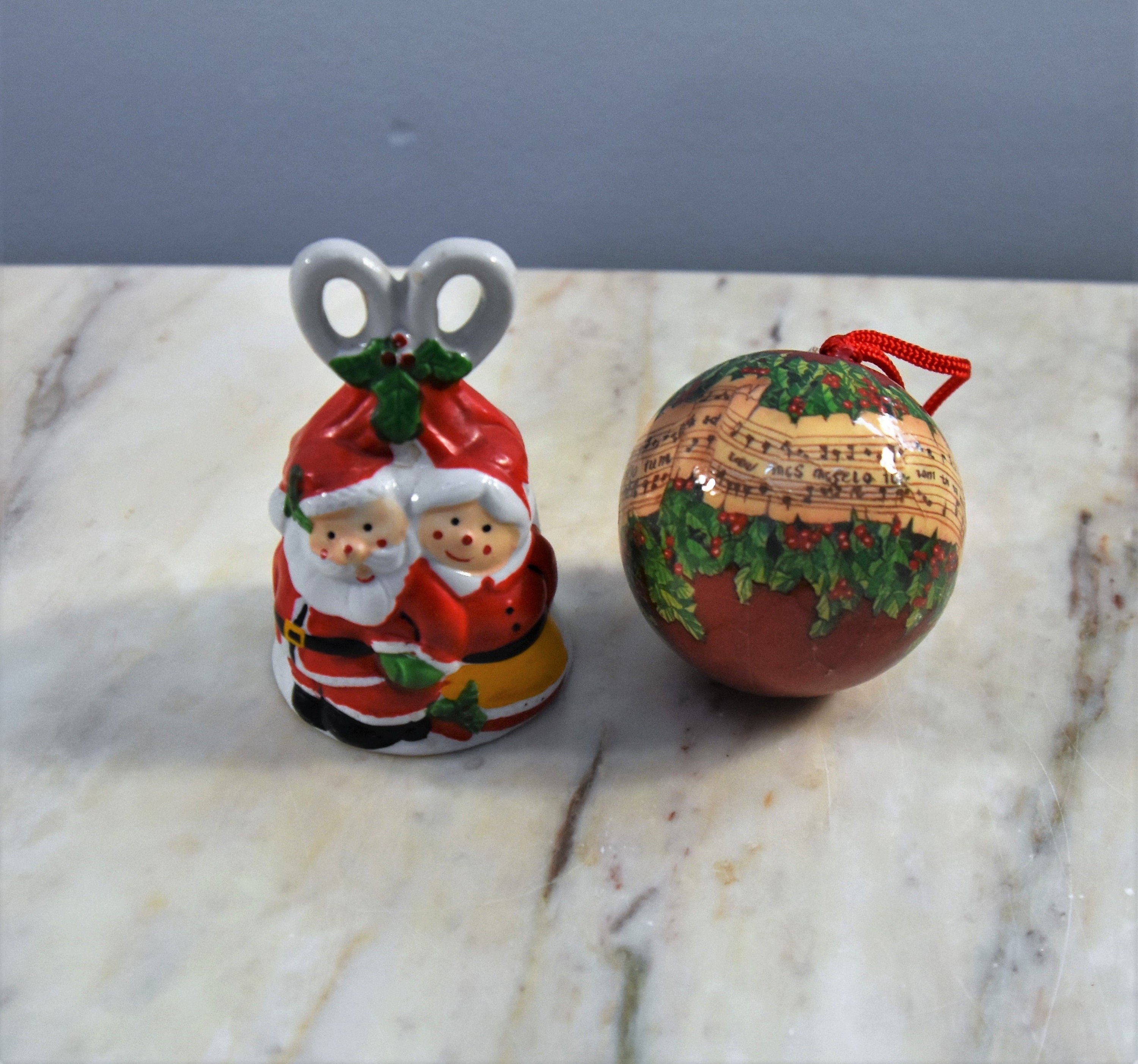 Porcelain bell with Santa and Mrs Clause in great condition - still wrings with porcelain clapper - also adding in a music sheet style lightweight almost decoupage type ball ornament. Bell - 3 inches tall and 2 inches wide. Ball- 2 1/2 inches.