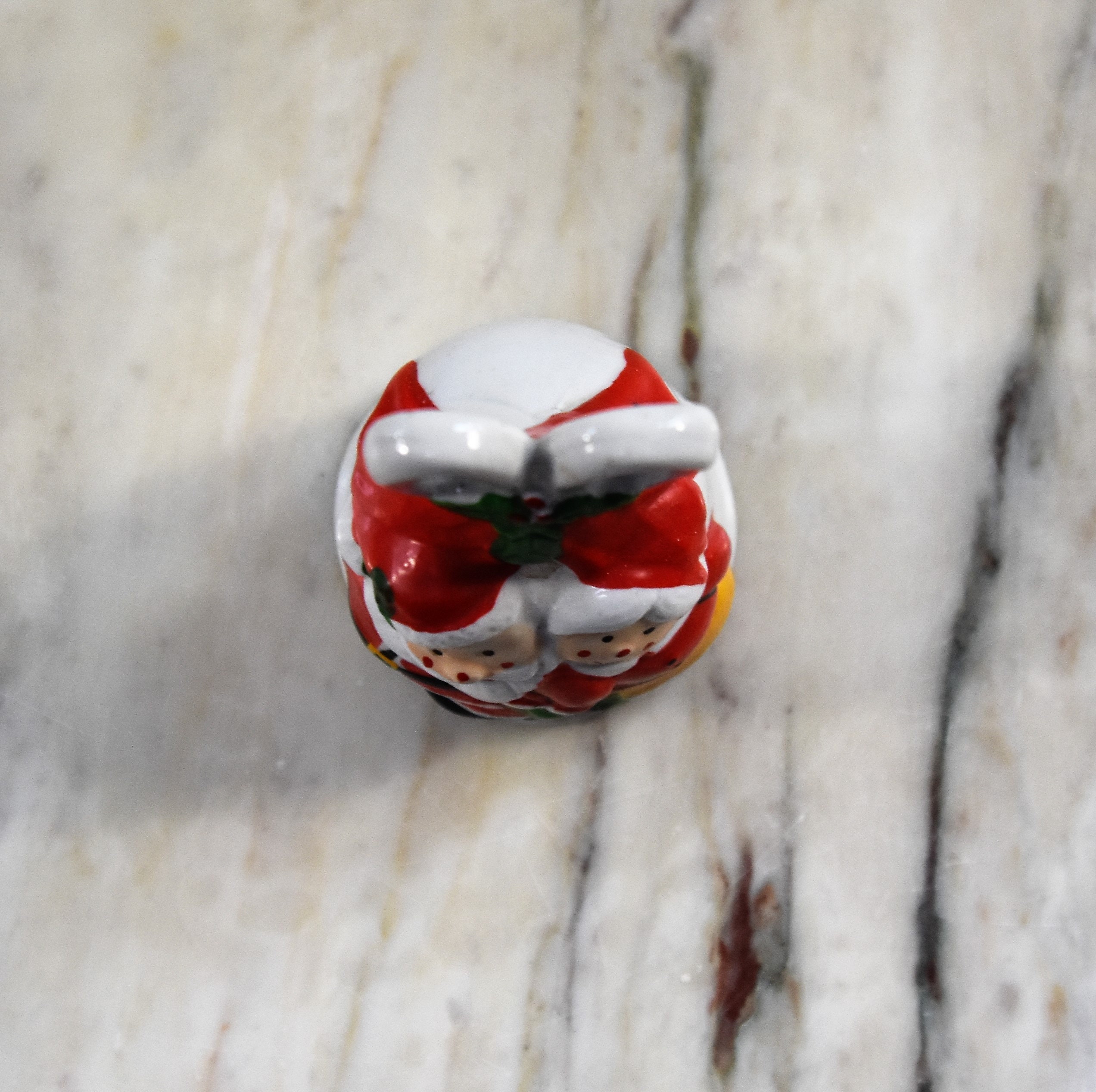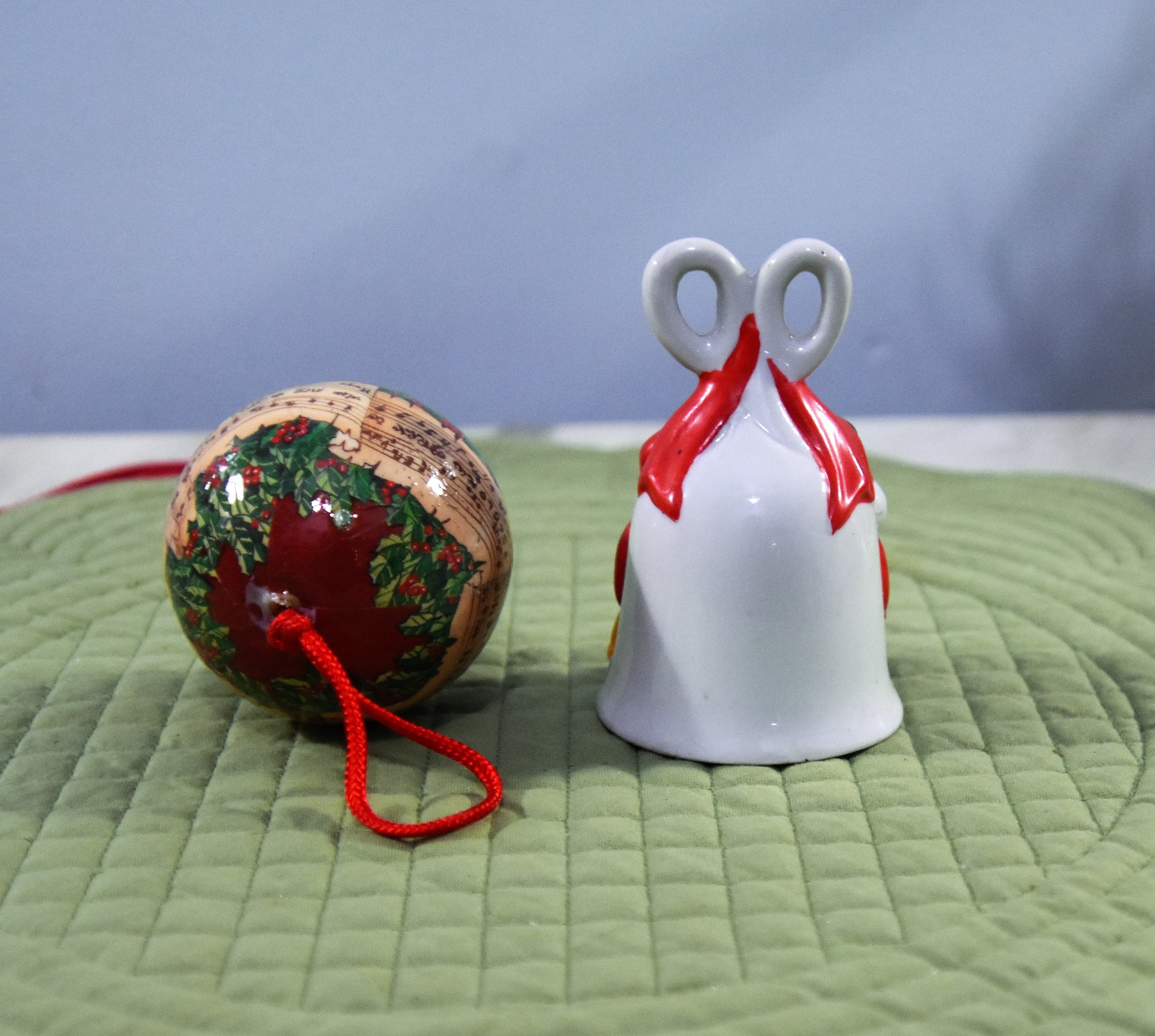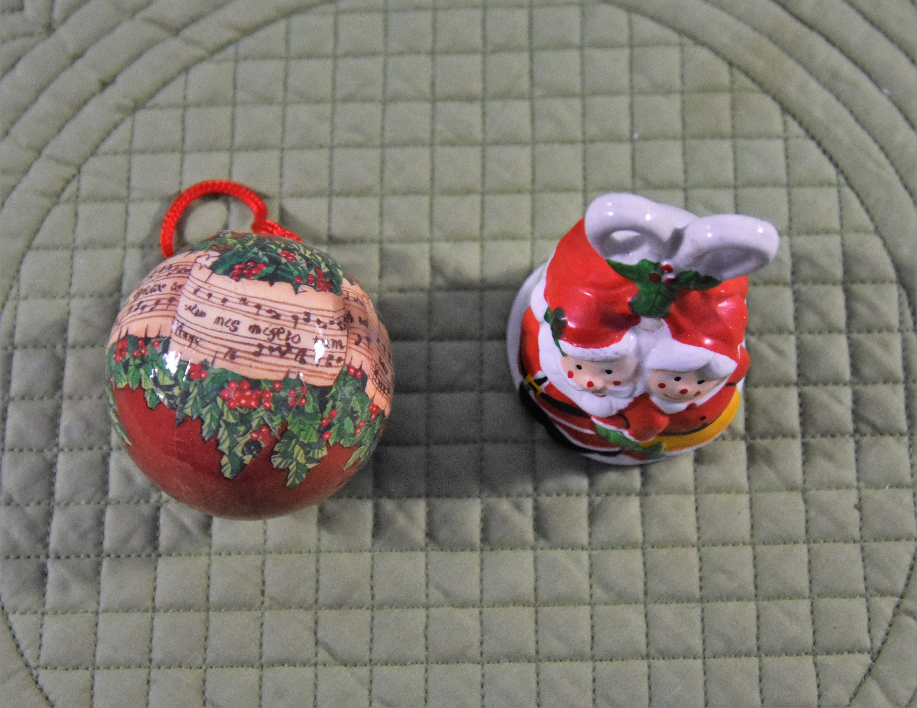 Porcelain bell with Santa and Mrs Clause in great condition - still wrings with porcelain clapper - also adding in a music sheet style lightweight almost decoupage type ball ornament. Bell - 3 inches tall and 2 inches wide. Ball- 2 1/2 inches.