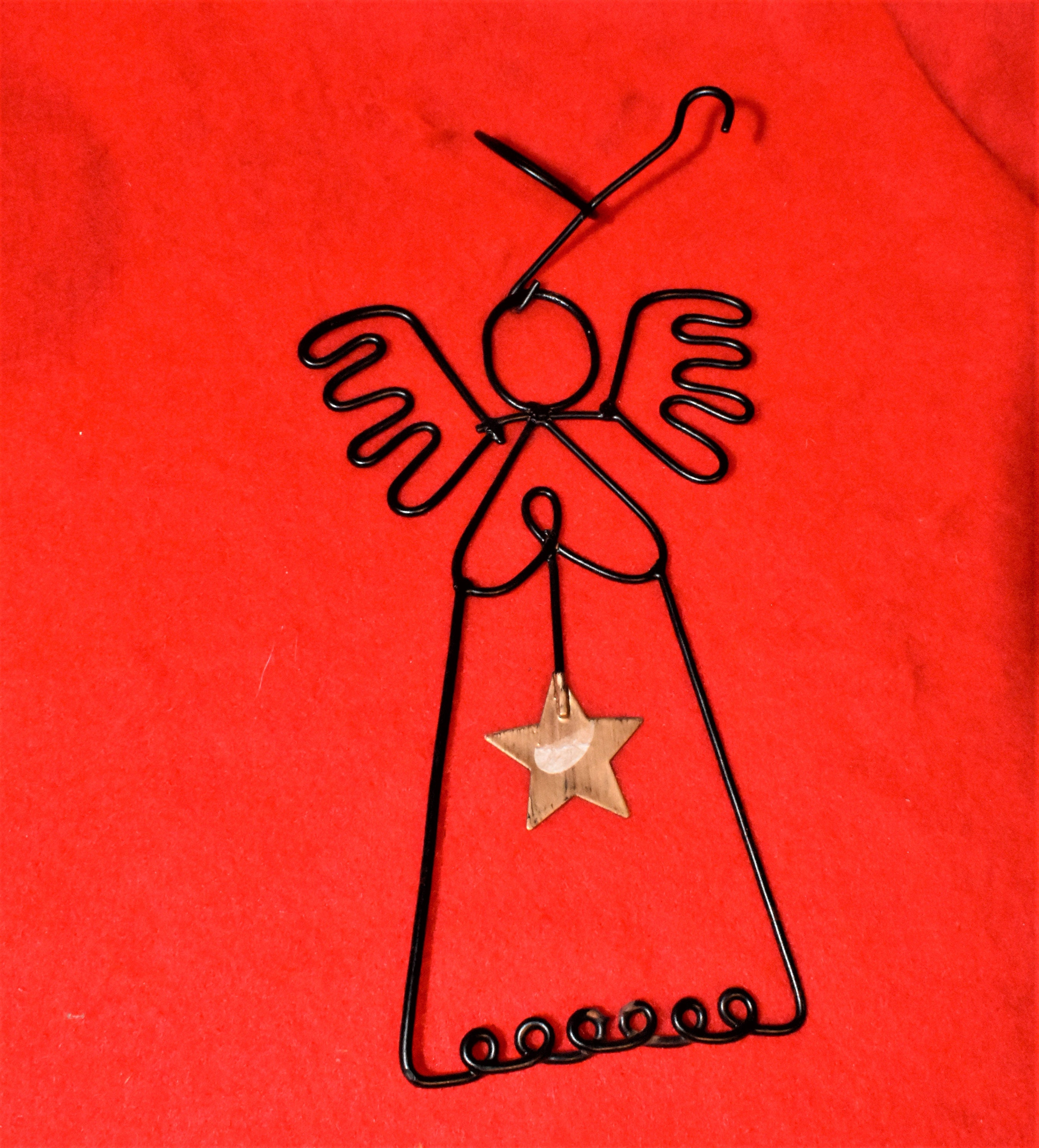 Black wire twisted and soldered into the shape of angel. The angel is holding a star made of black metal painted to look like old brass metal.