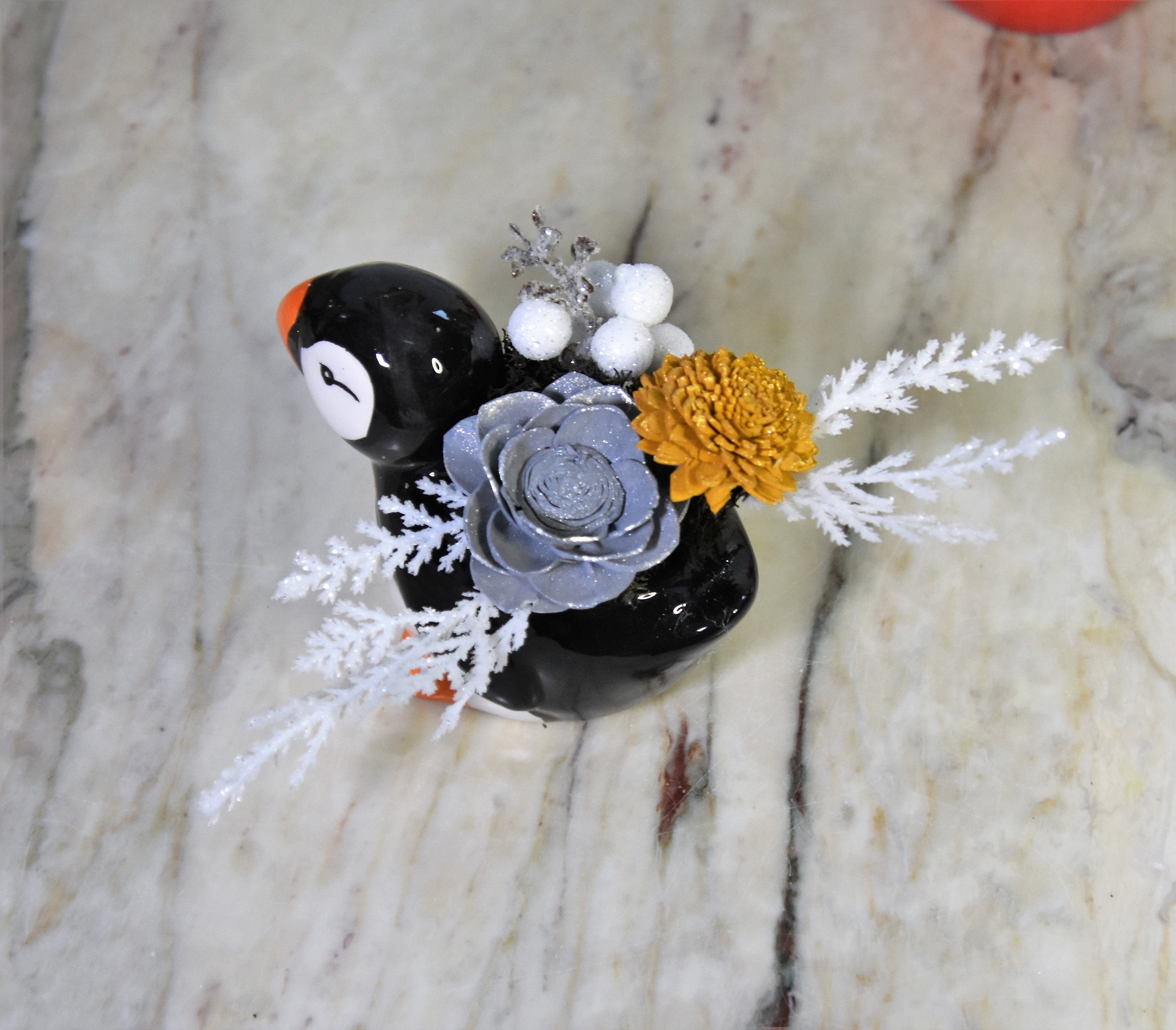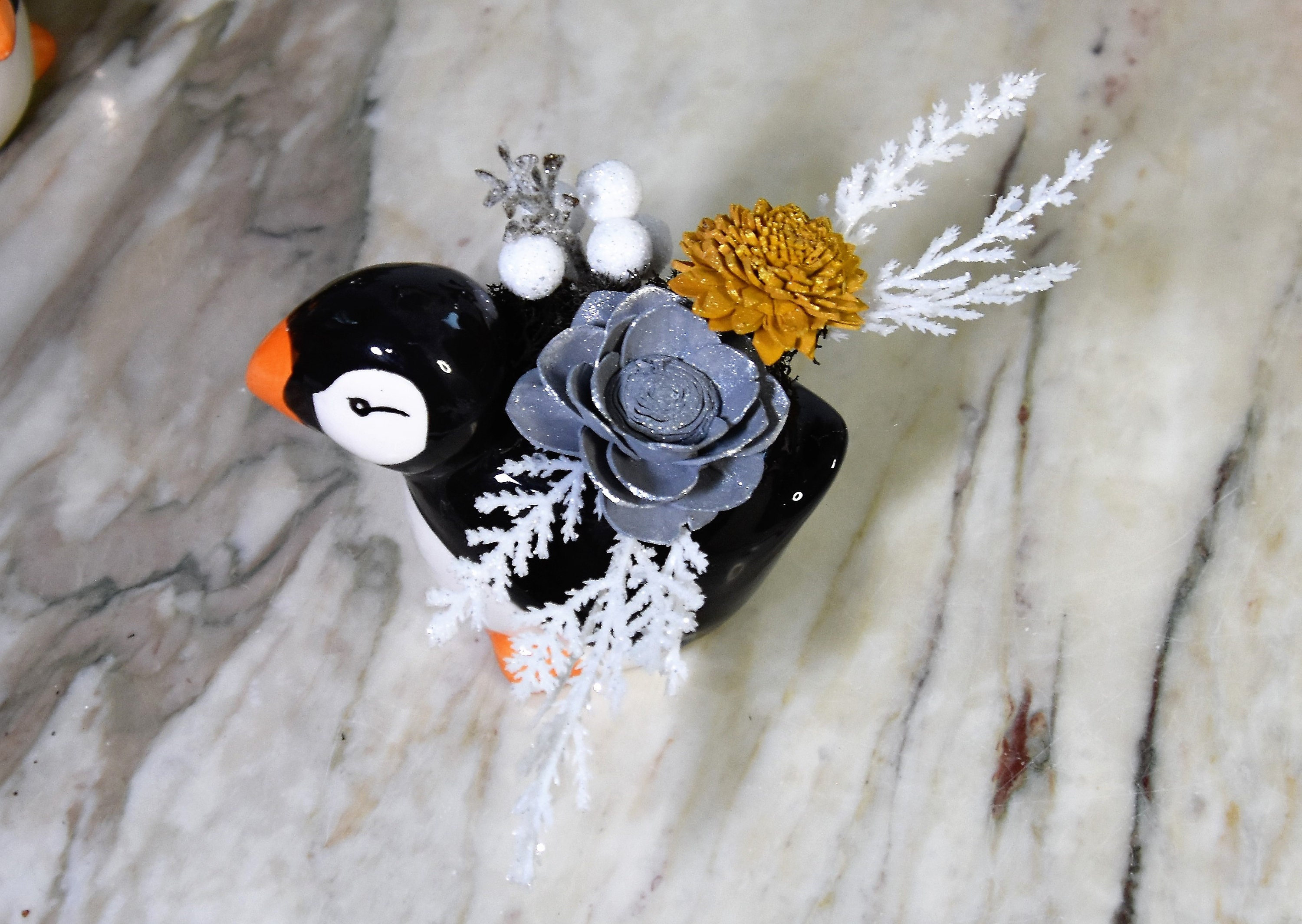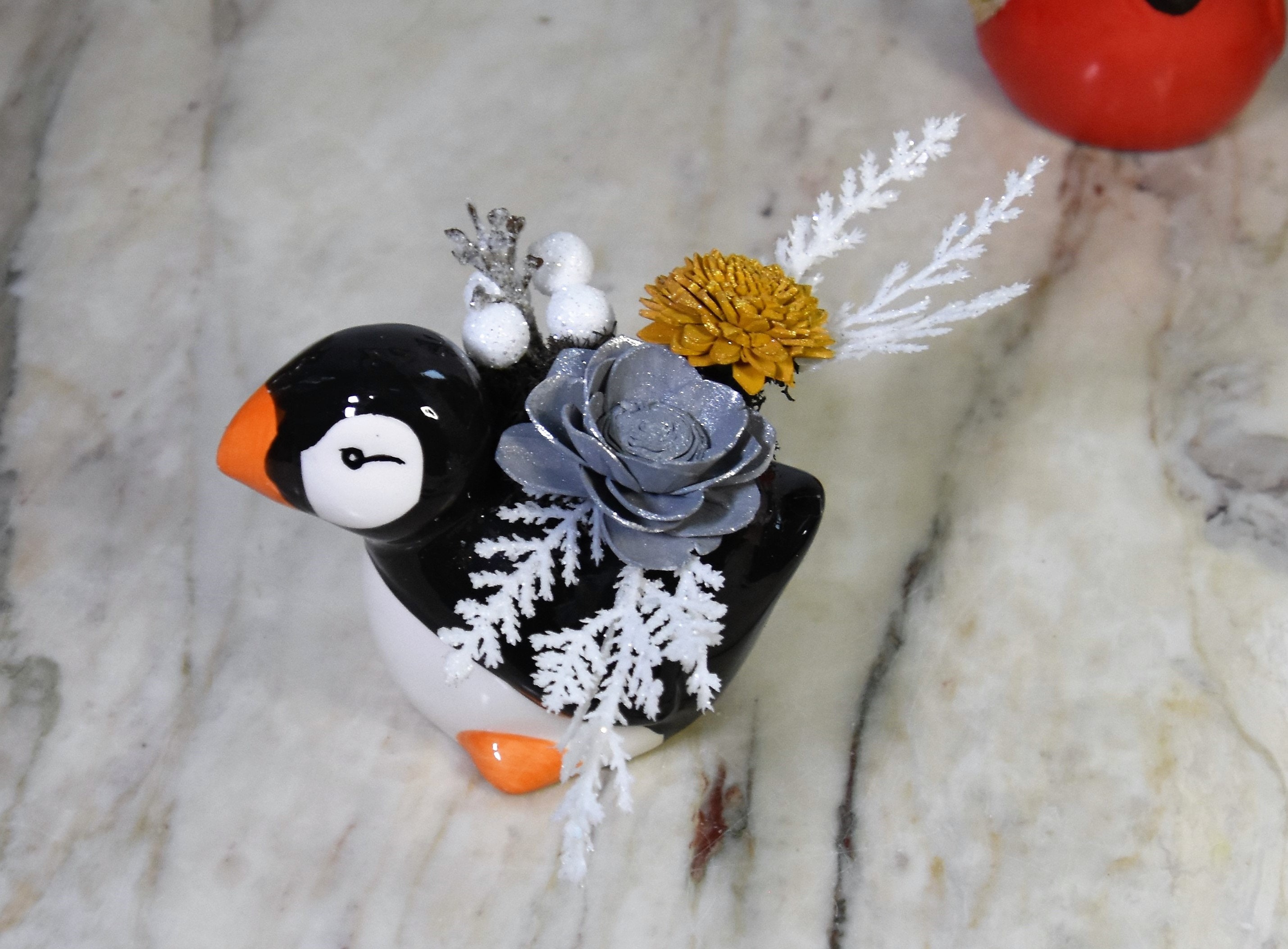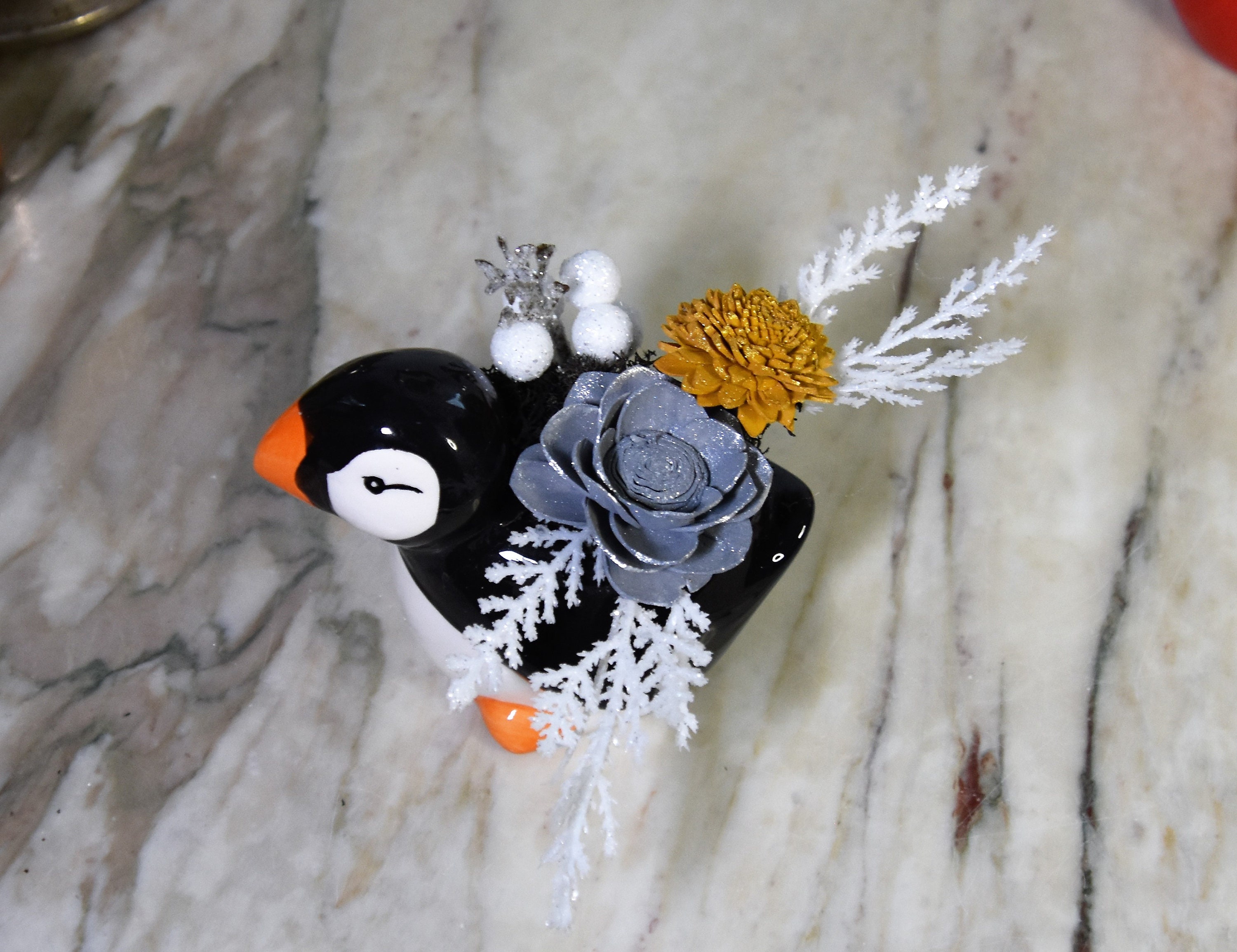 Adorable ceramic penguin planter filled with *Sola wood gold and sliver flowers with hand-painted highlights using sparkling mica paint. Flowers are in reindeer moss with sparkling fillers.