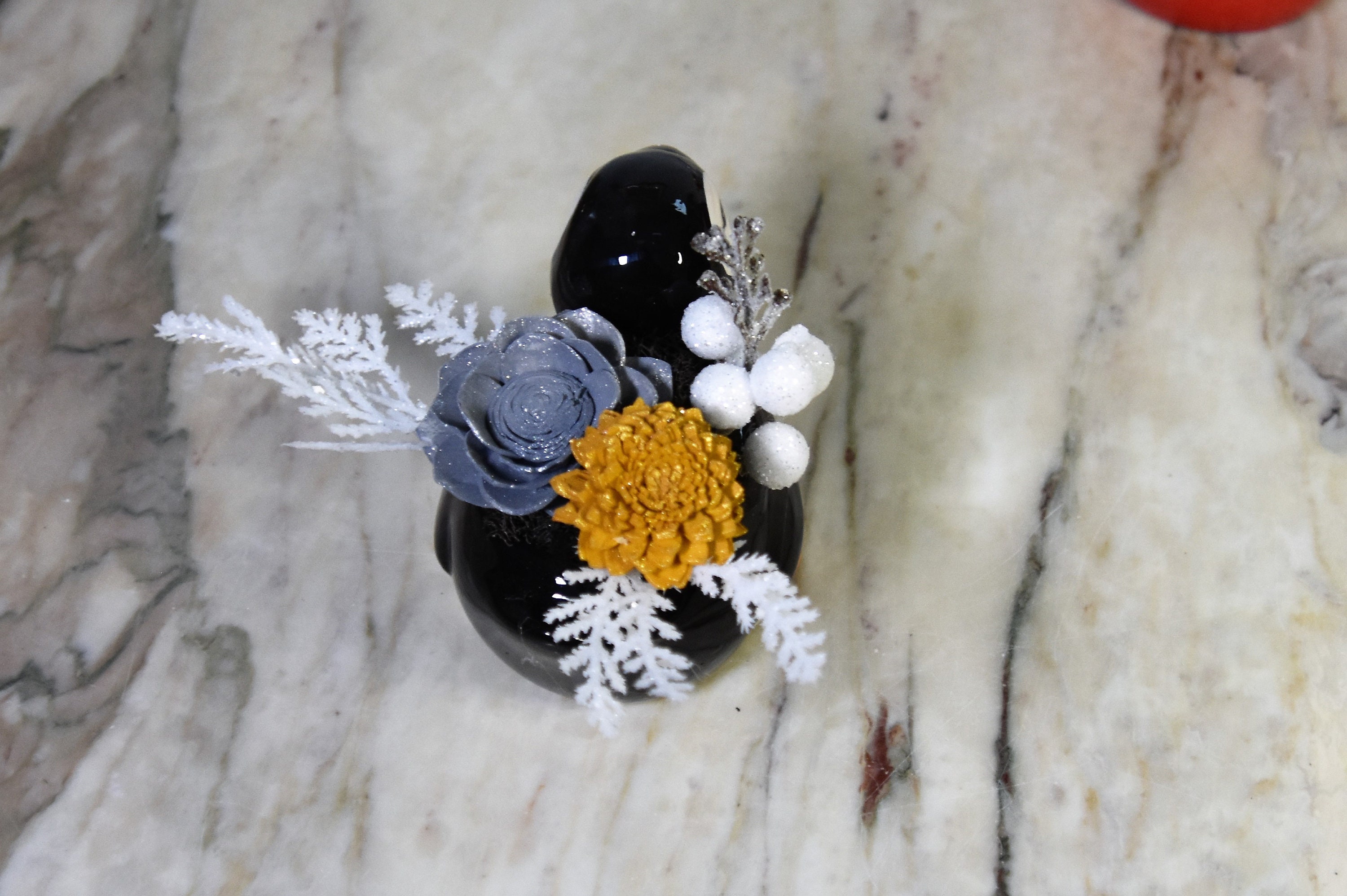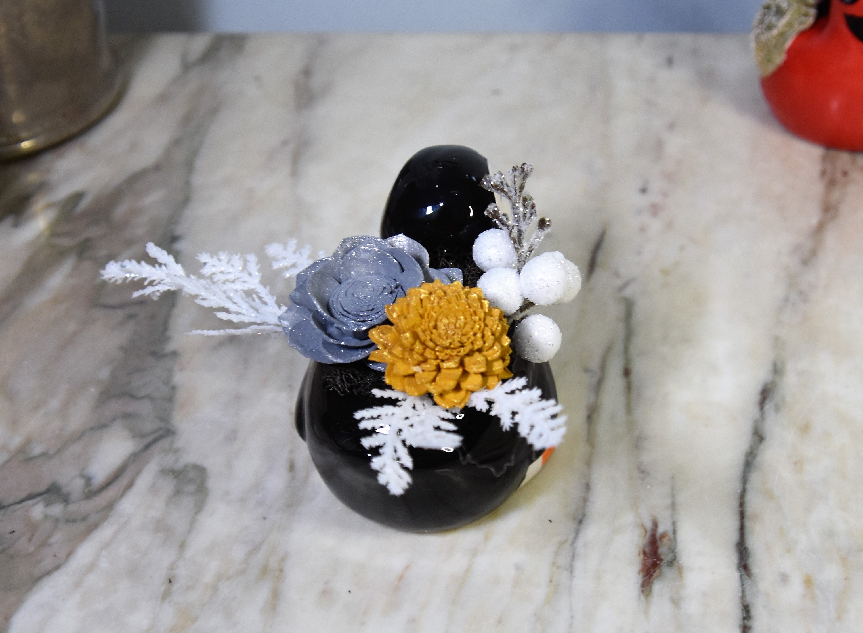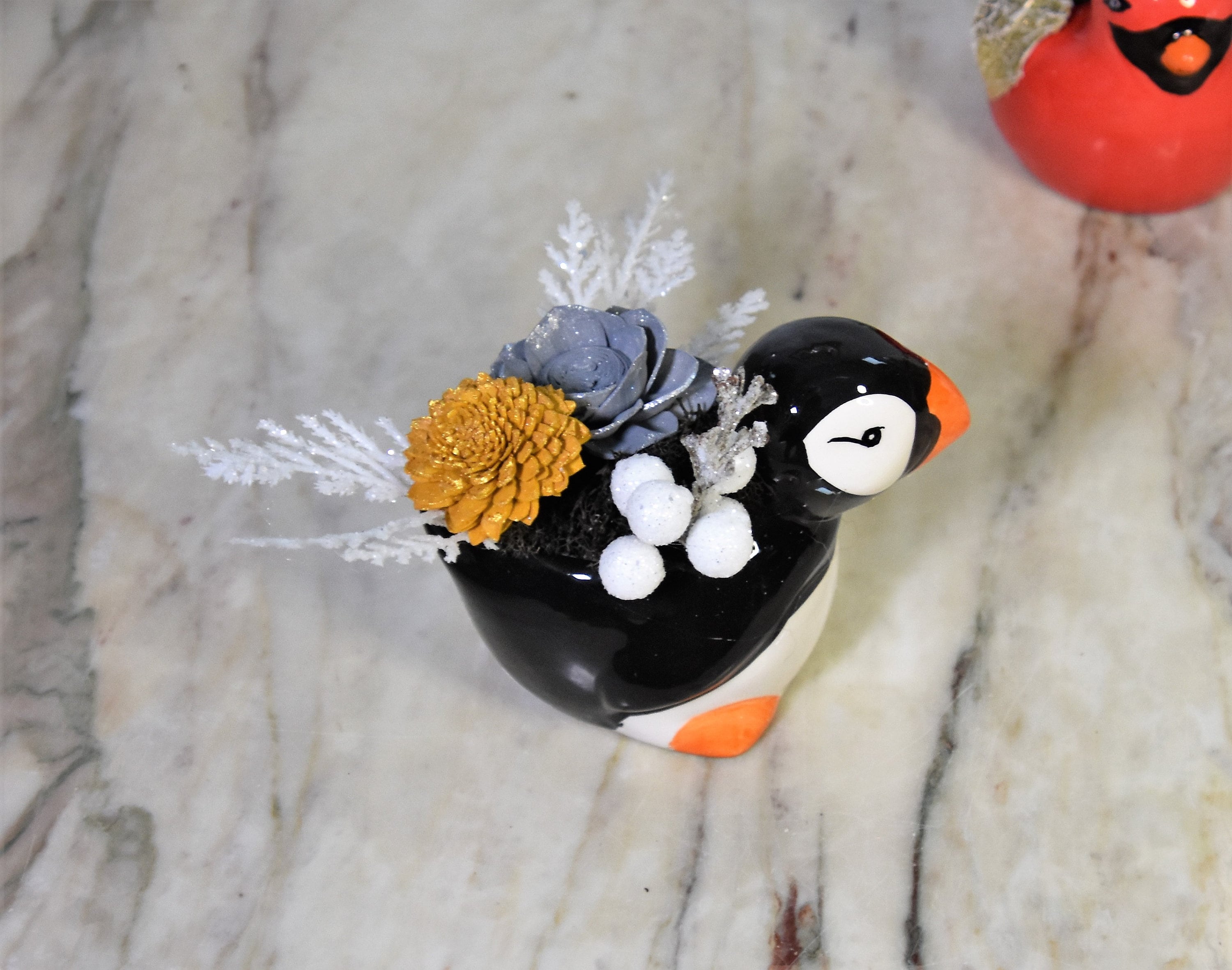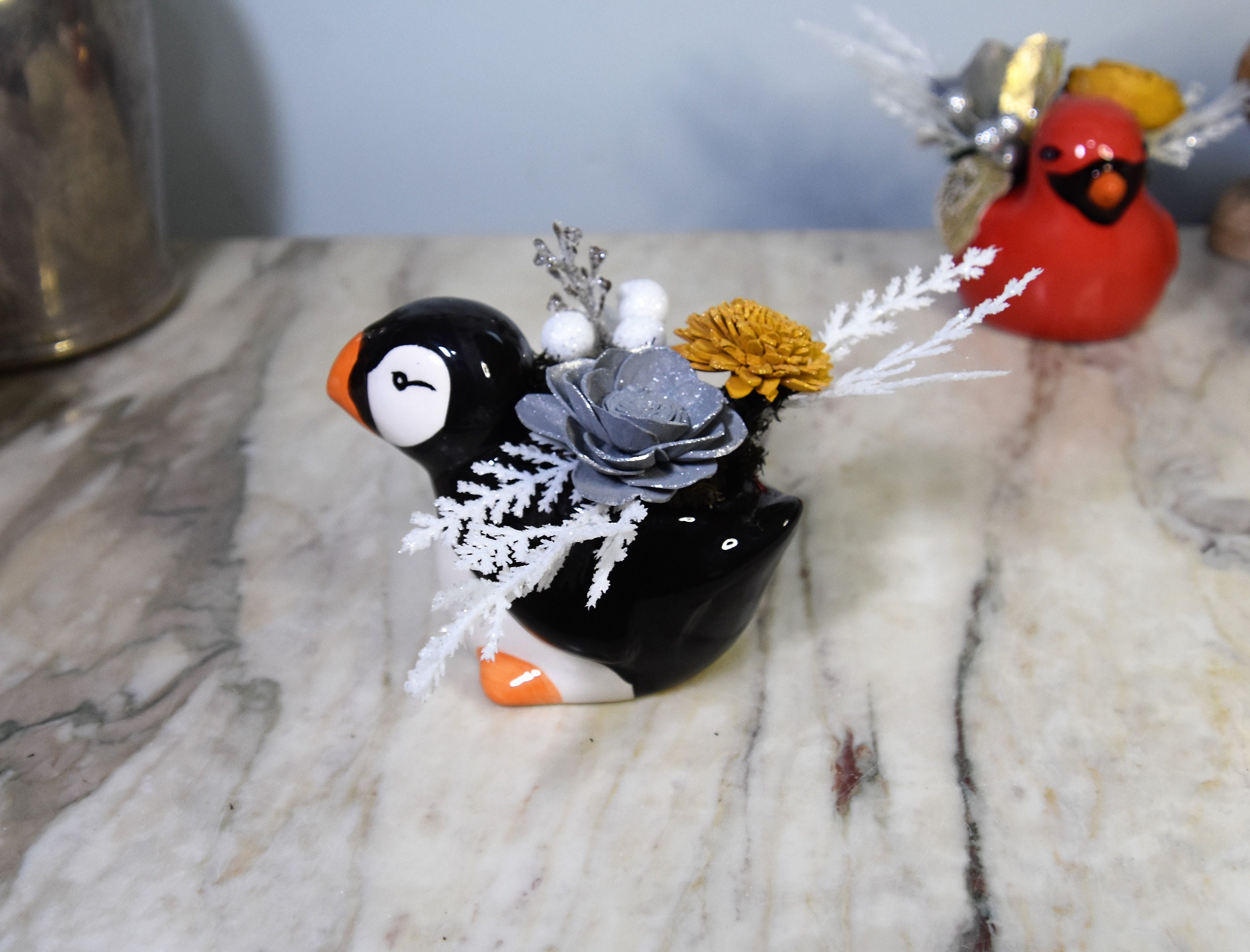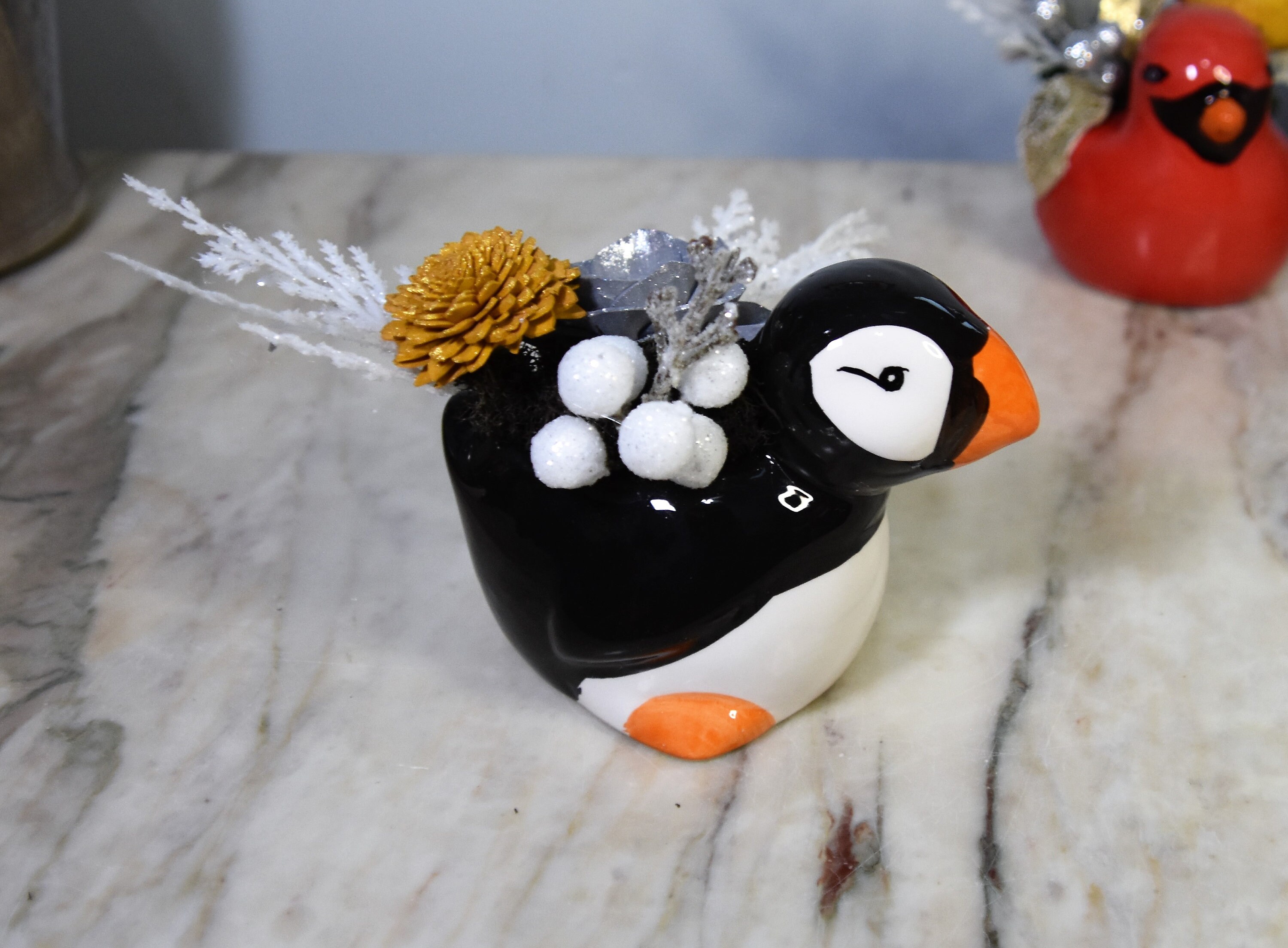 Adorable ceramic penguin planter filled with *Sola wood gold and sliver flowers with hand-painted highlights using sparkling mica paint. Flowers are in reindeer moss with sparkling fillers.