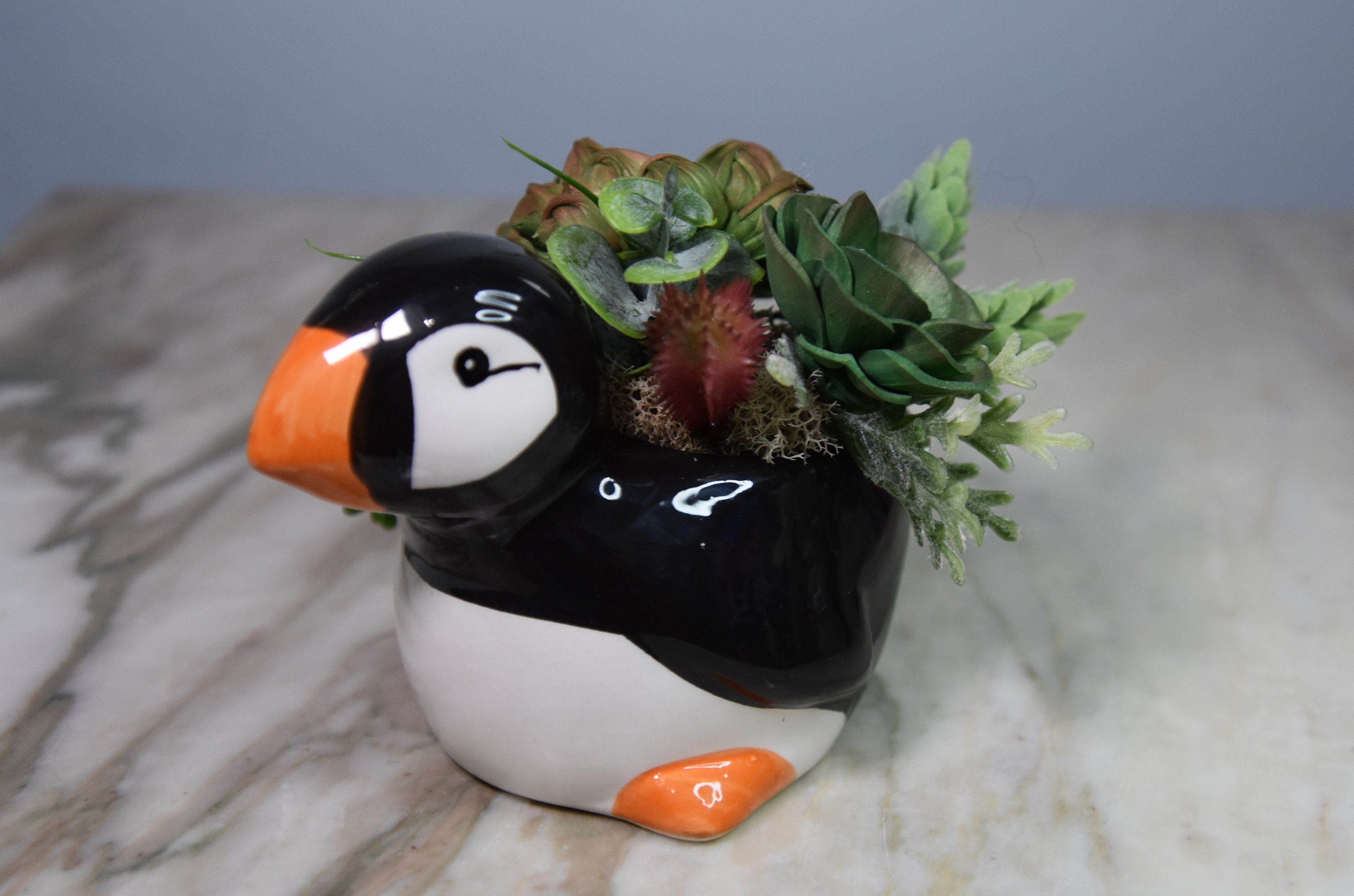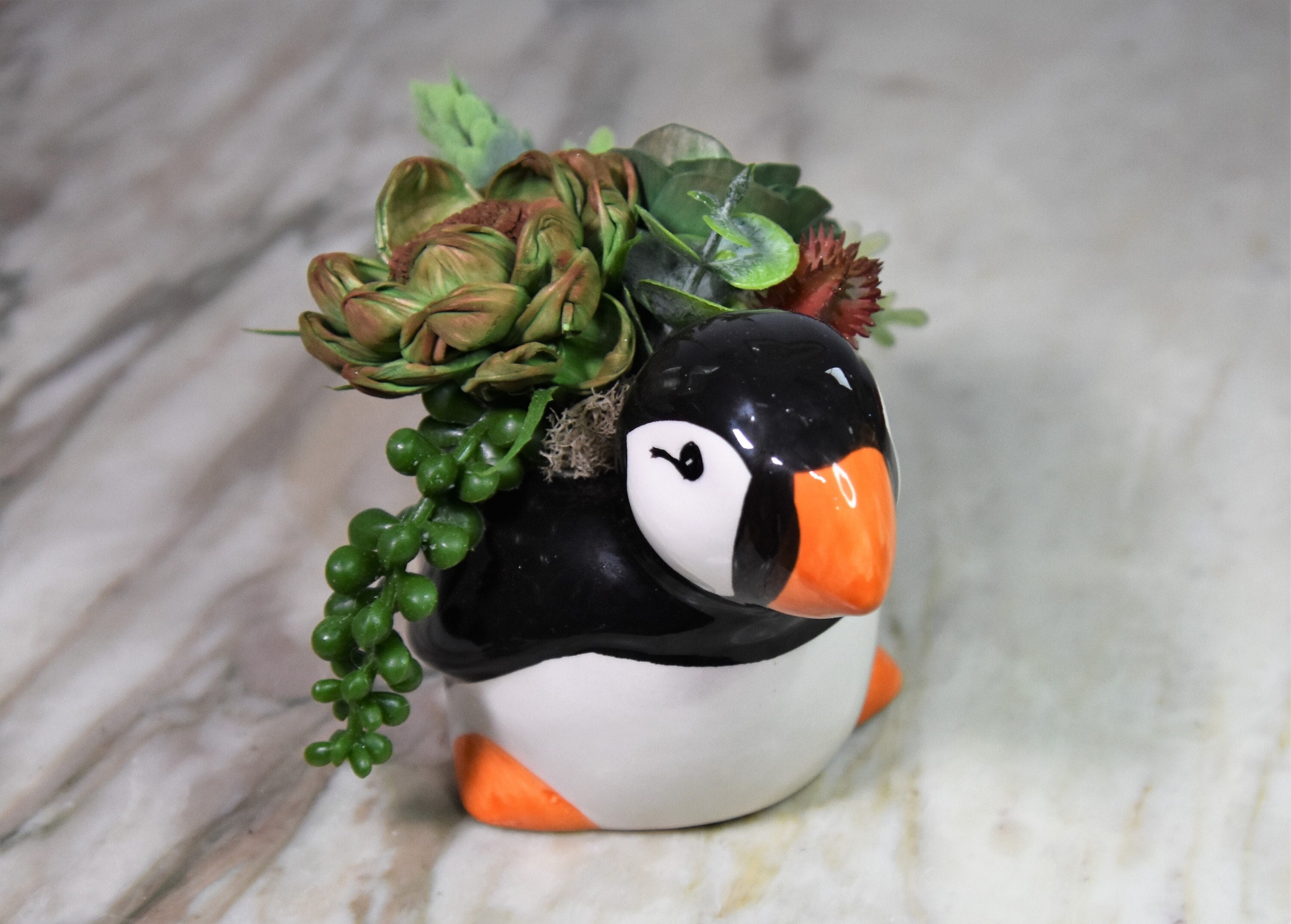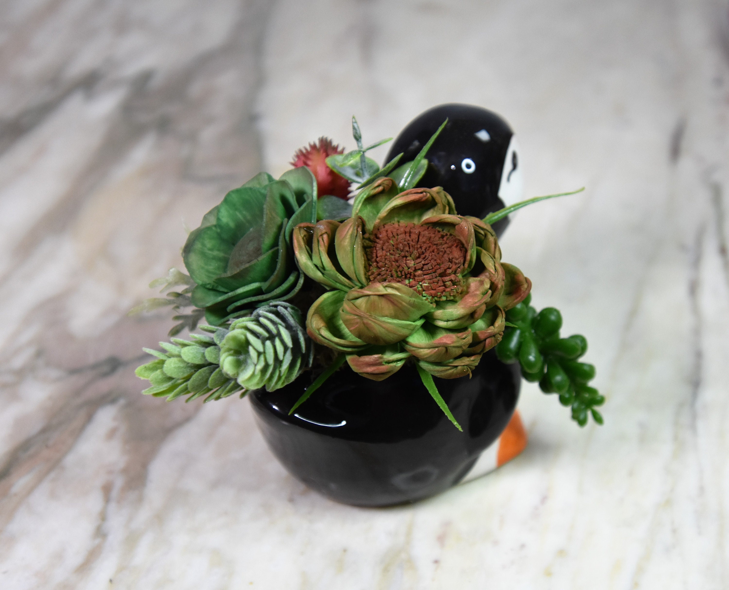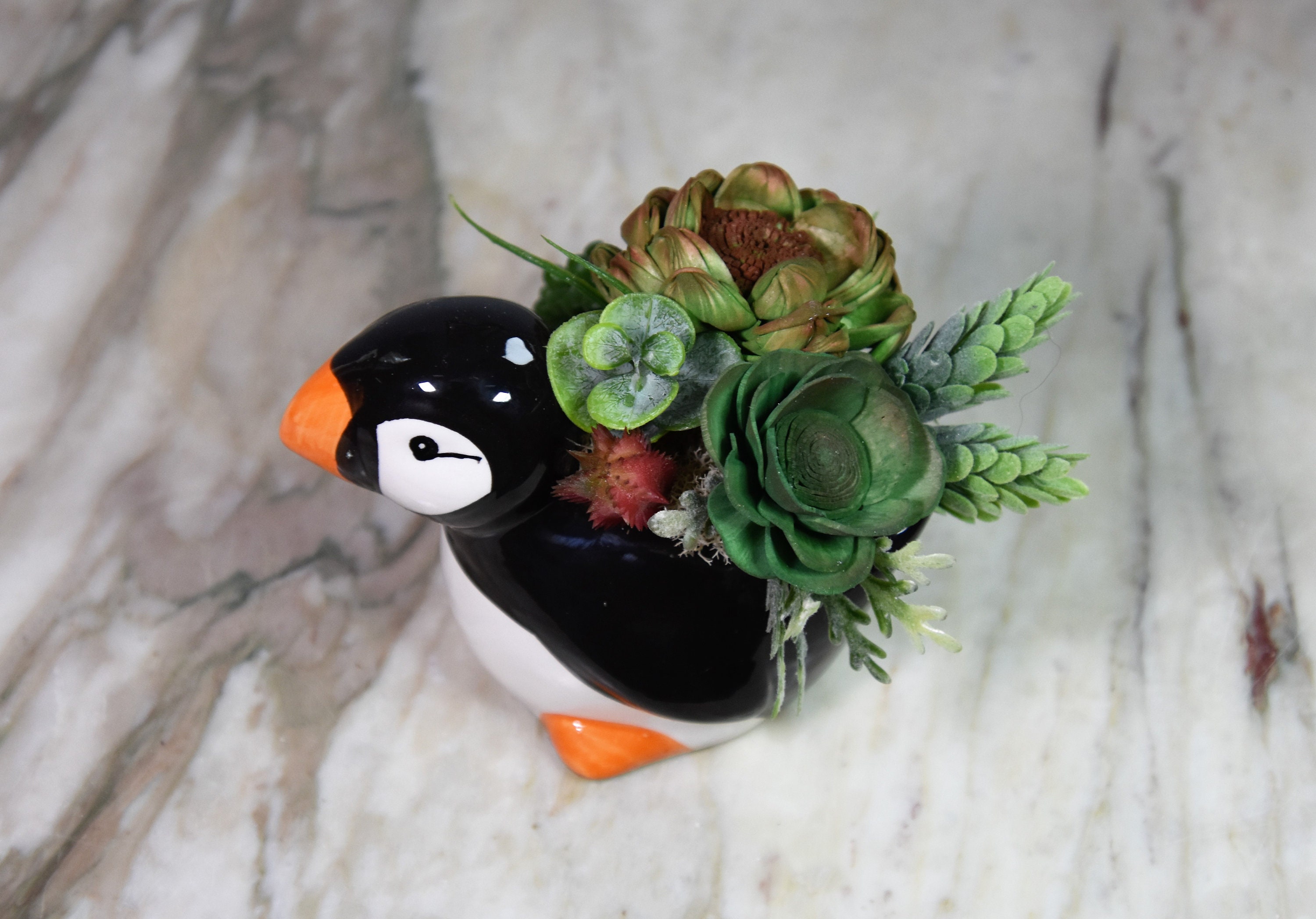Adorable ceramic penquin planter filled with hand dyed and airbrushed *Sola wood succulents with fillers in reindeer moss.