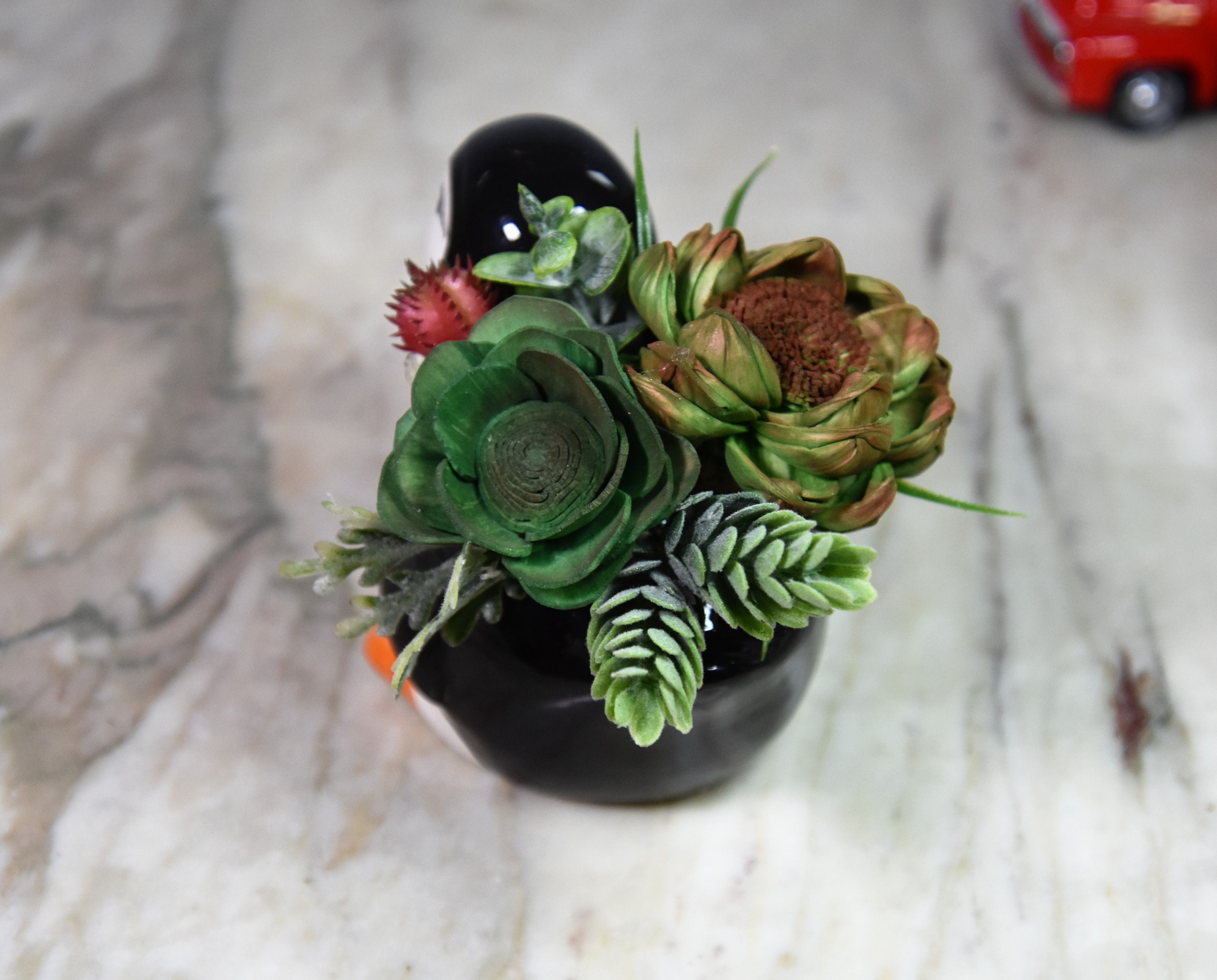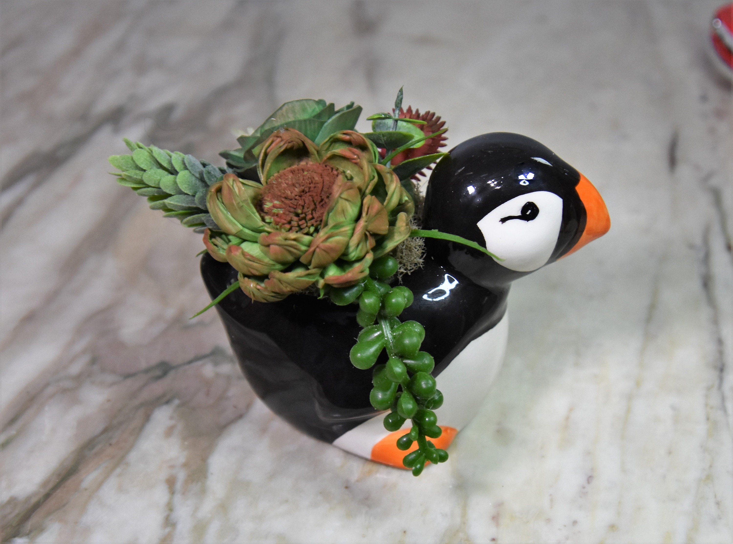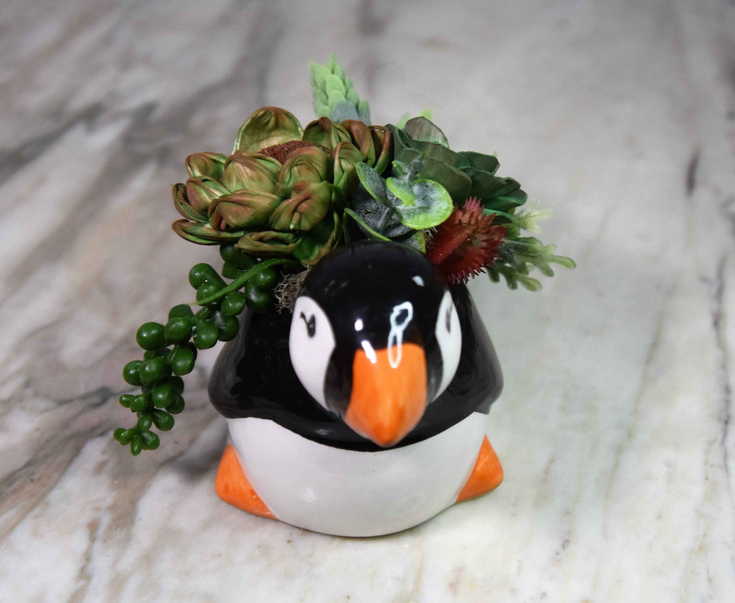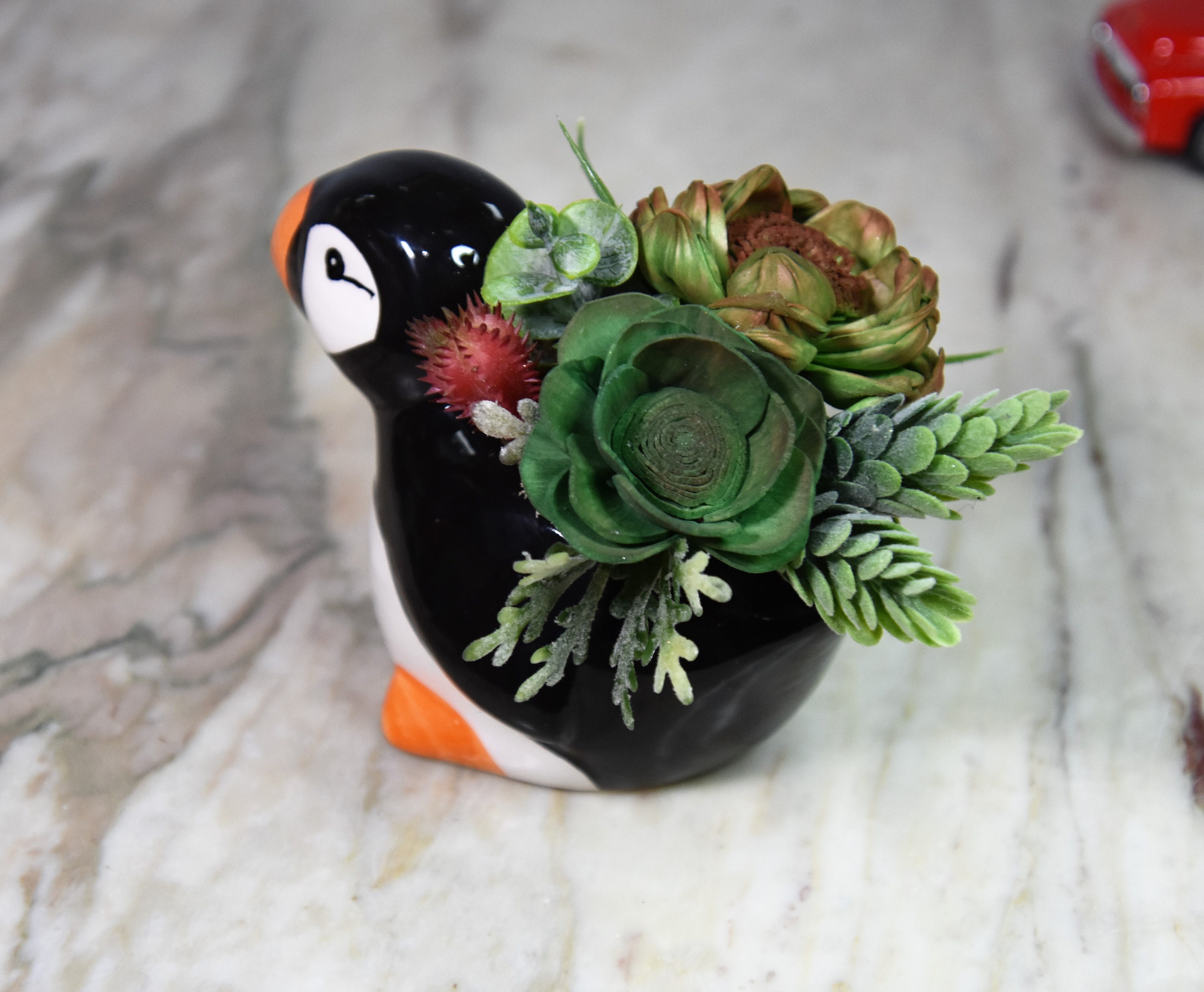 Adorable ceramic penquin planter filled with hand dyed and airbrushed *Sola wood succulents with fillers in reindeer moss.