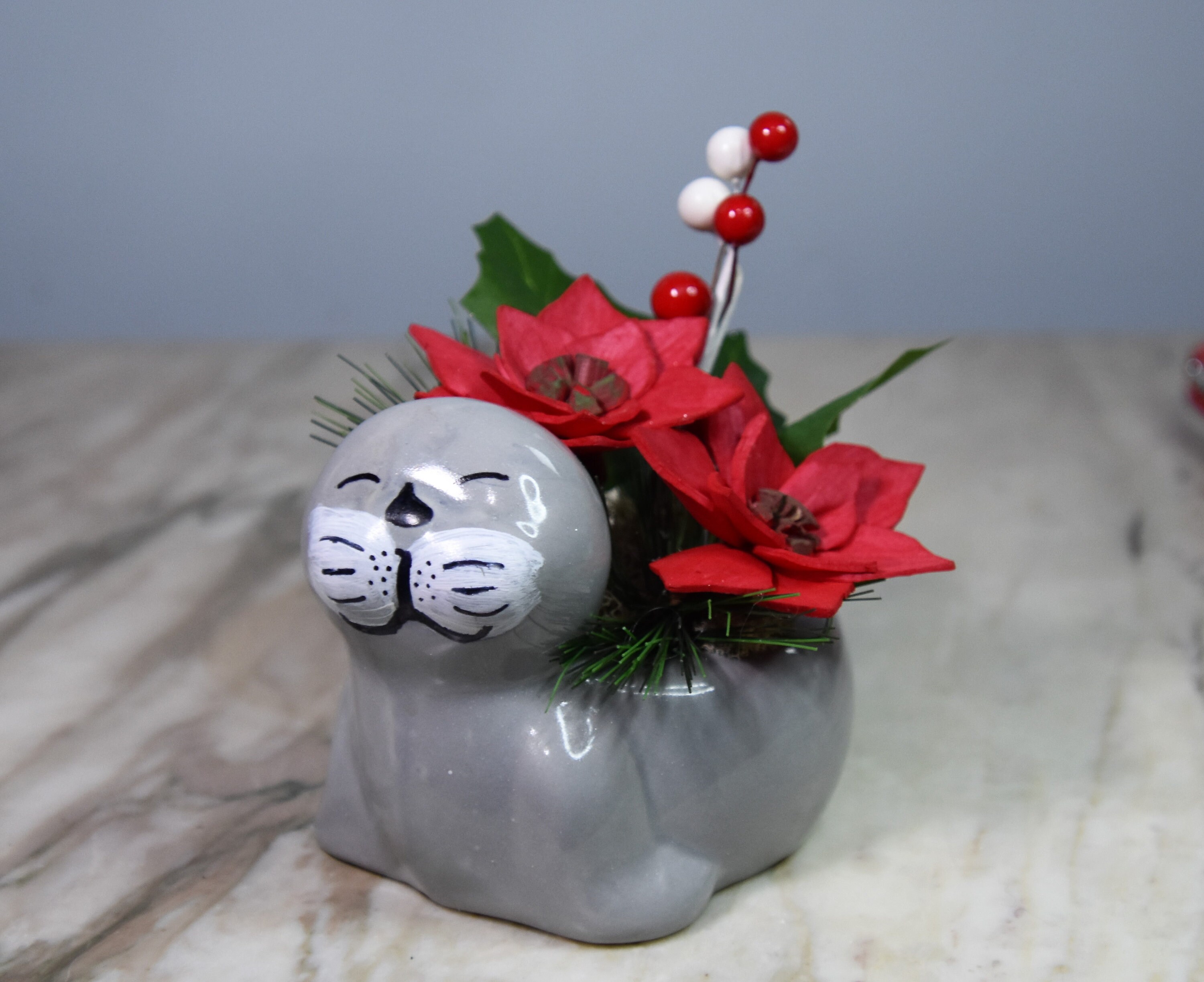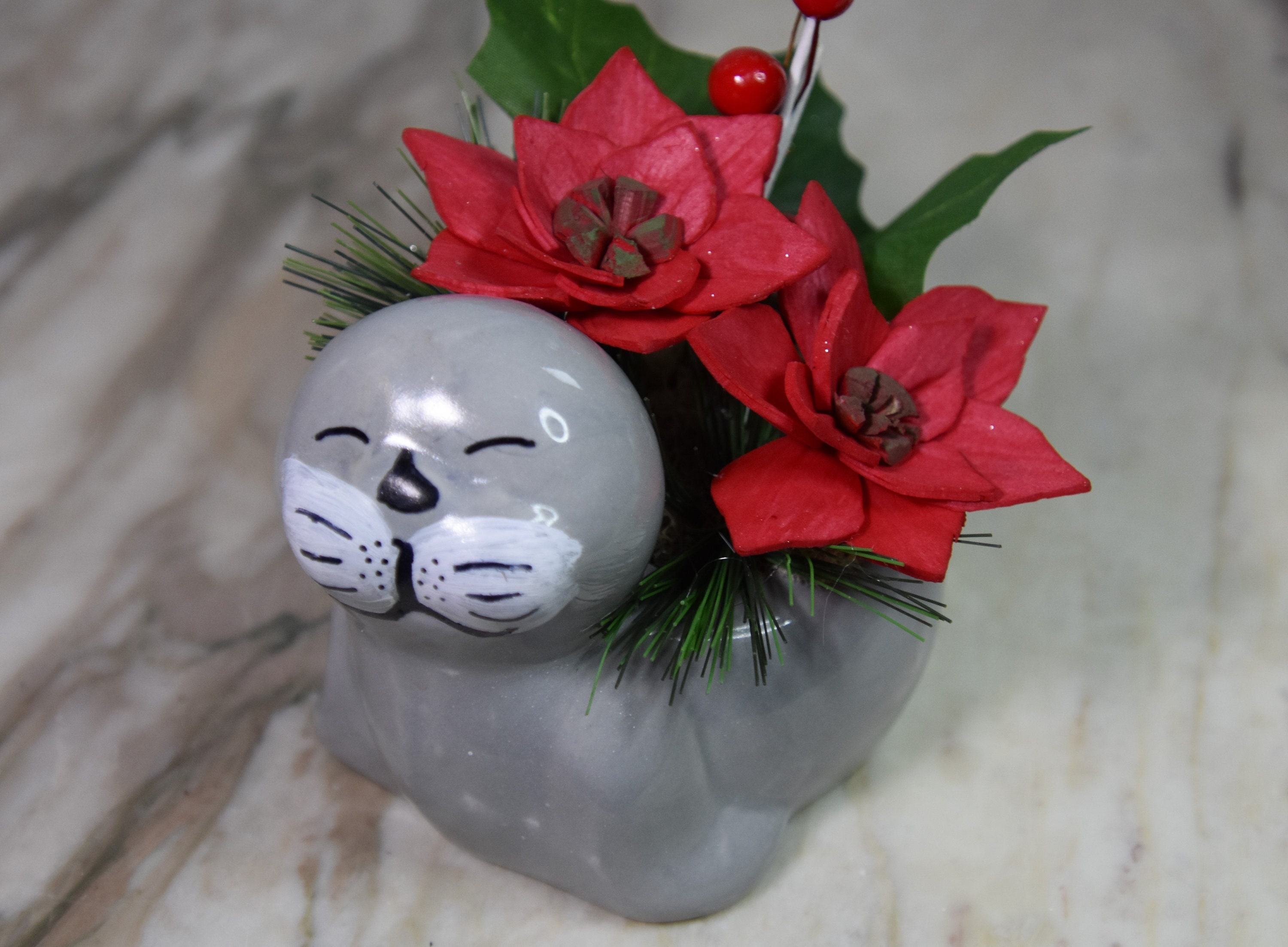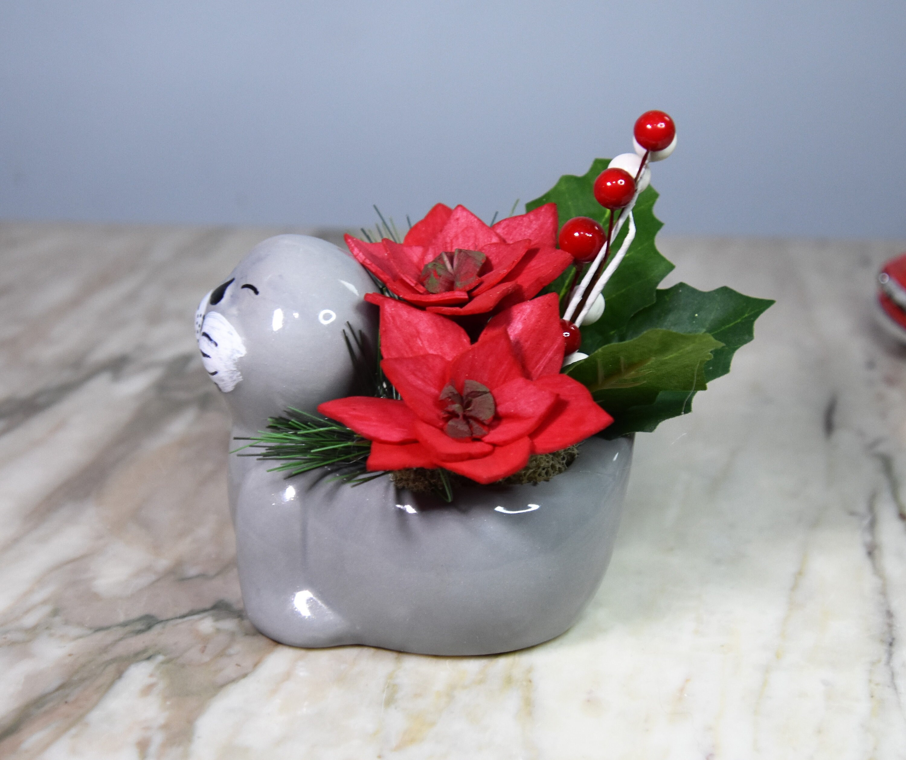 Adorable ceramic walrus planter filled with *Sola wood poinsettia and fillers in reindeer moss.