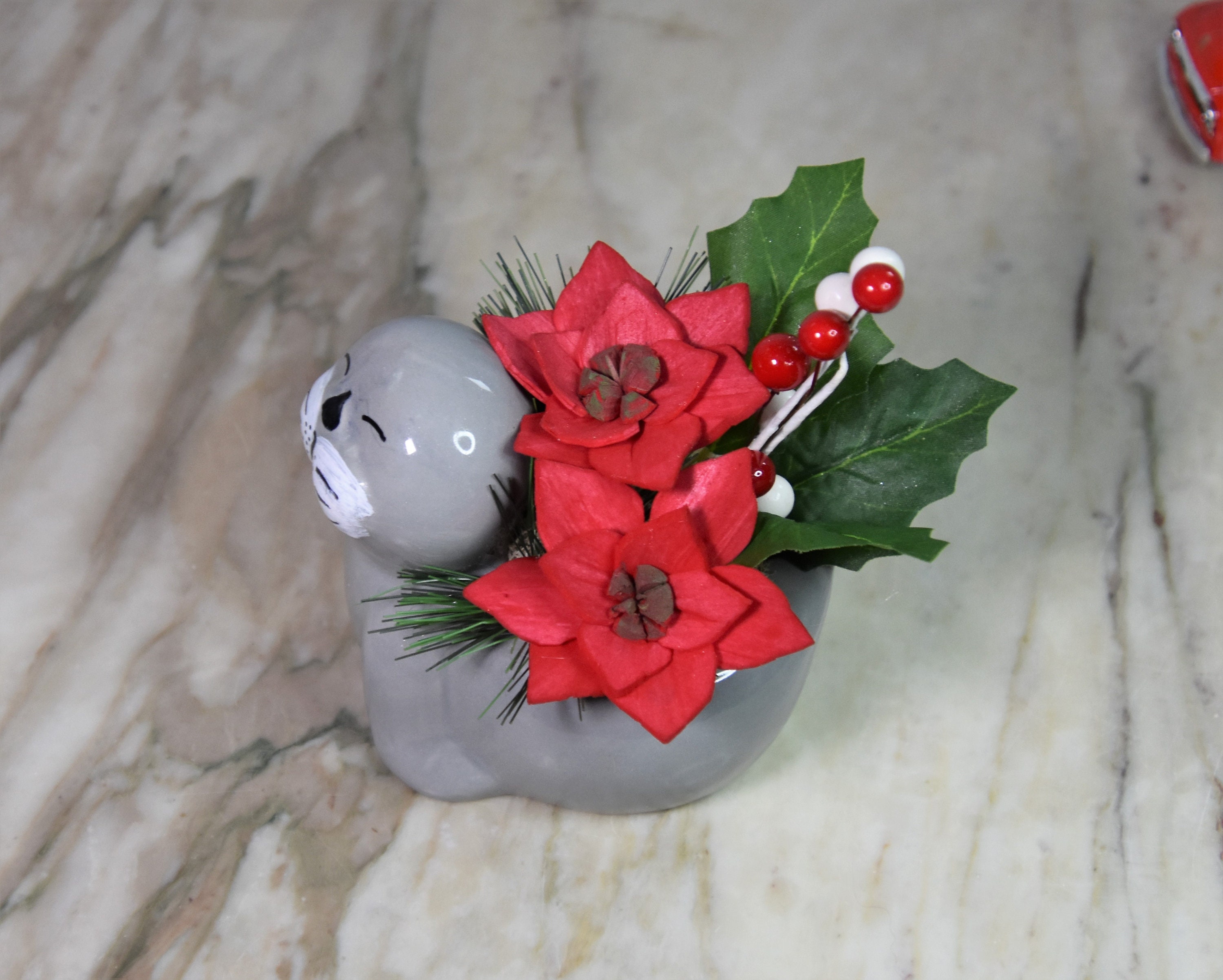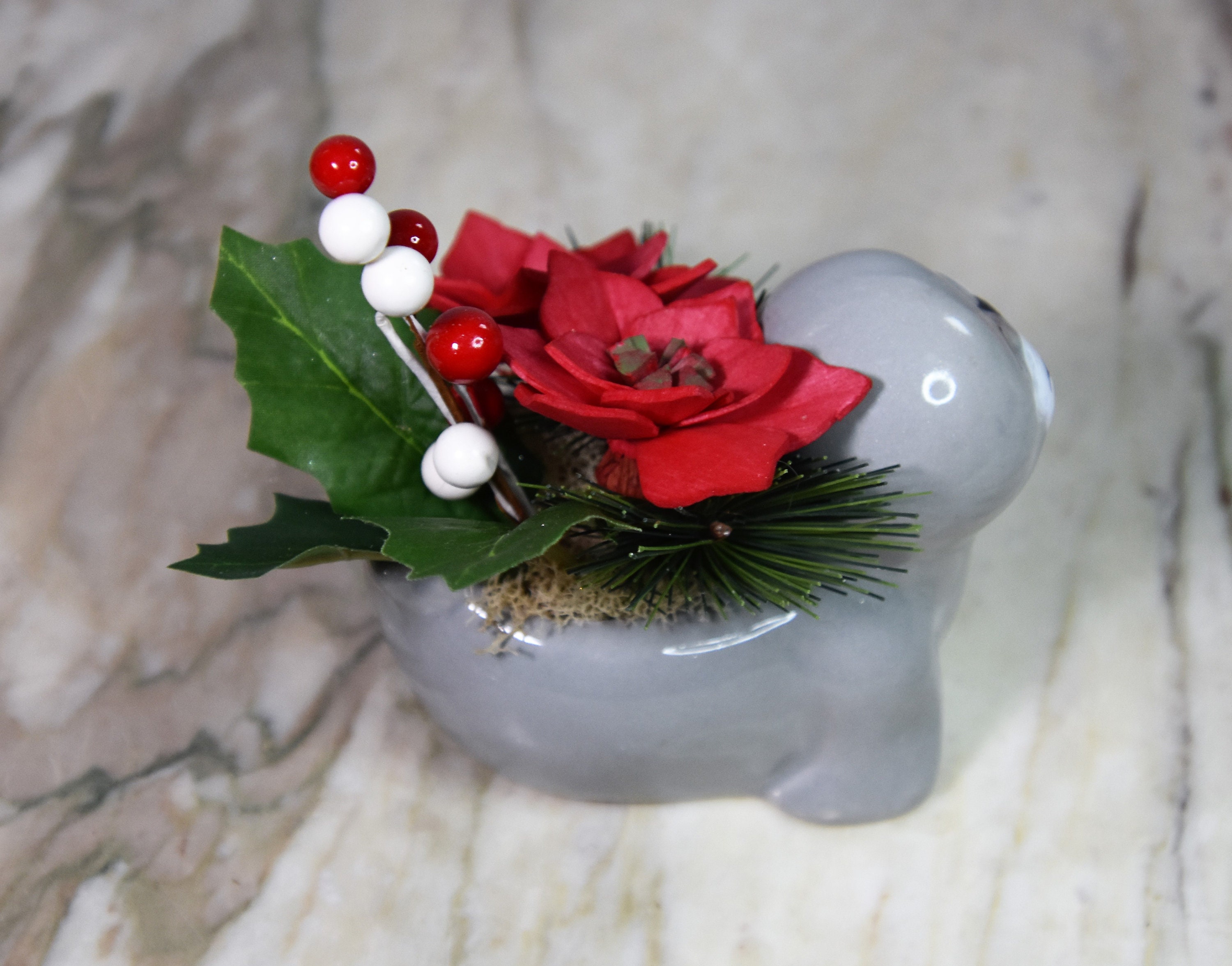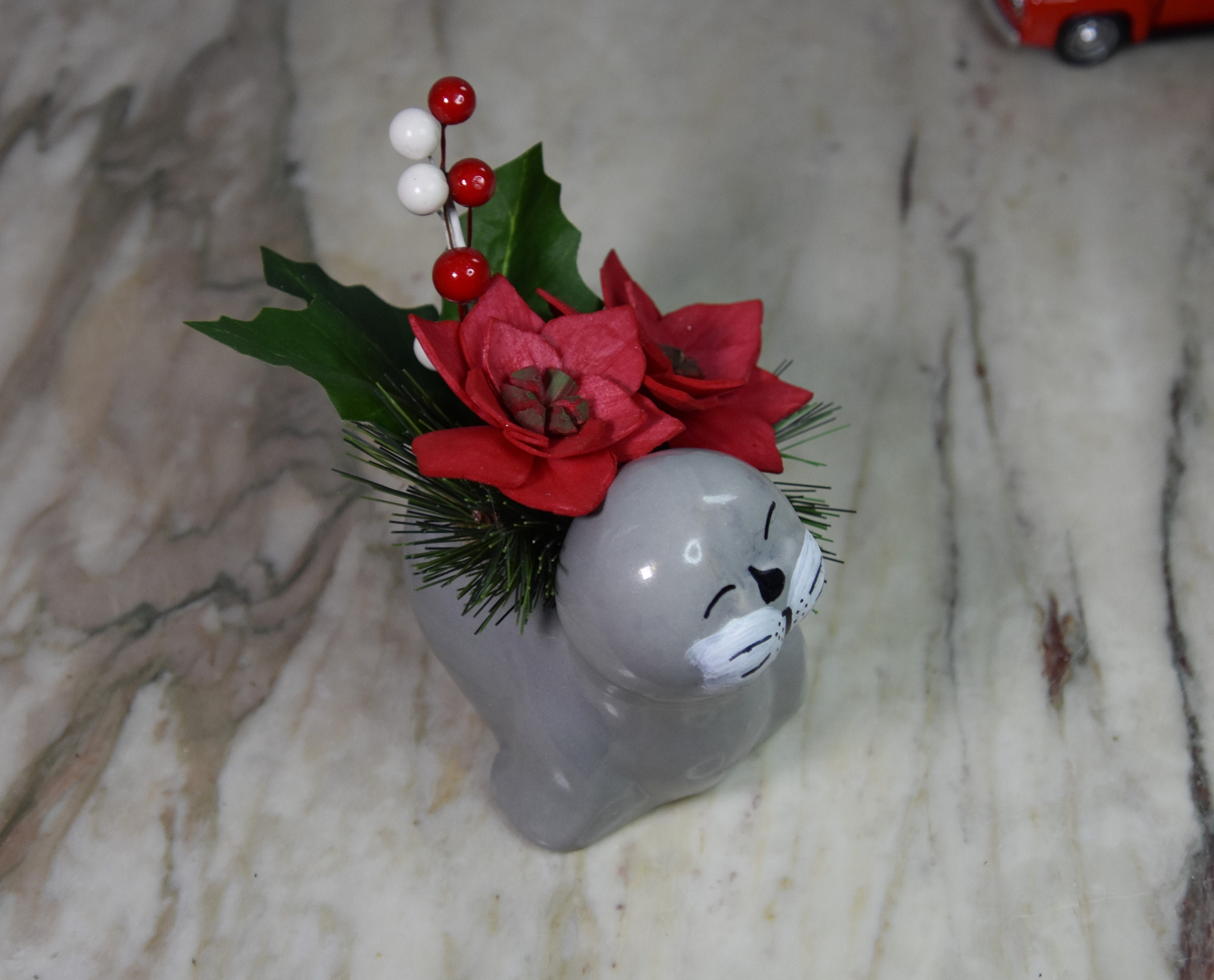 Adorable ceramic walrus planter filled with *Sola wood poinsettia and fillers in reindeer moss.