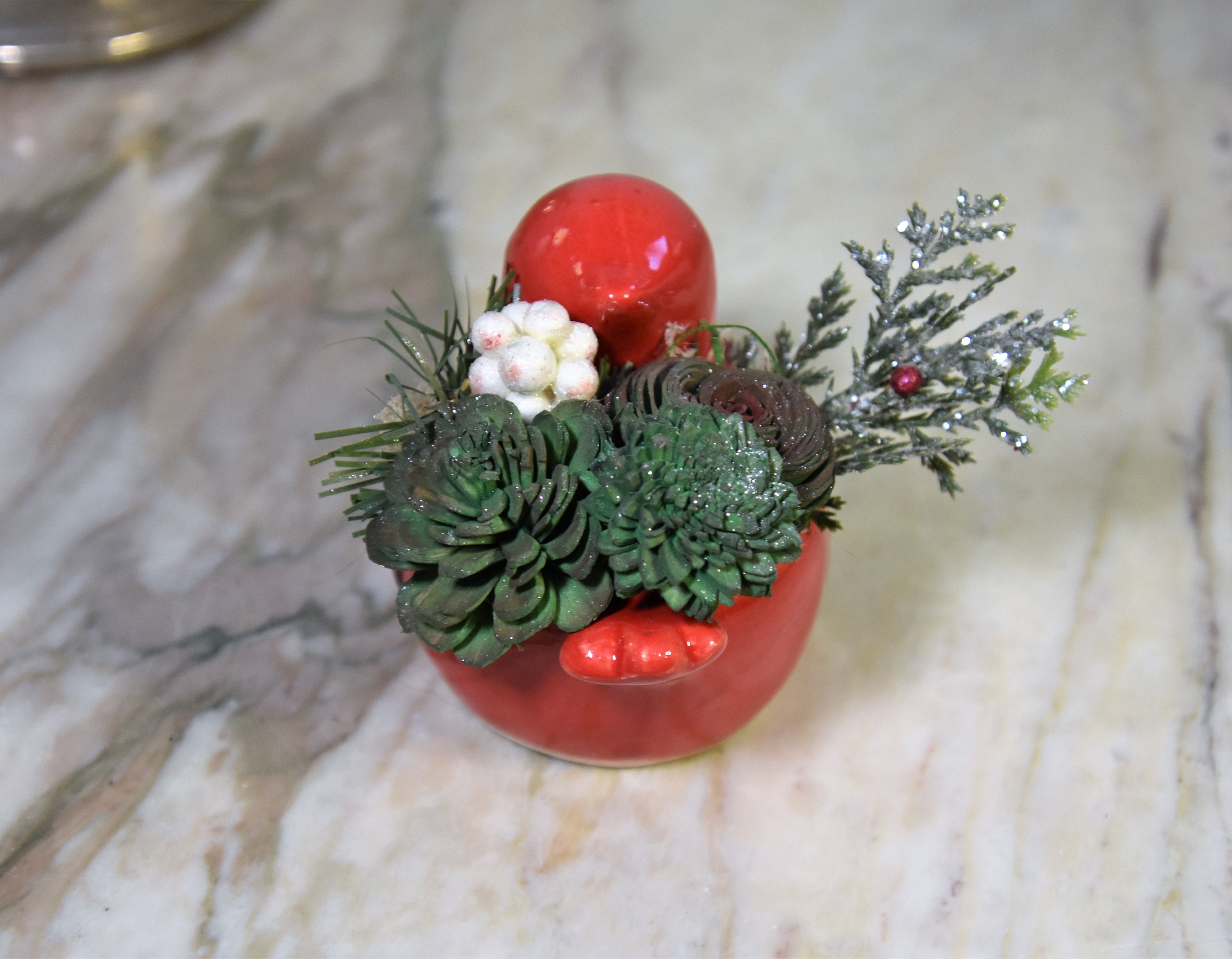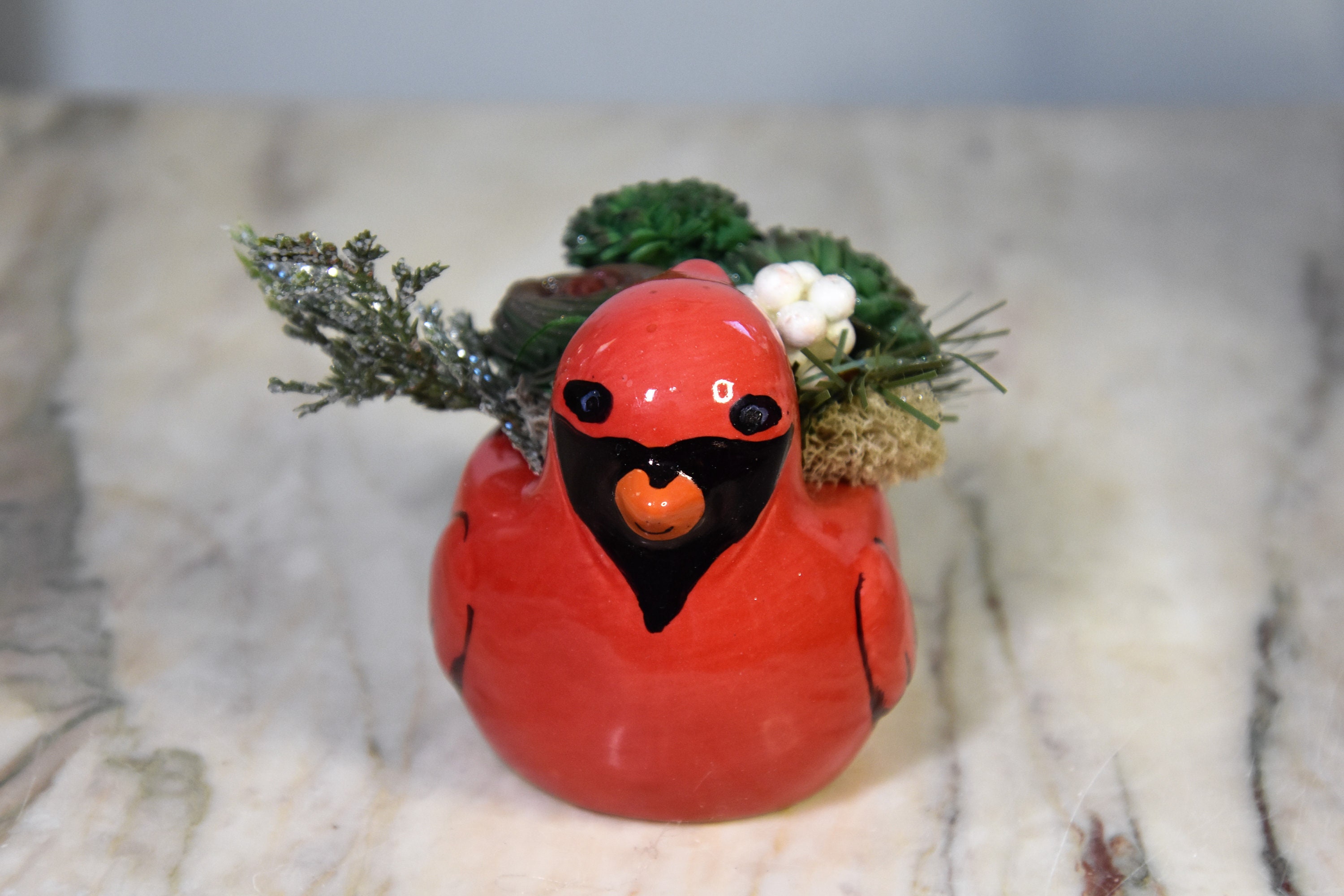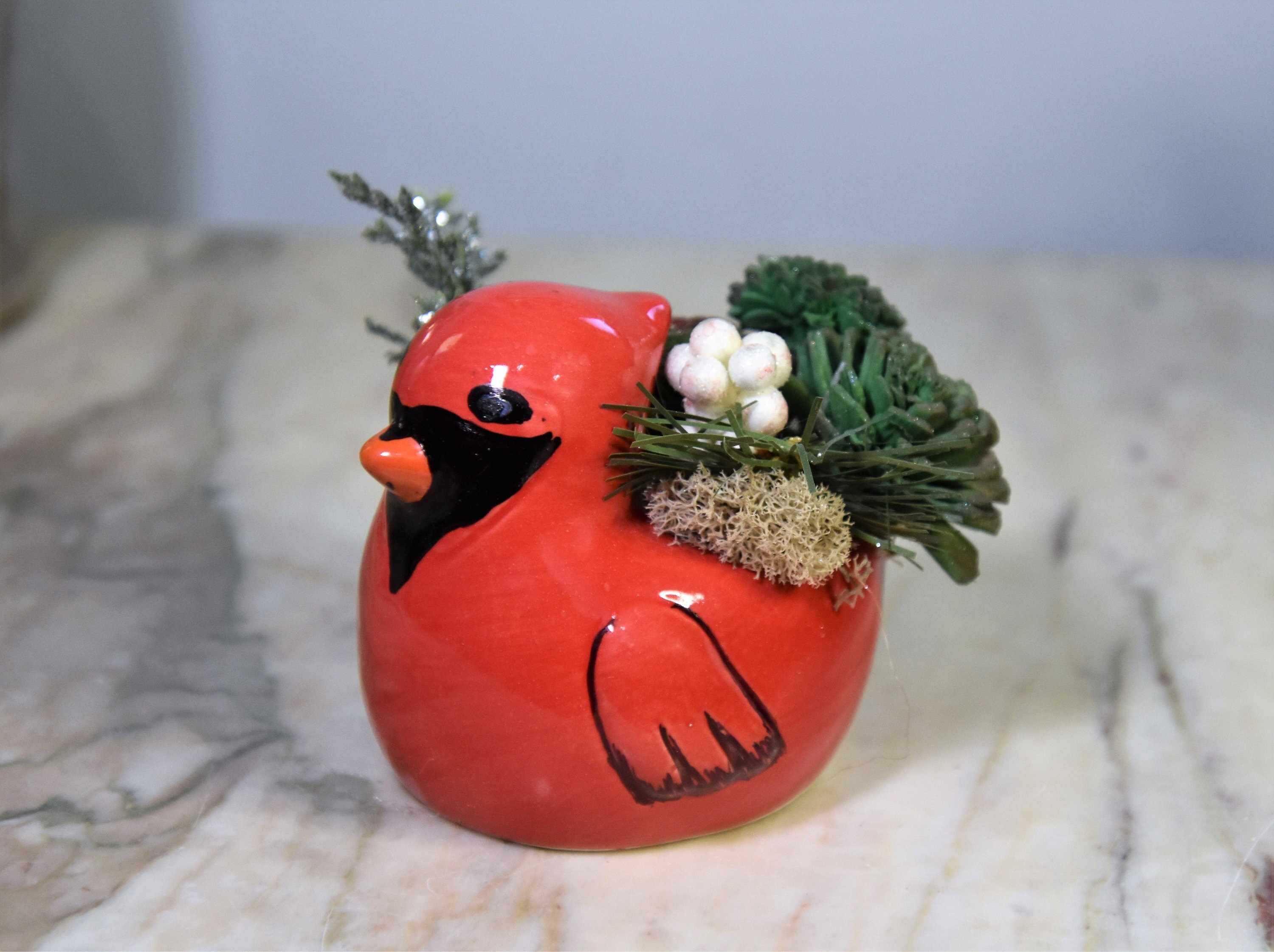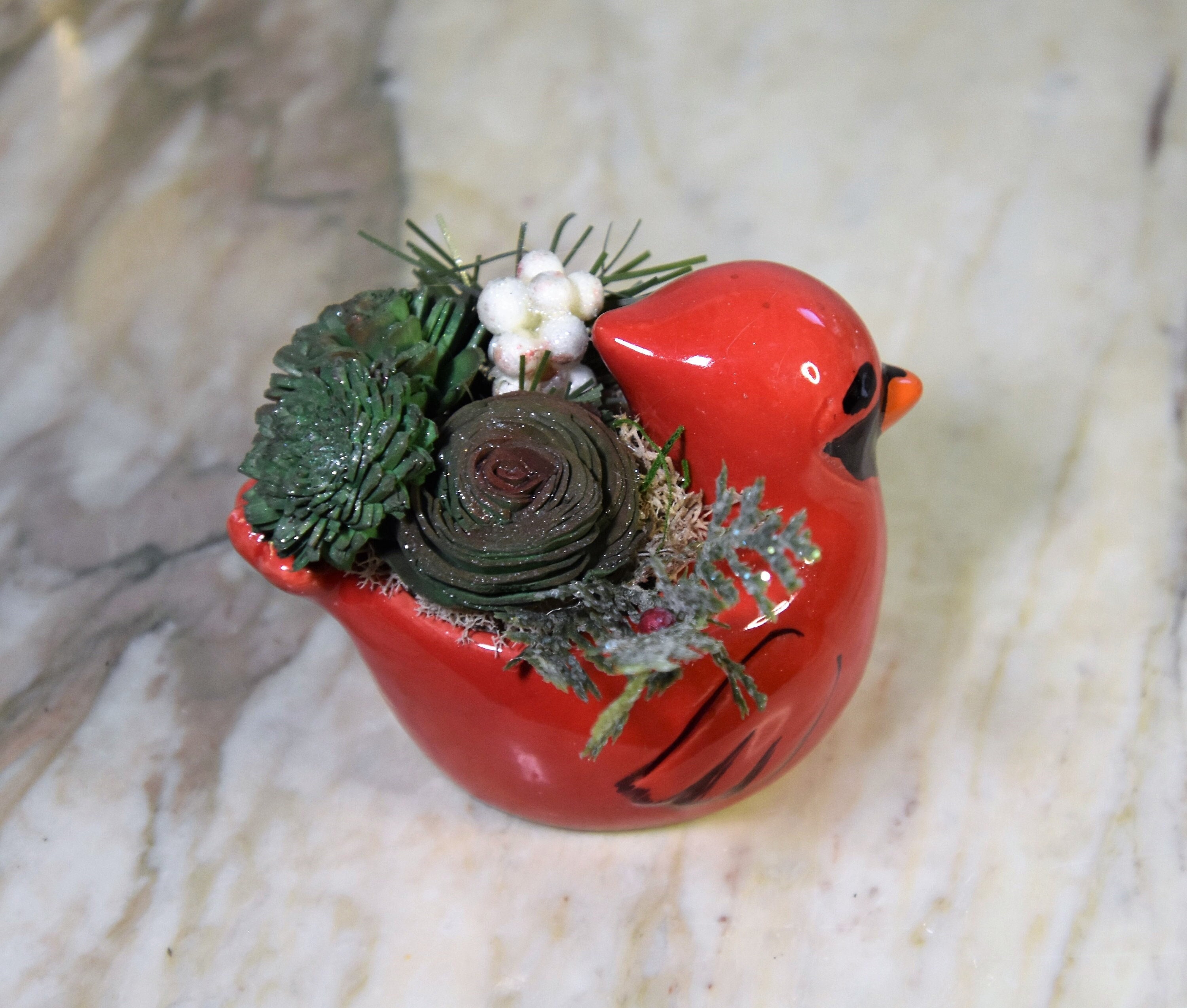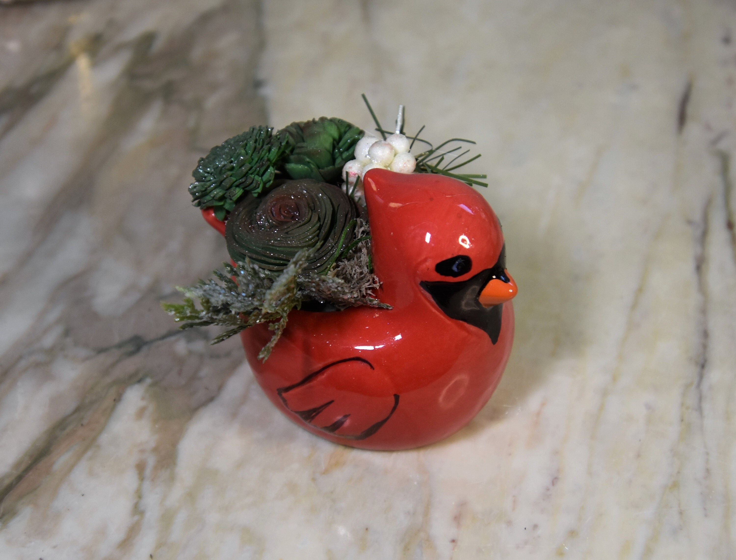 Adorable cardinal planter filled with a hand dyed *Sola wood sparkling succulent, flower and fillers.