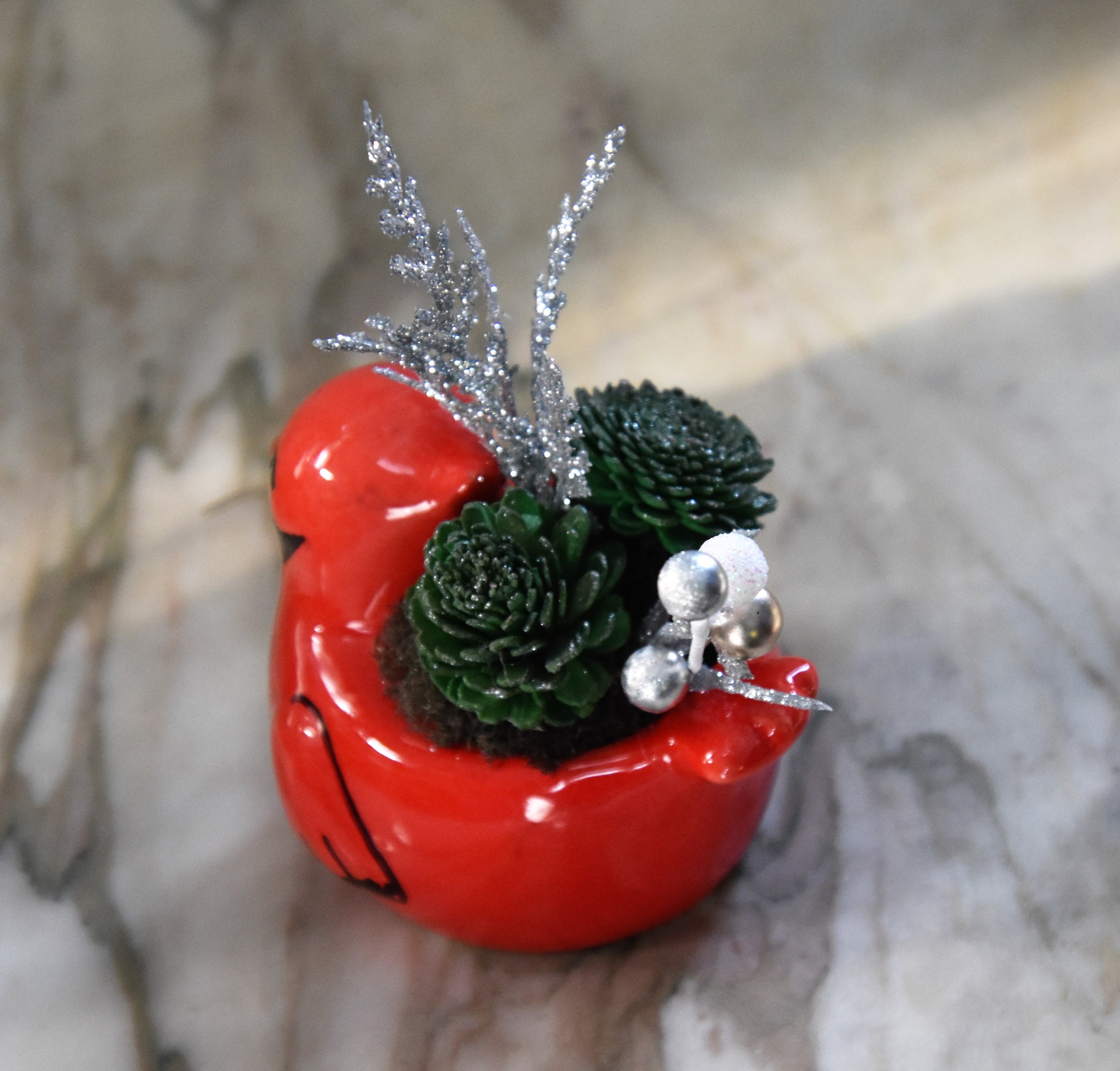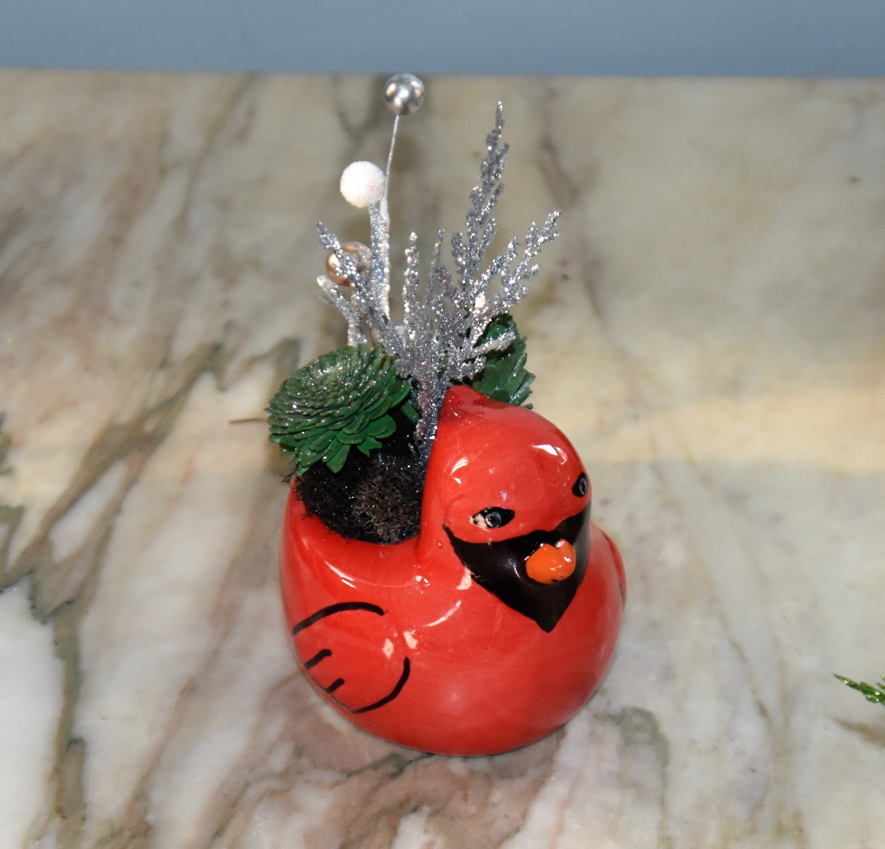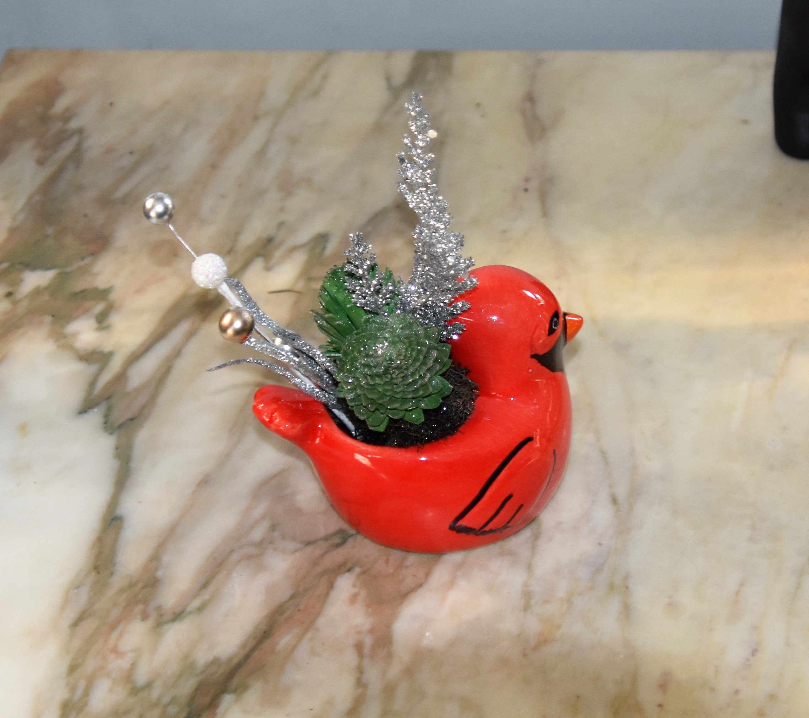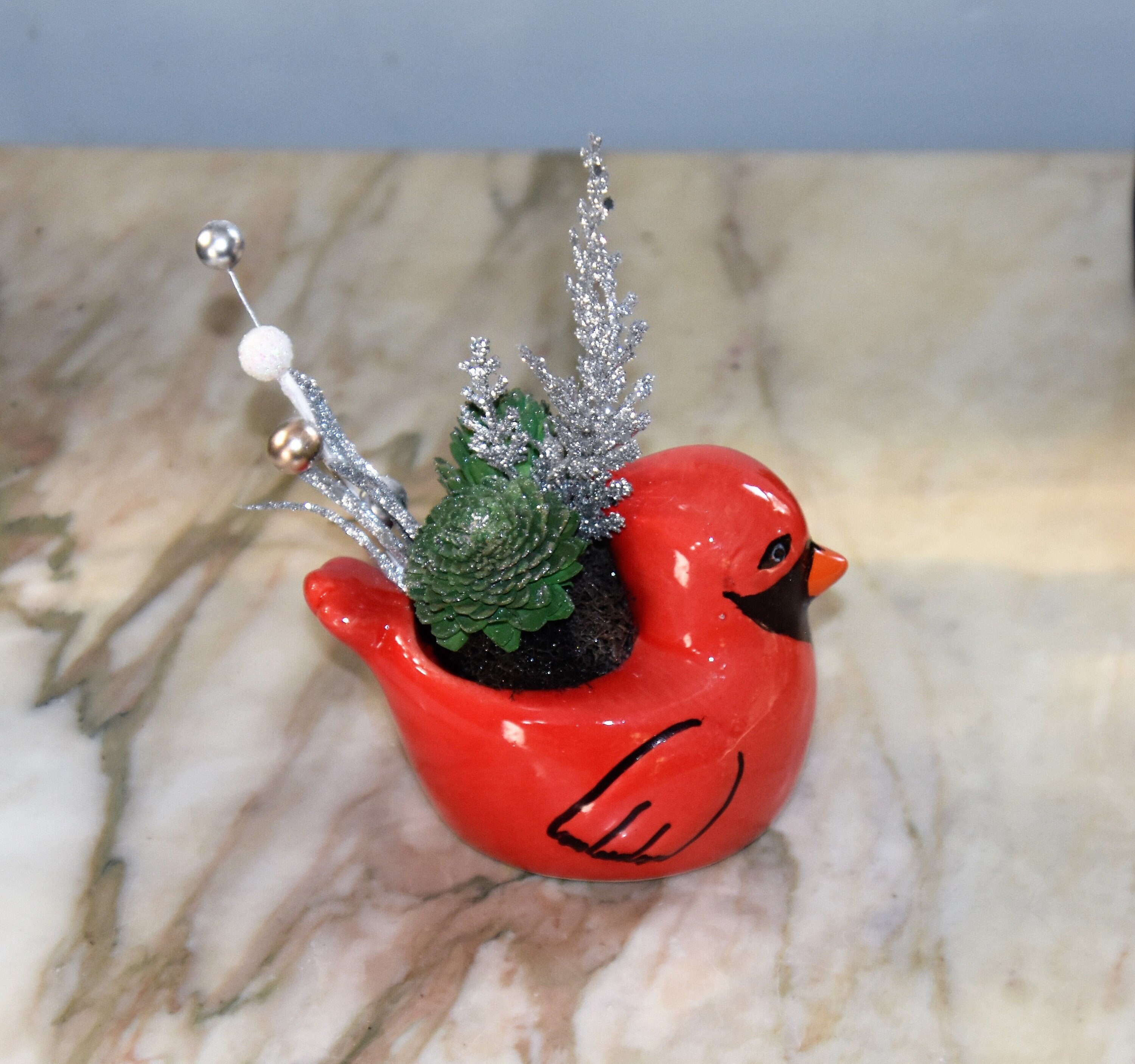 Adorable cardinal planter filled with a hand dyed *Sola wood sparkling succulents and fillers.