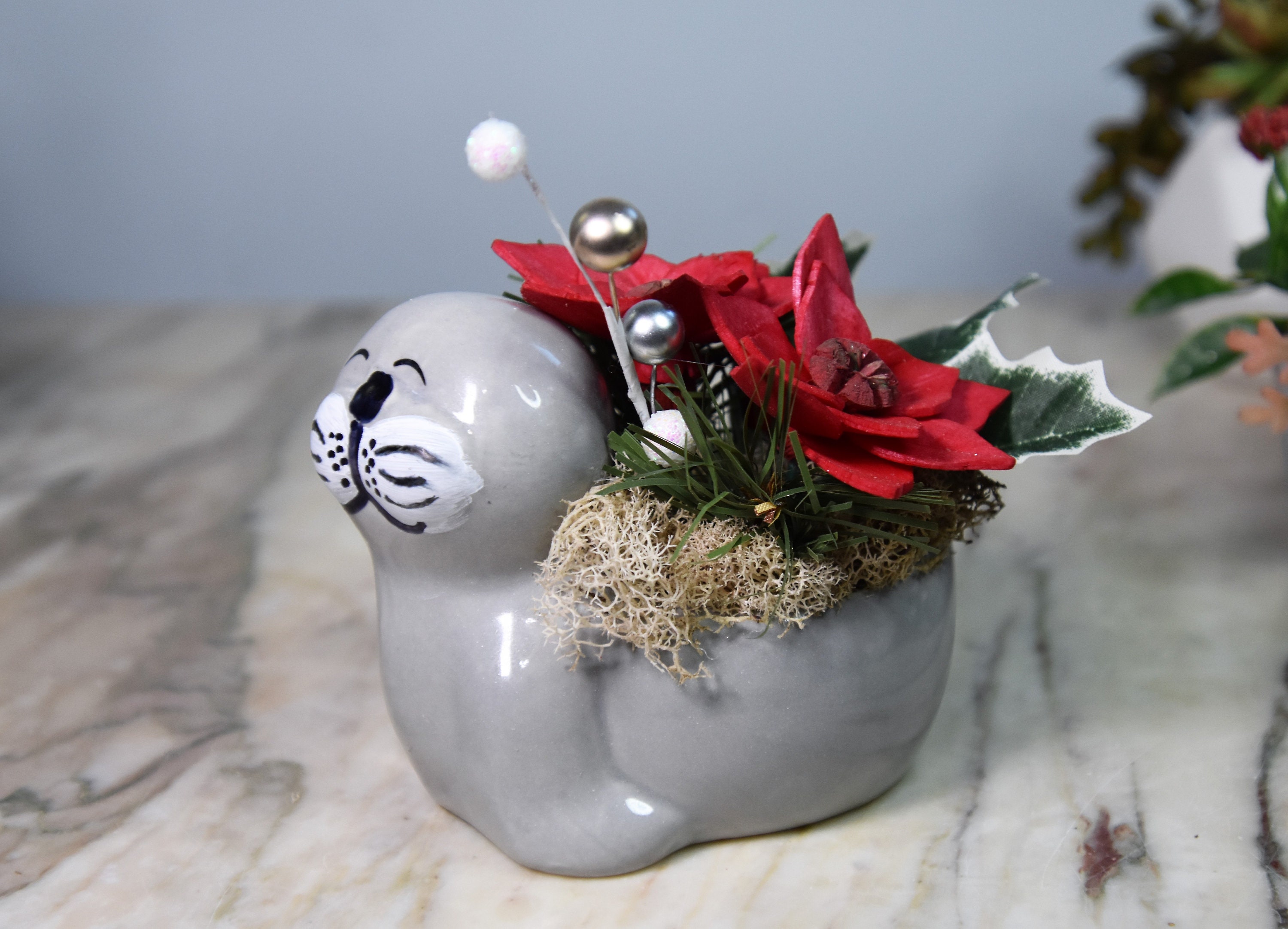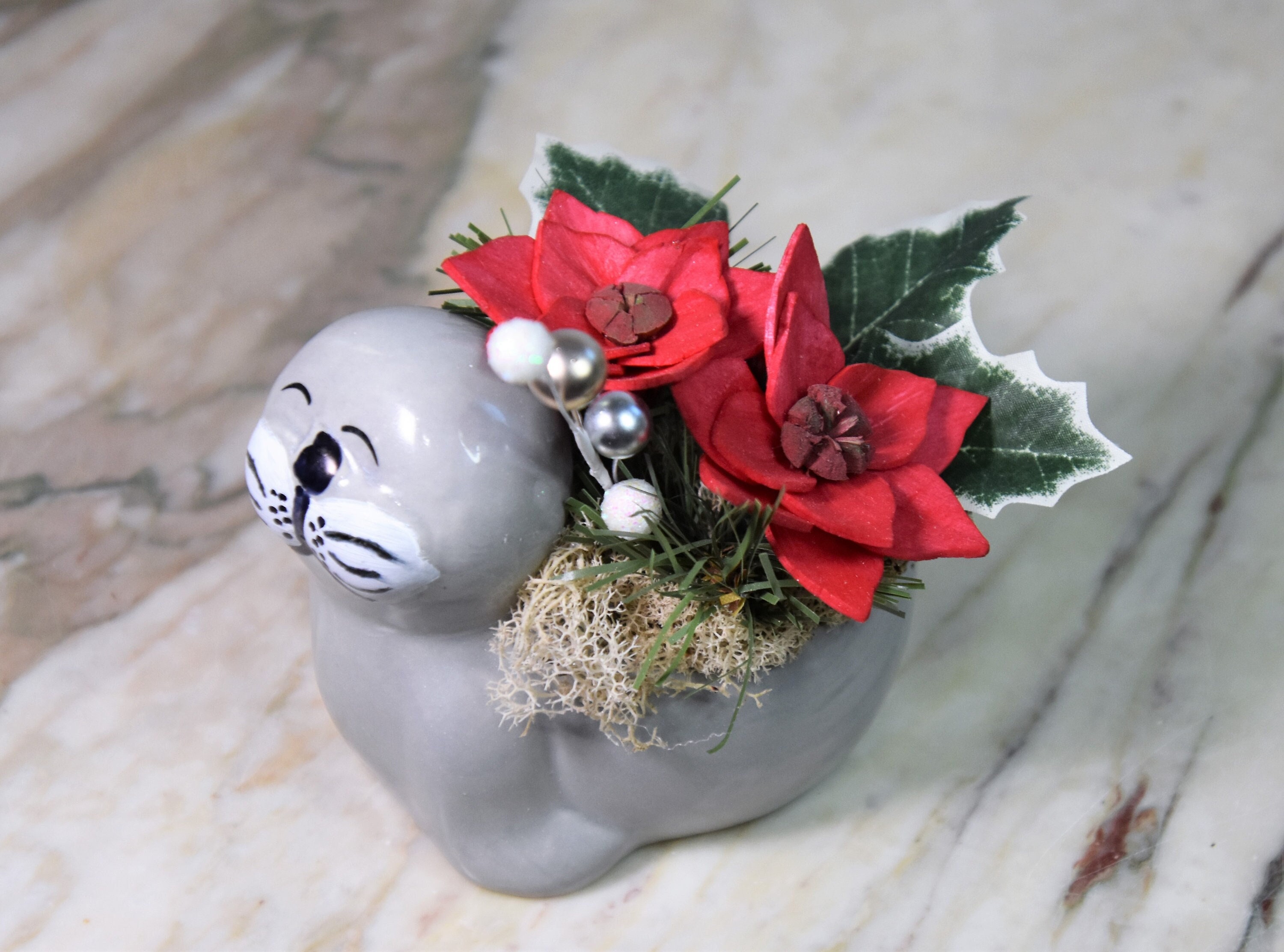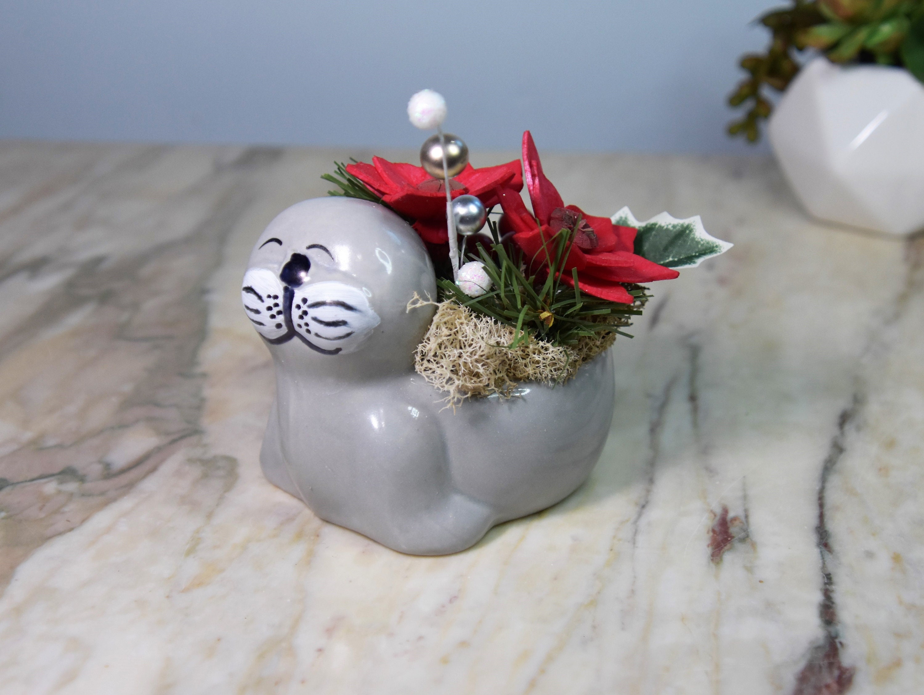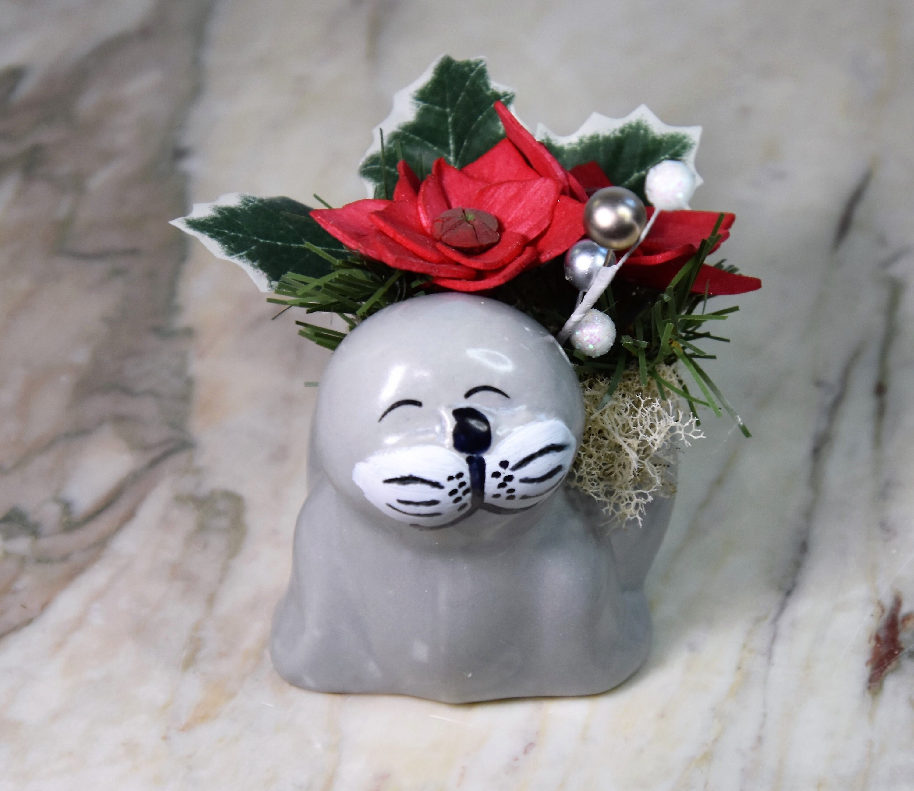 Adorable ceramic walrus planter filled with *Sola wood poinsettia and fillers in reindeer moss.