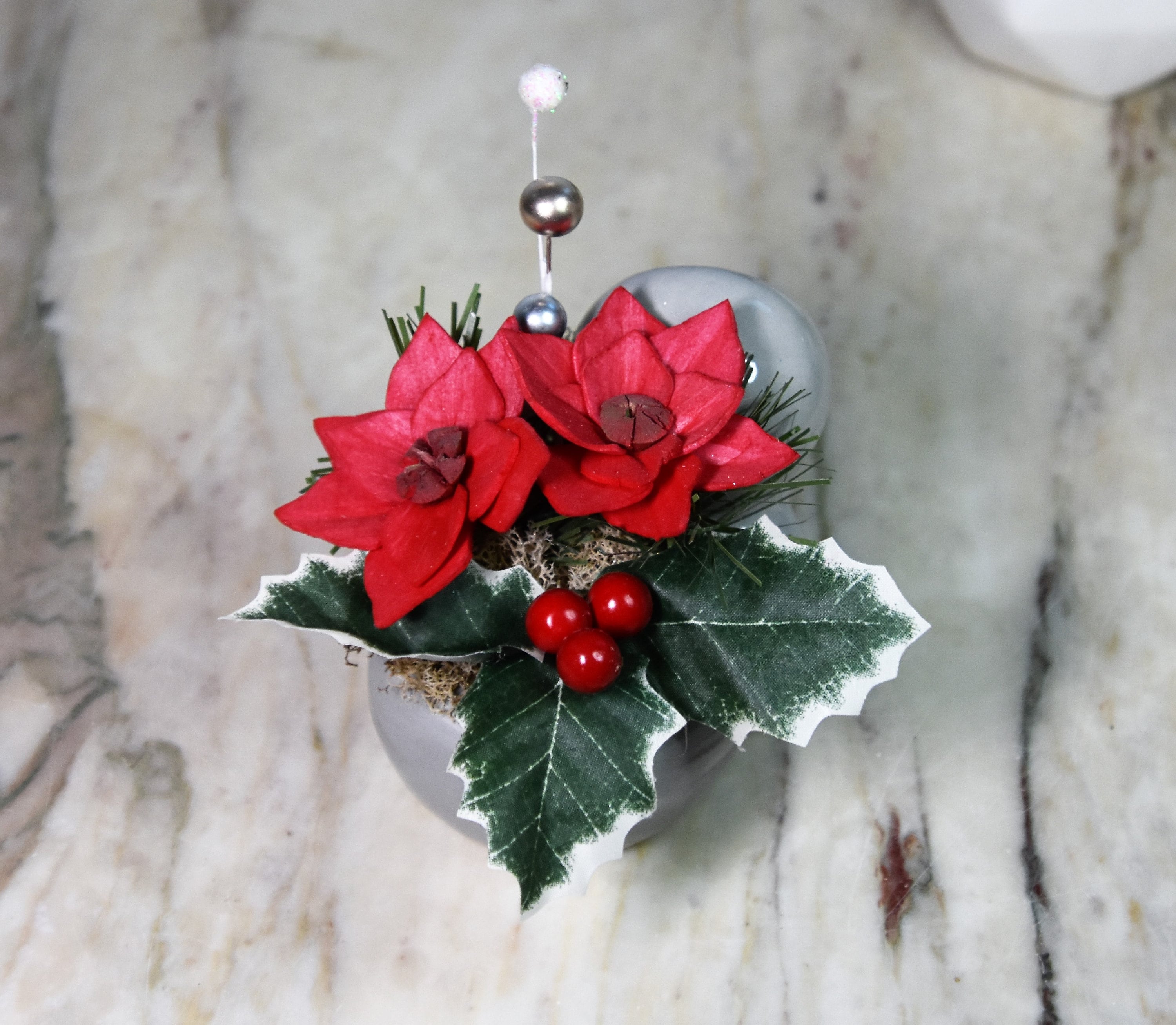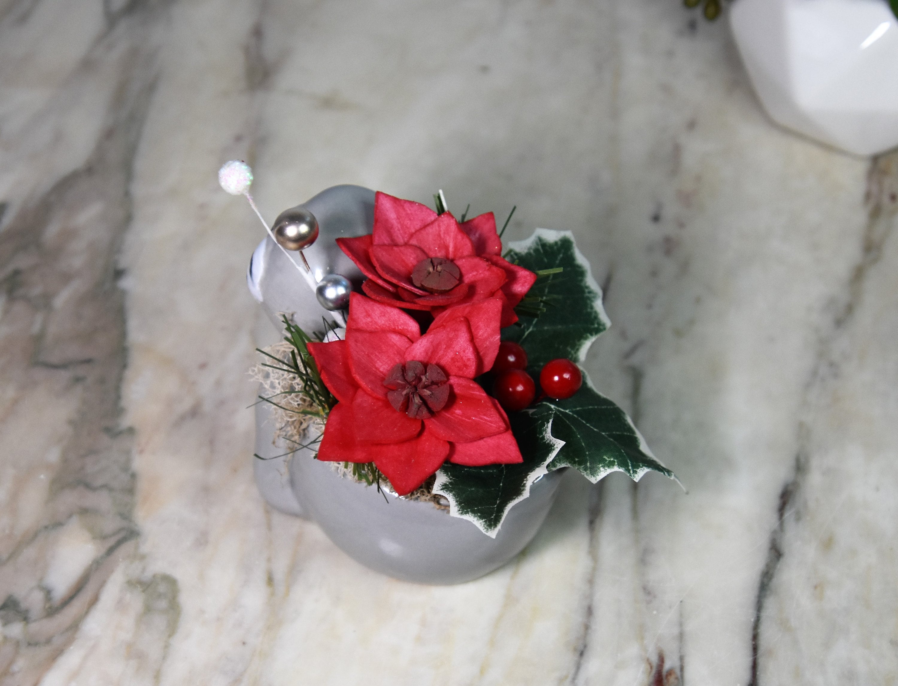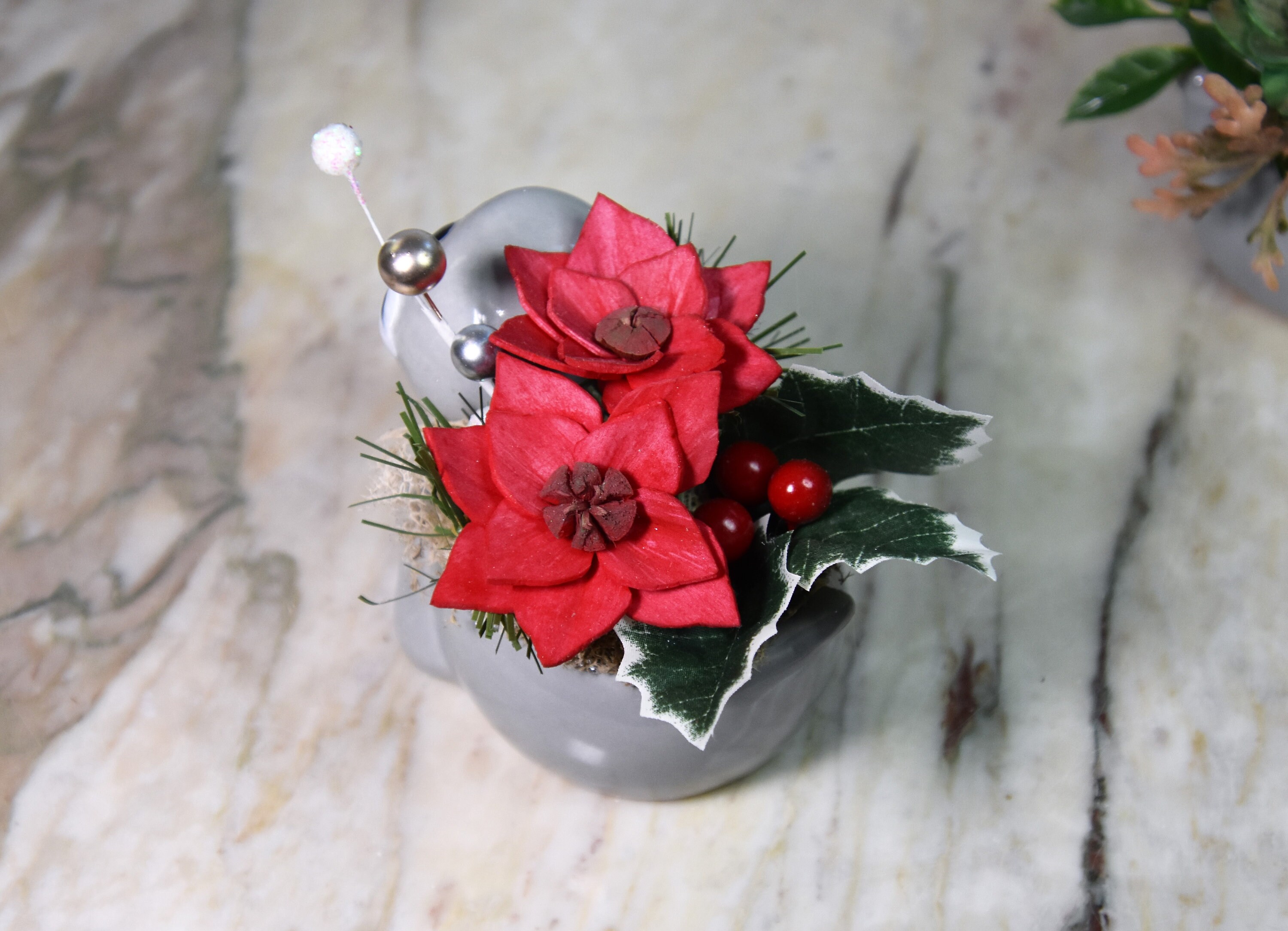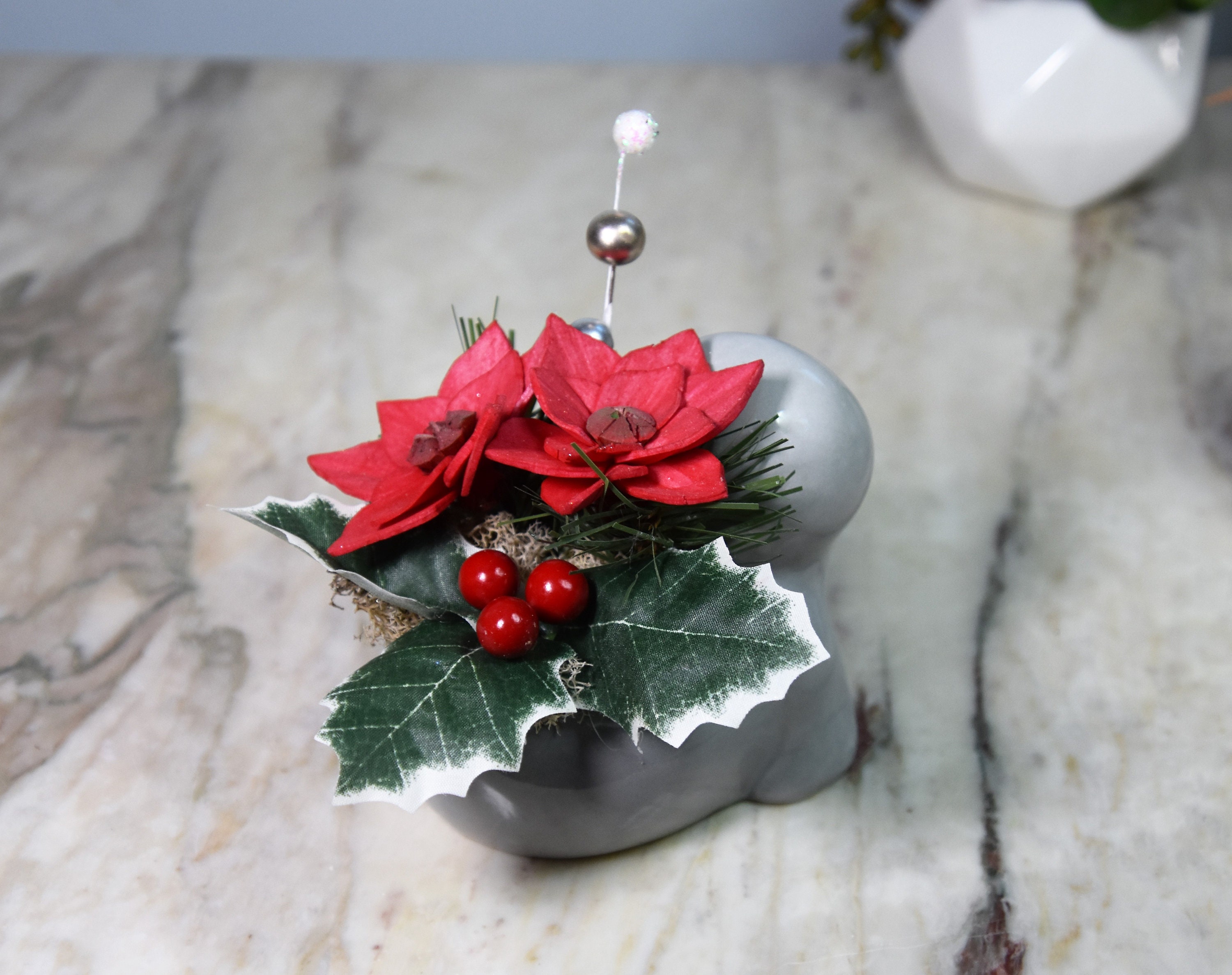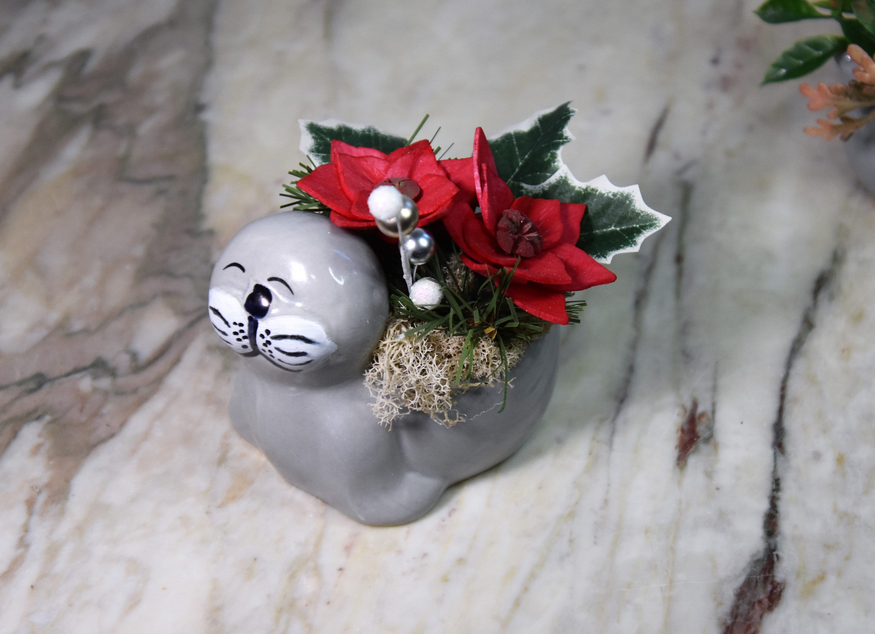 Adorable ceramic walrus planter filled with *Sola wood poinsettia and fillers in reindeer moss.