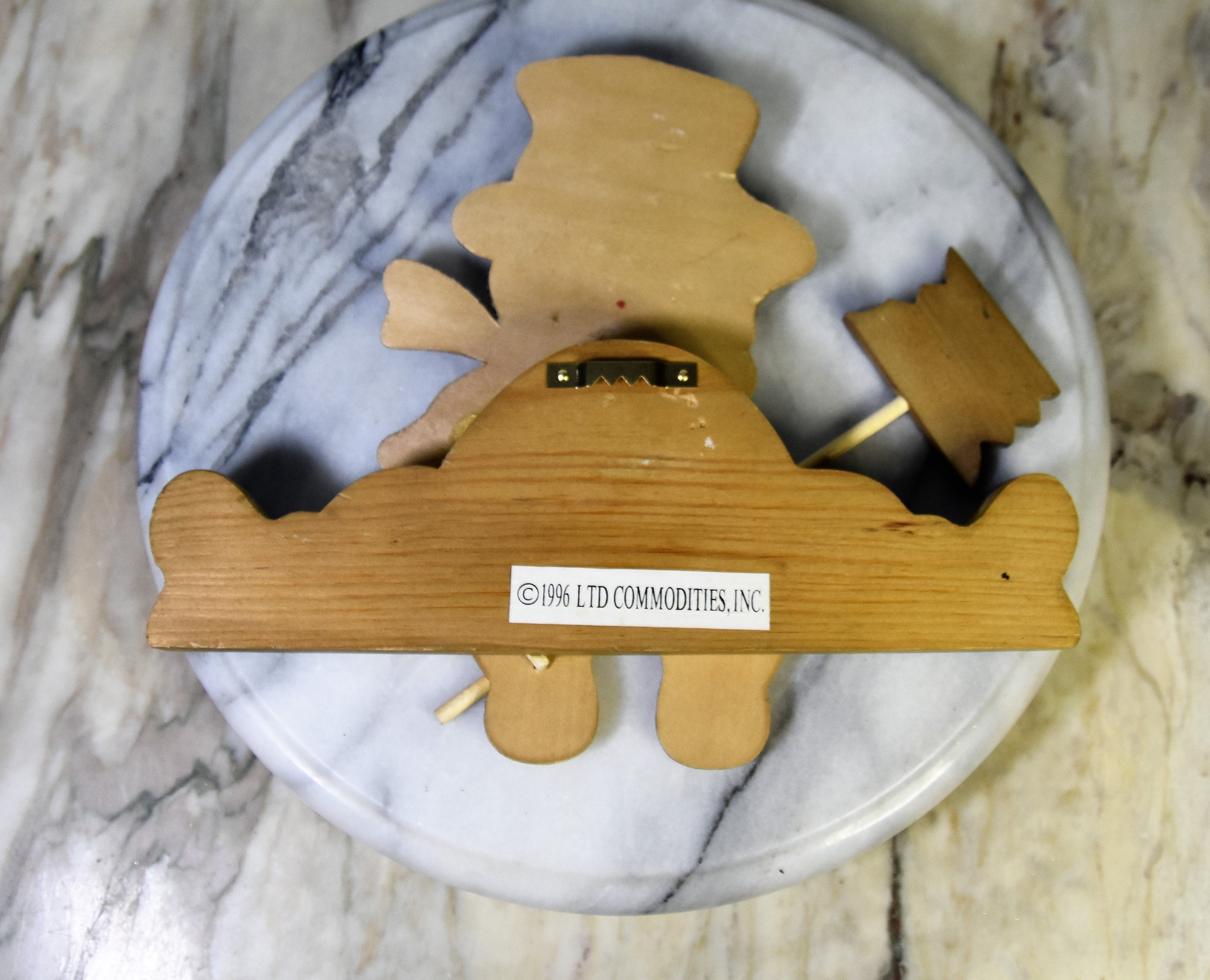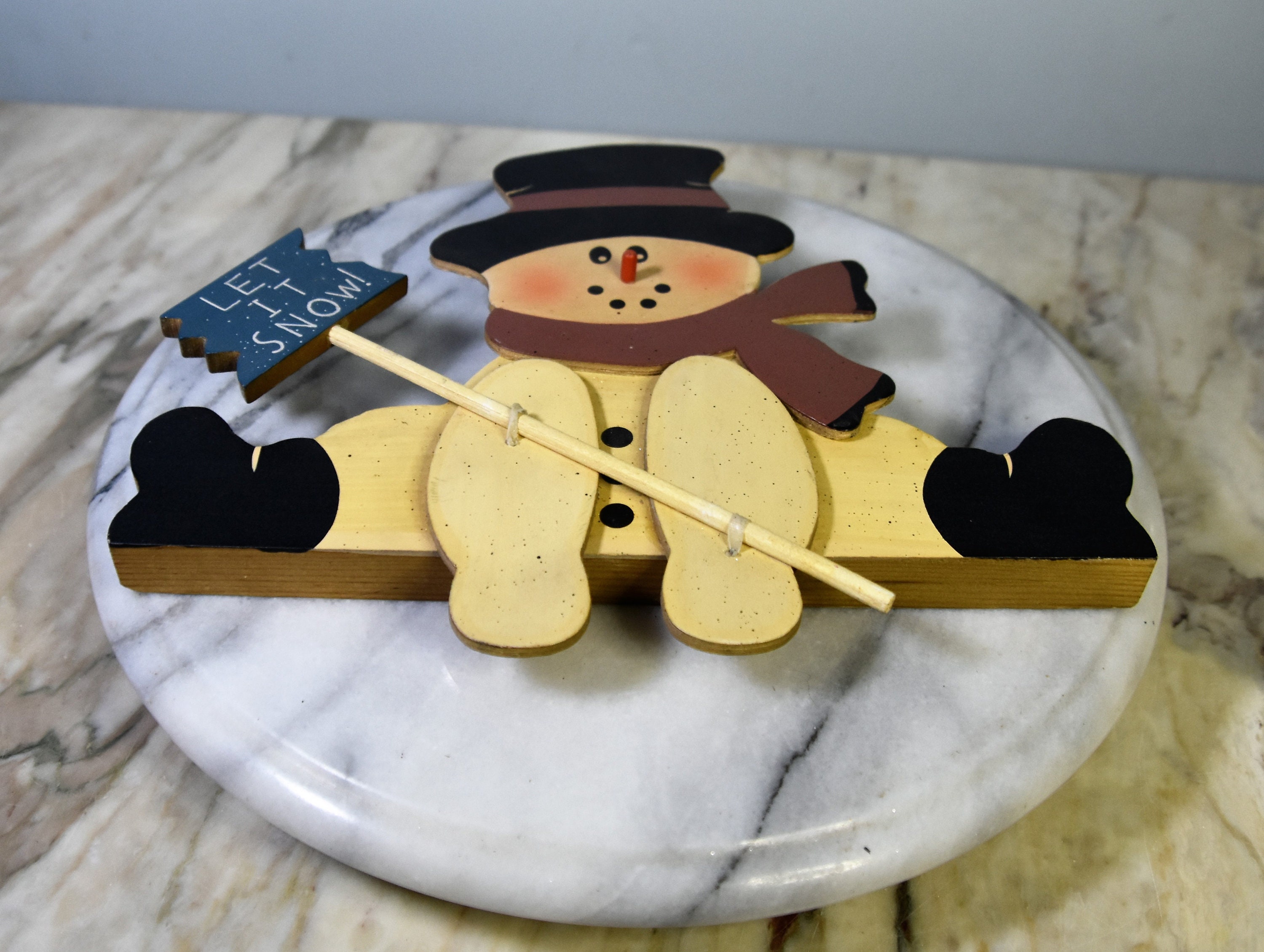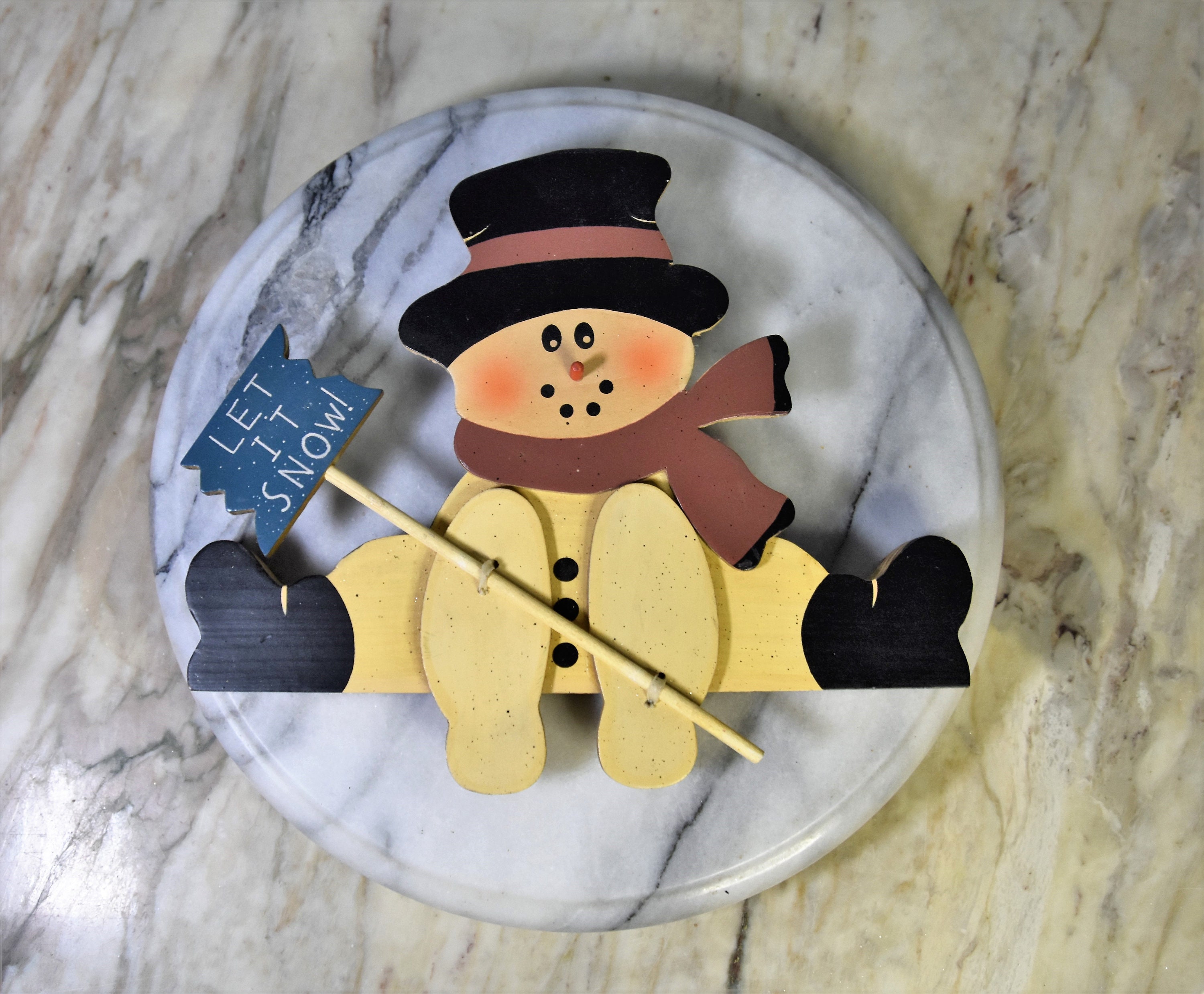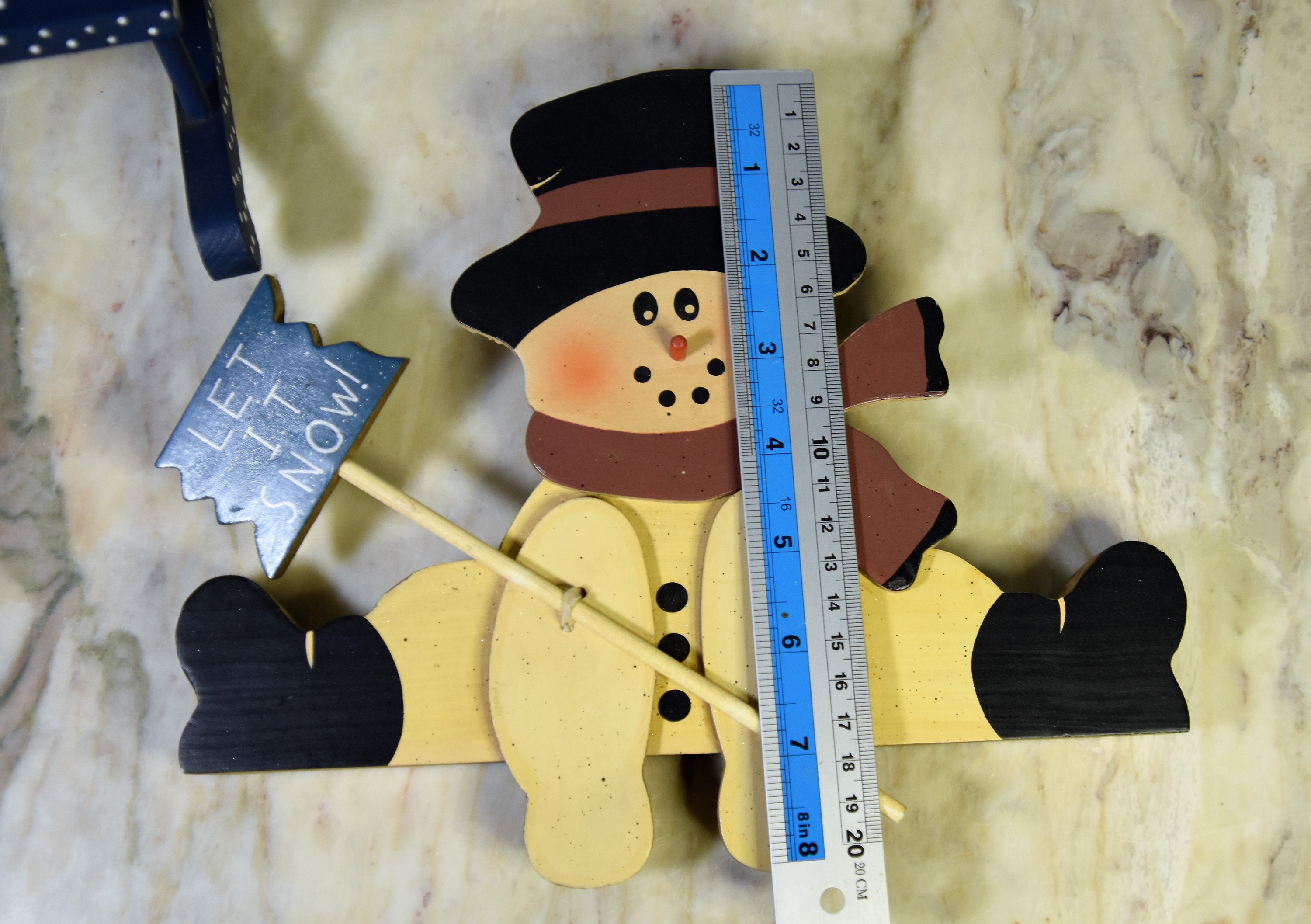-All wood wall hanging base is 3/4 thick with hanger in middle - painted snow man doing a split holding a "LET IT SNOW" sign. The back still has a sticker with the manufacturer and date "1996." Hanging is 10" long at longest point and 8" tall.