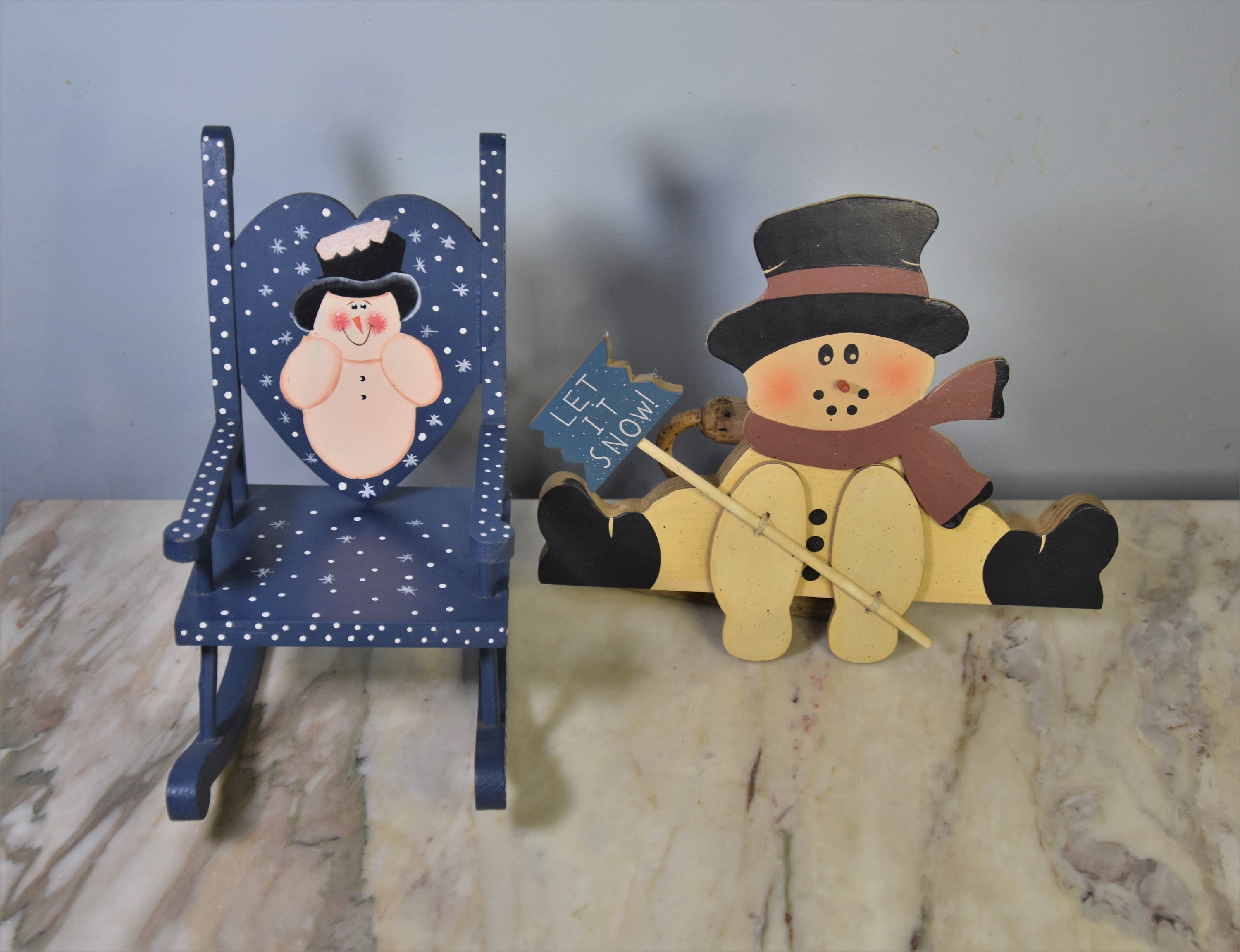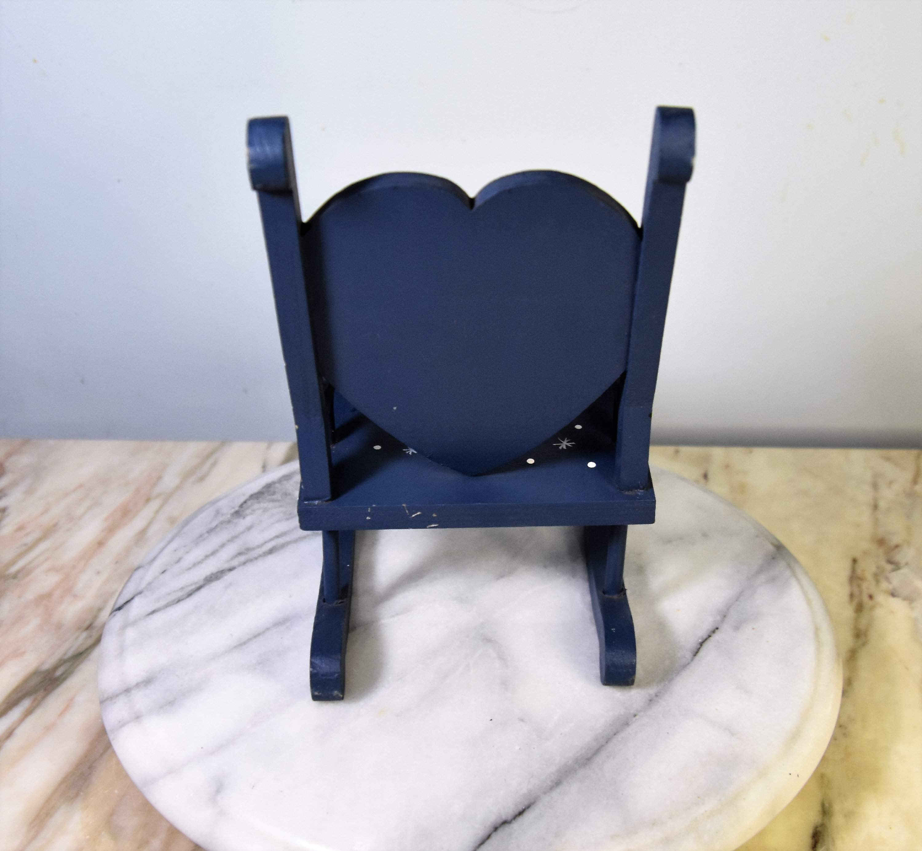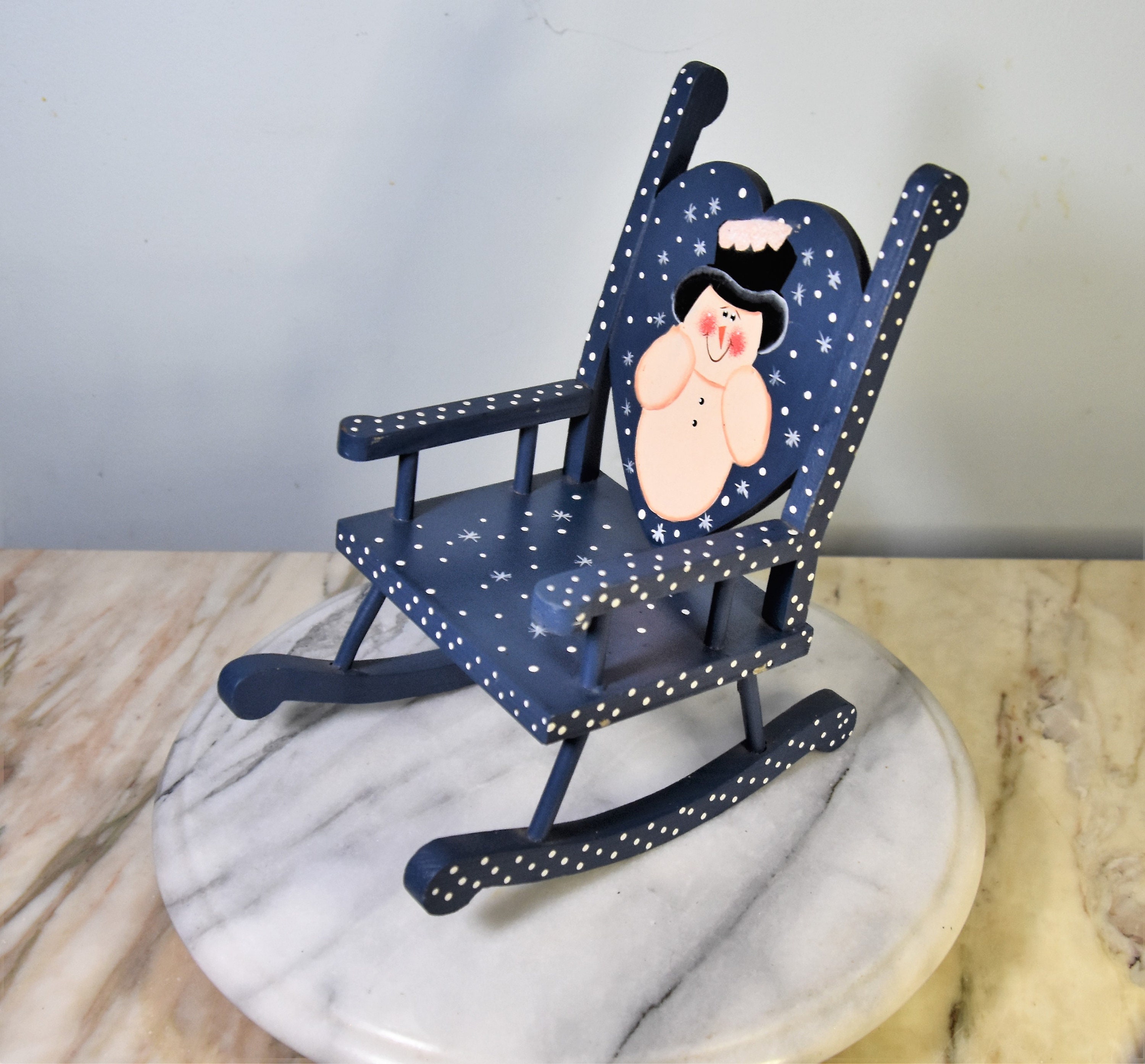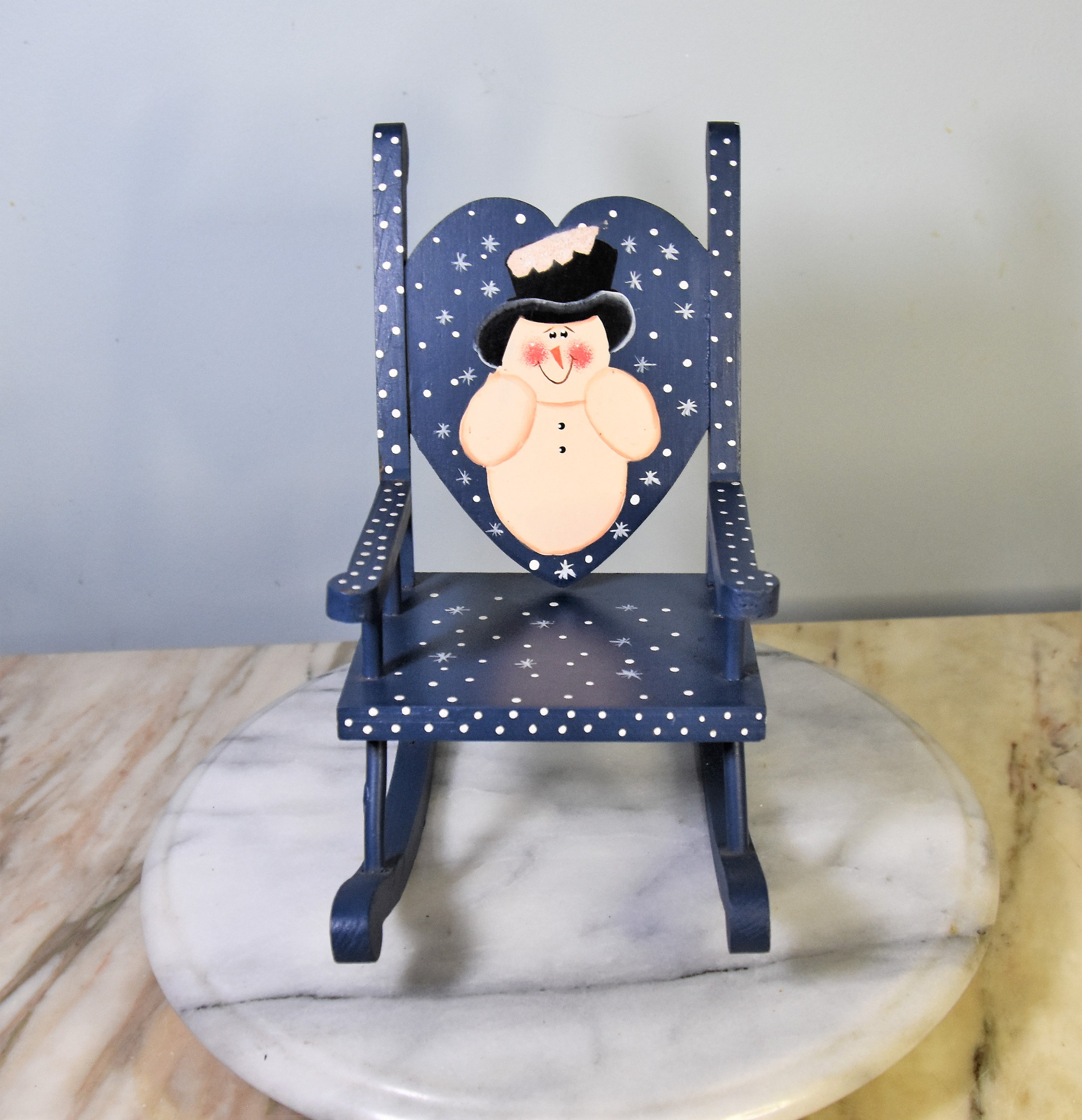 -All wood rocking chair dark blue with a snowman motif on the heart-shaped chair back, and white snowflakes all over. Chair is 9" tall, 5" wide, 7 1/2" deep at longest points.
