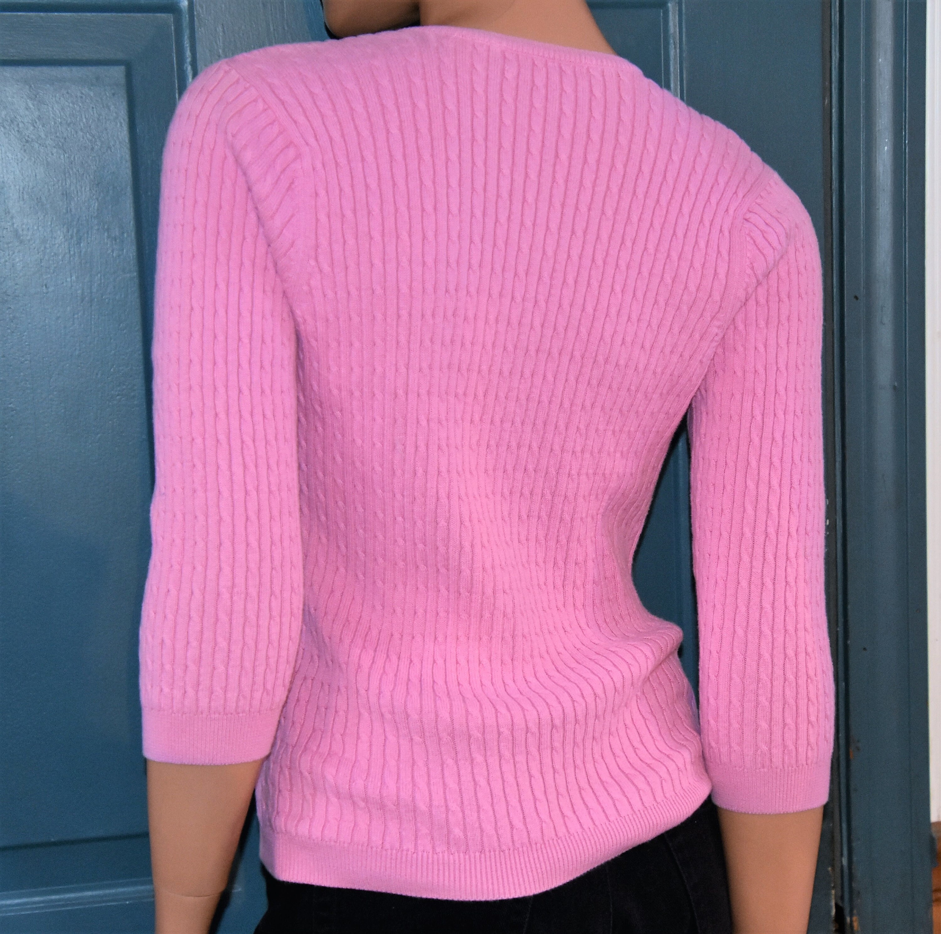 Note: This item has been cross-posted on at least one other platform and, despite saved as a favorite, may disappear.Wainscott cotton cable sweater 3/4 sleeve.