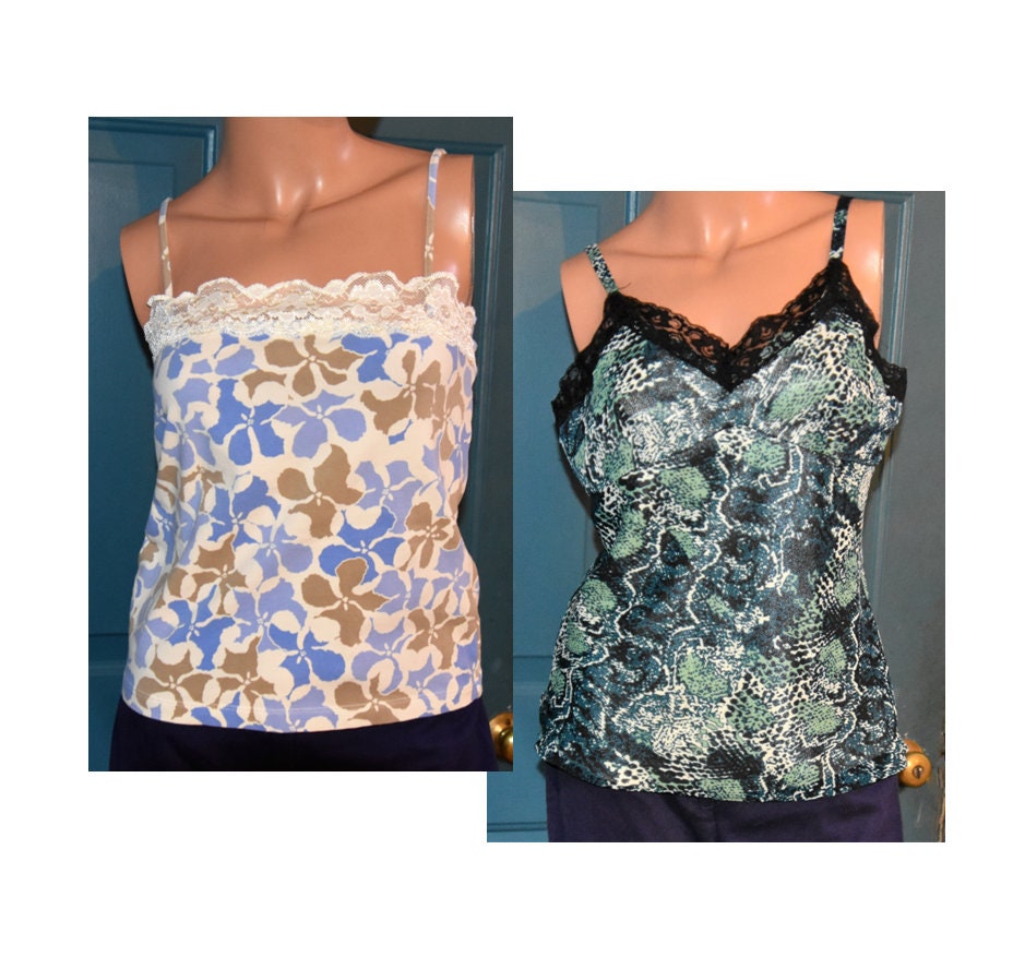 Two camisoles with lace trim, one cotton and spandex size small and one polyester shell with poly satin lining size 6 - both have adjustable straps.