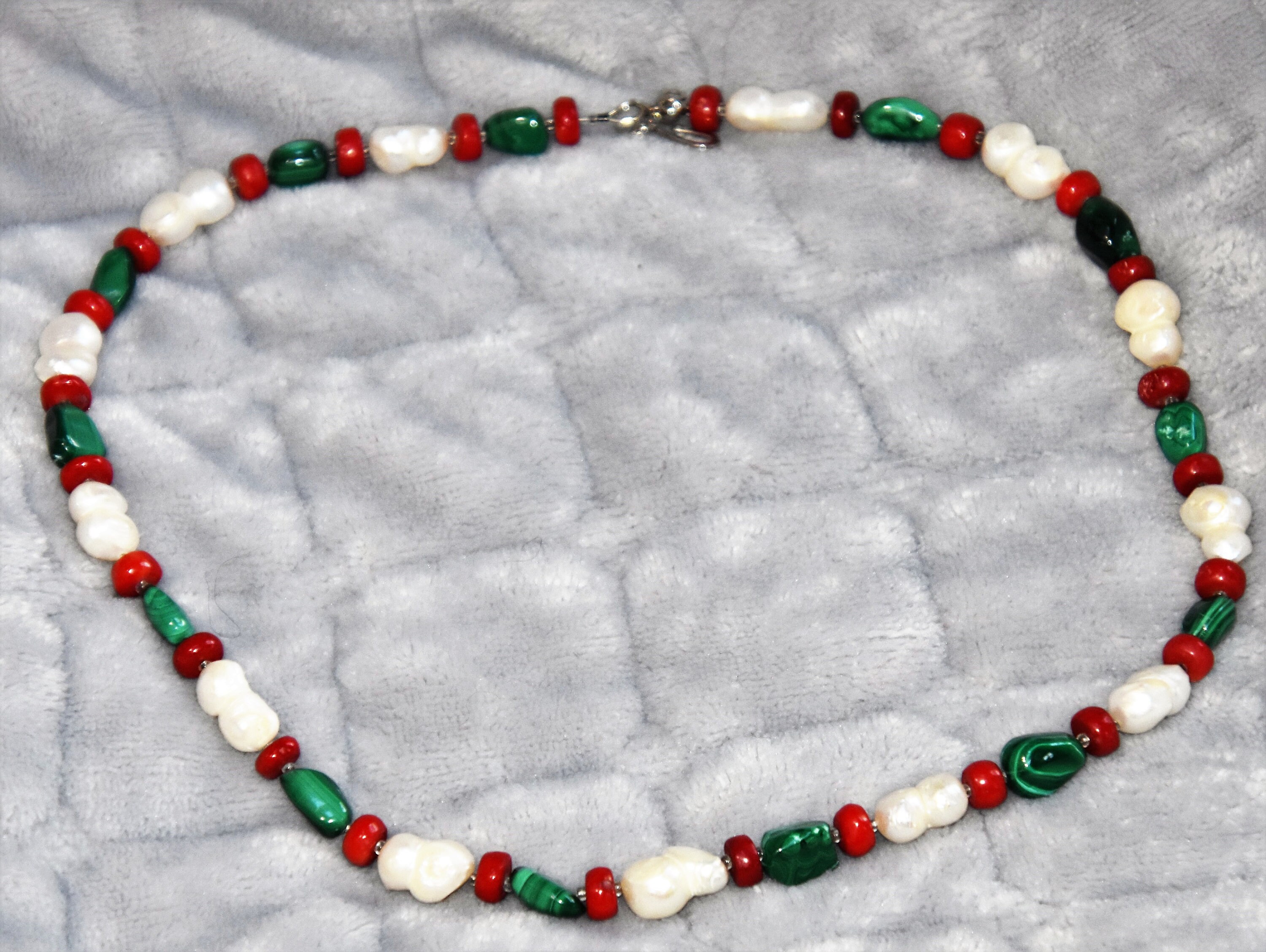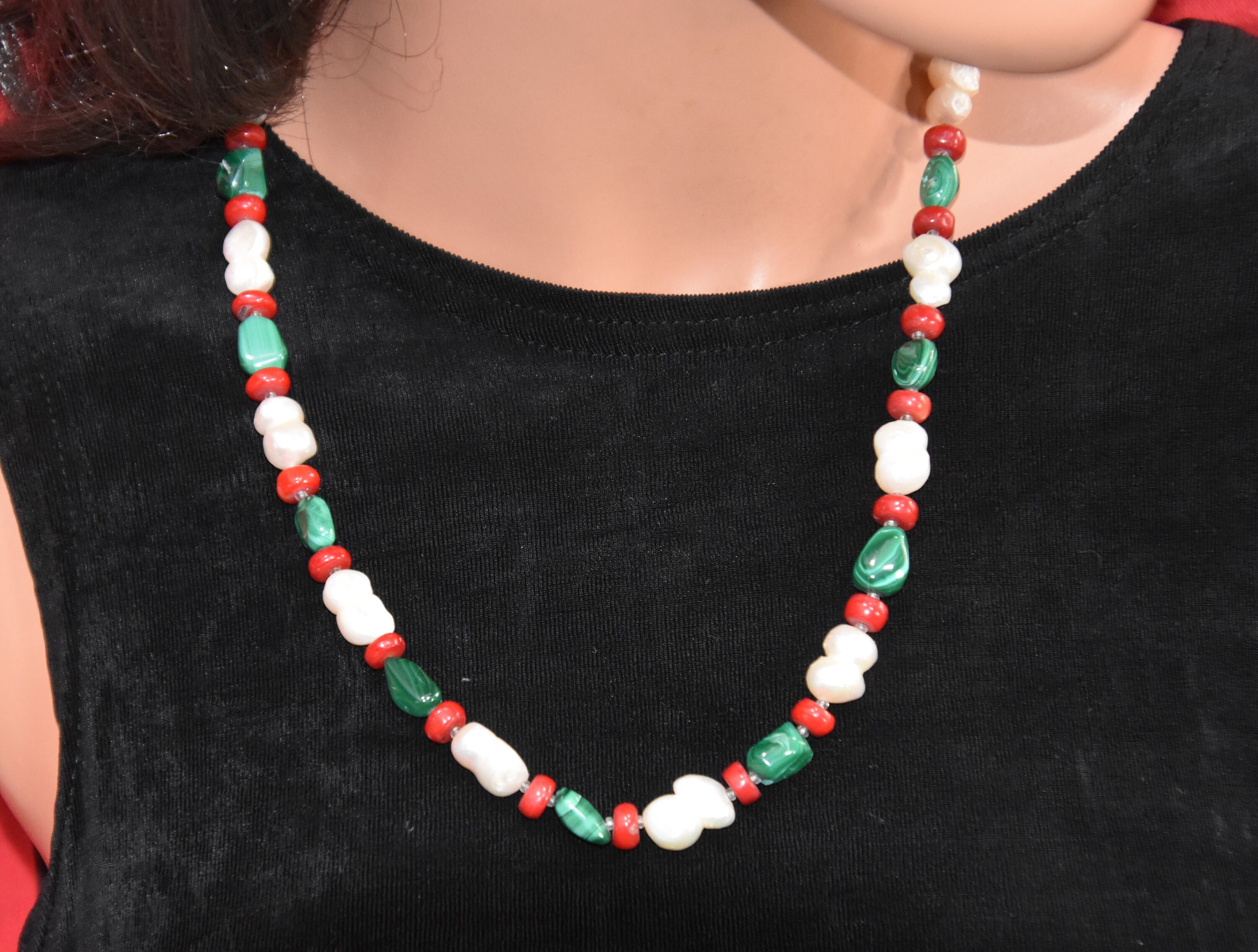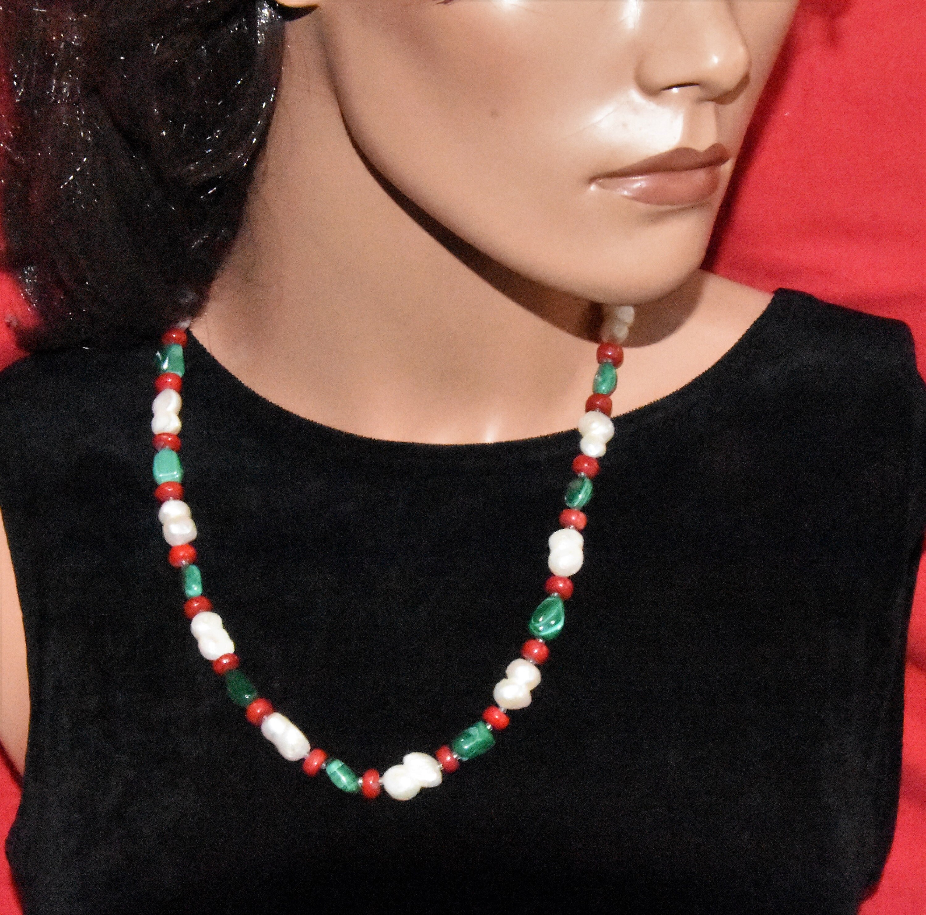 This 23" inch necklace is made was made using chunky potato style irregular double freshwater white pearls all aprox 1/2 inch to 3/4 inch long, chunks of polished green malachite and coral.