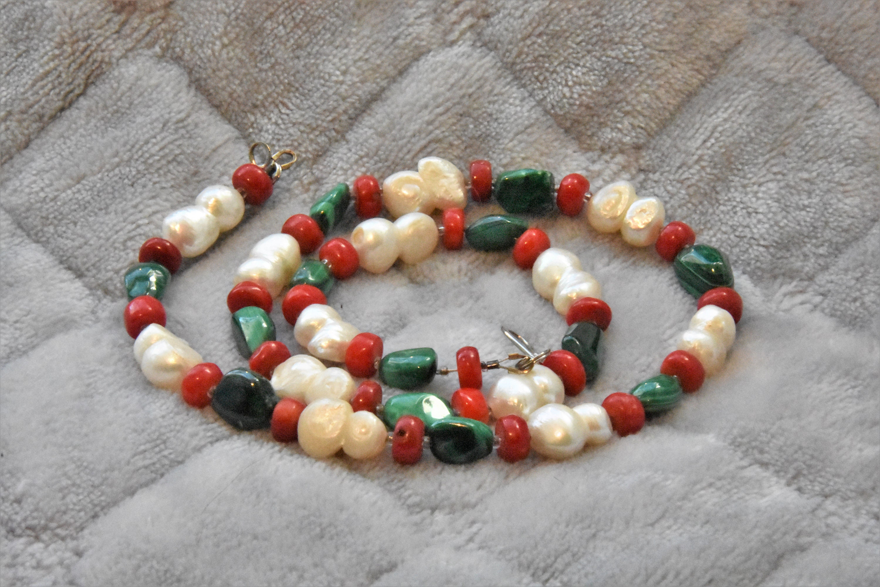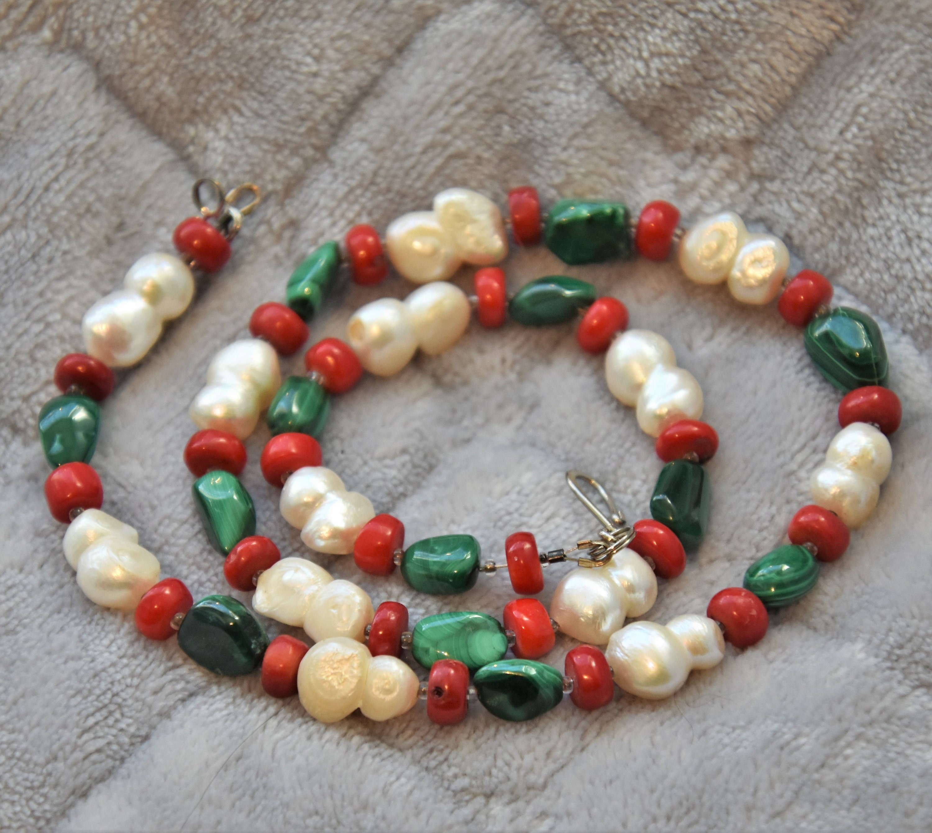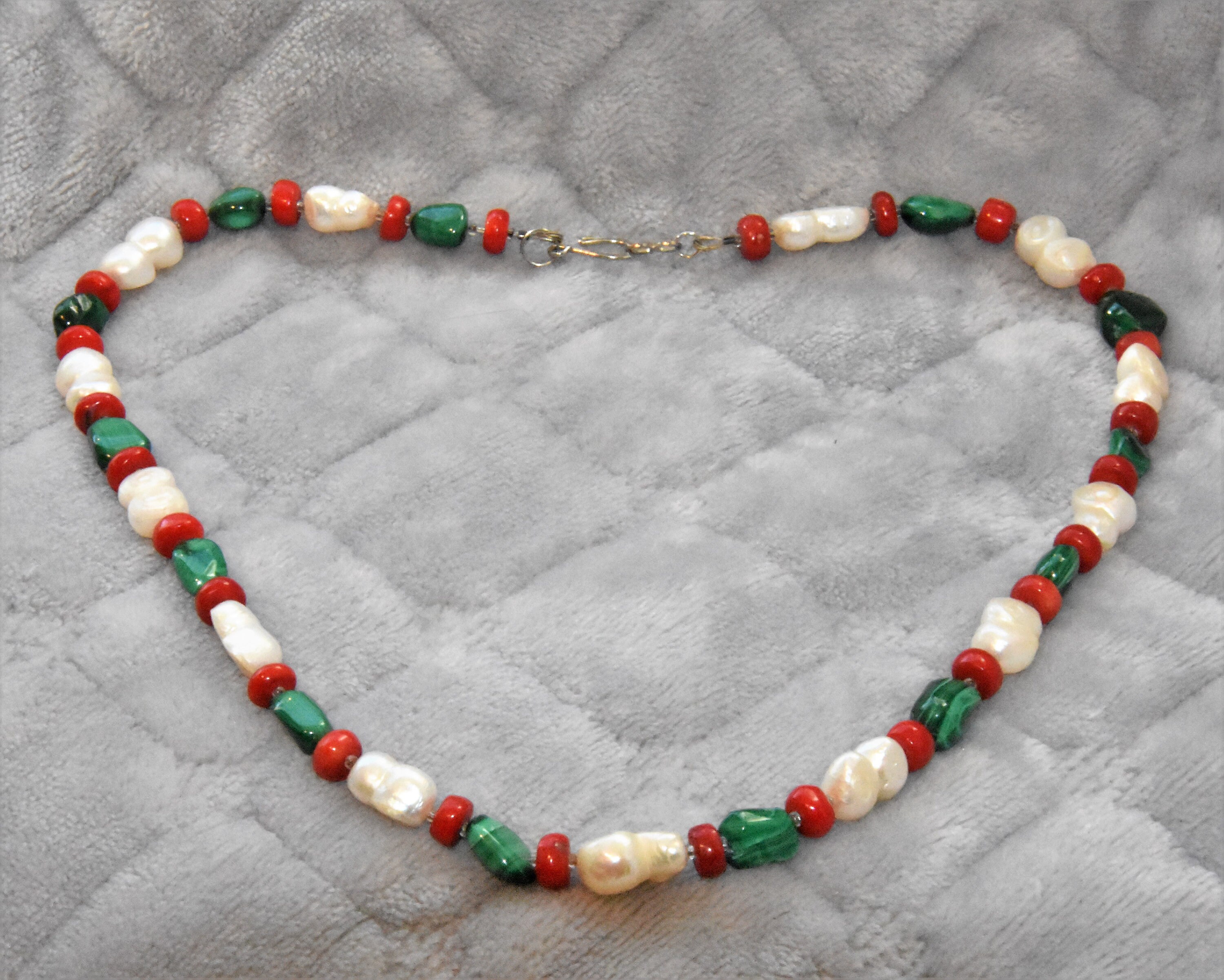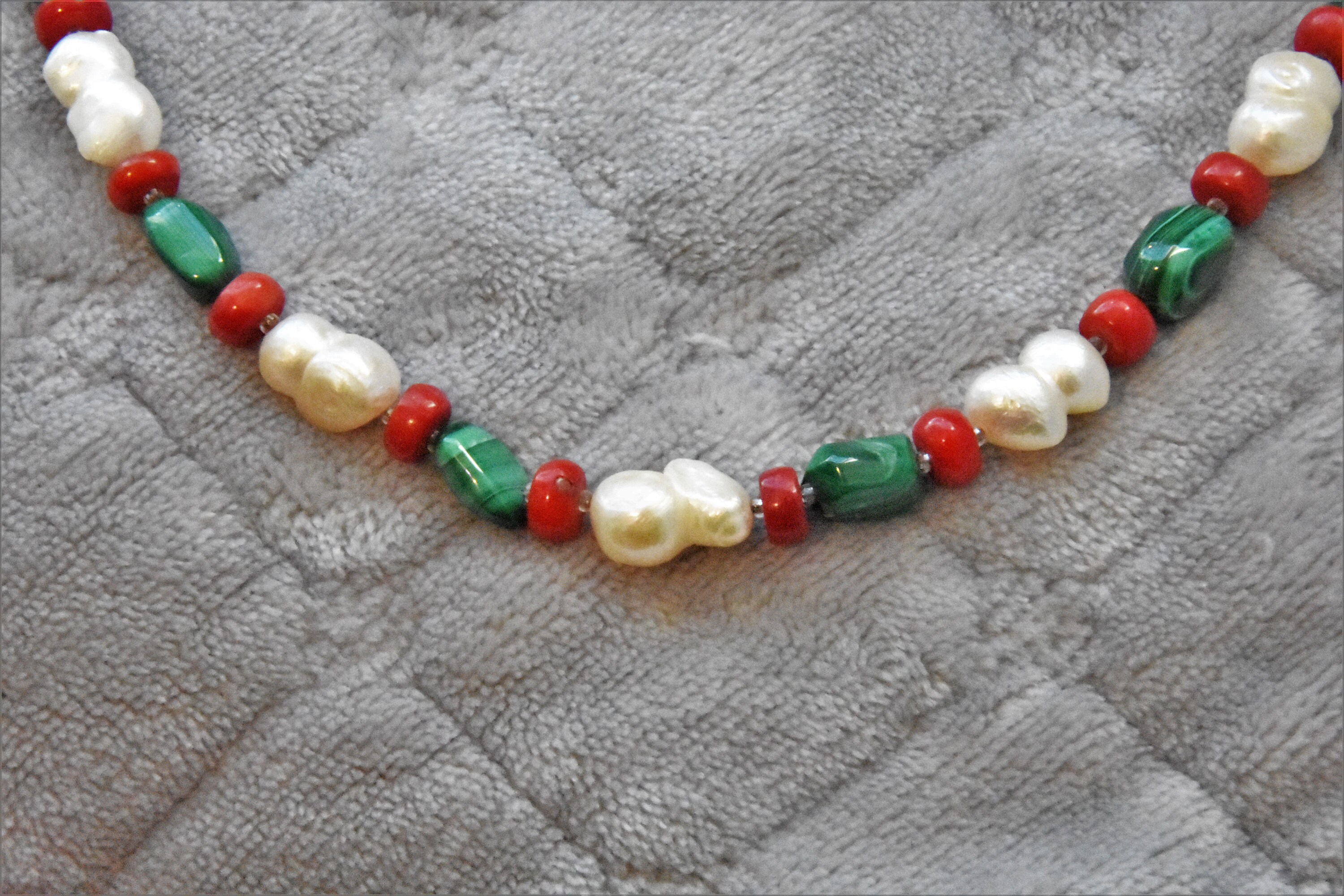 This 23" inch necklace is made was made using chunky potato style irregular double freshwater white pearls all aprox 1/2 inch to 3/4 inch long, chunks of polished green malachite and coral.
