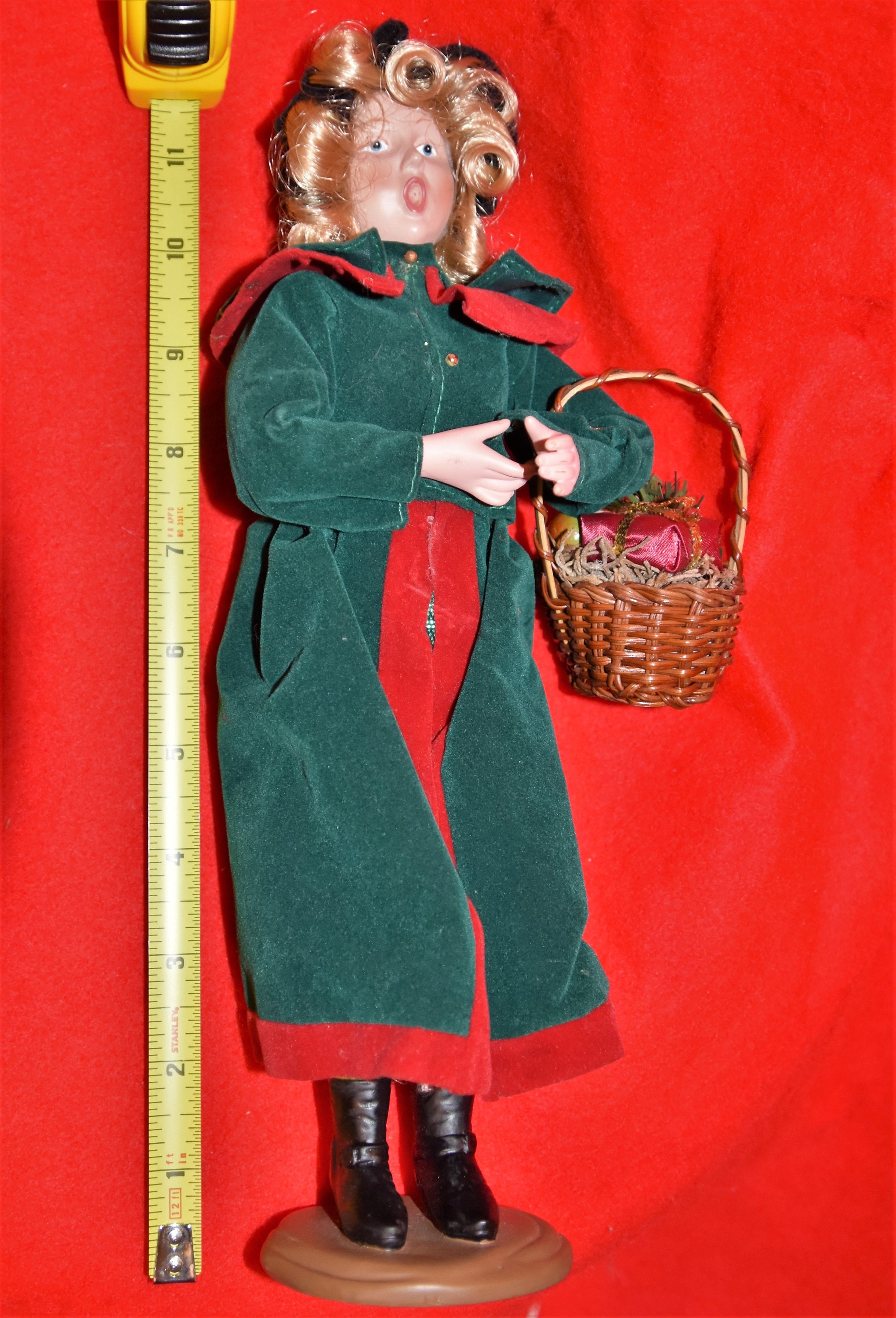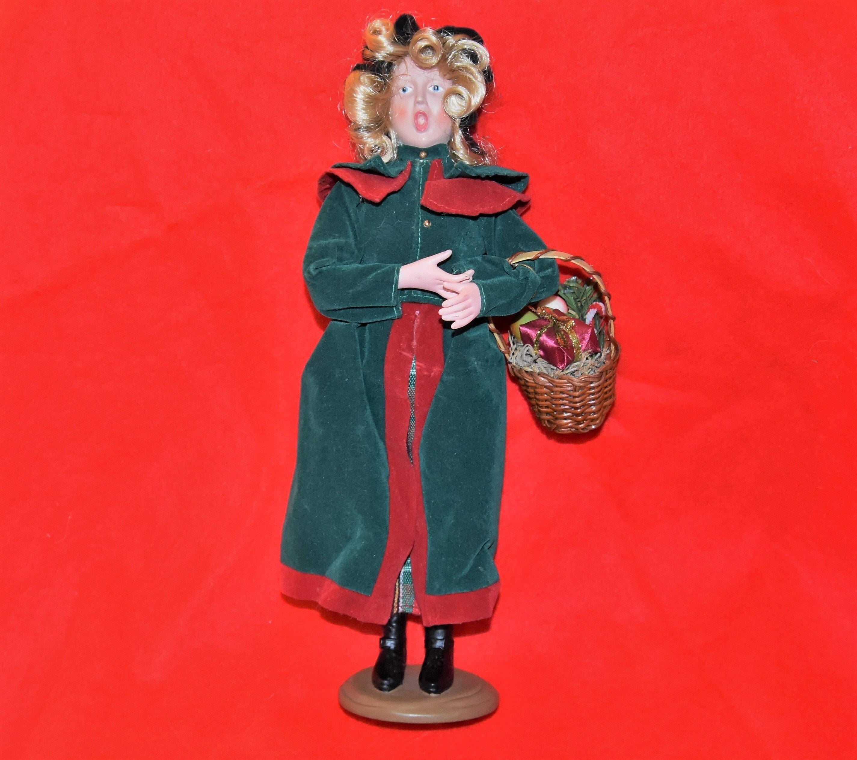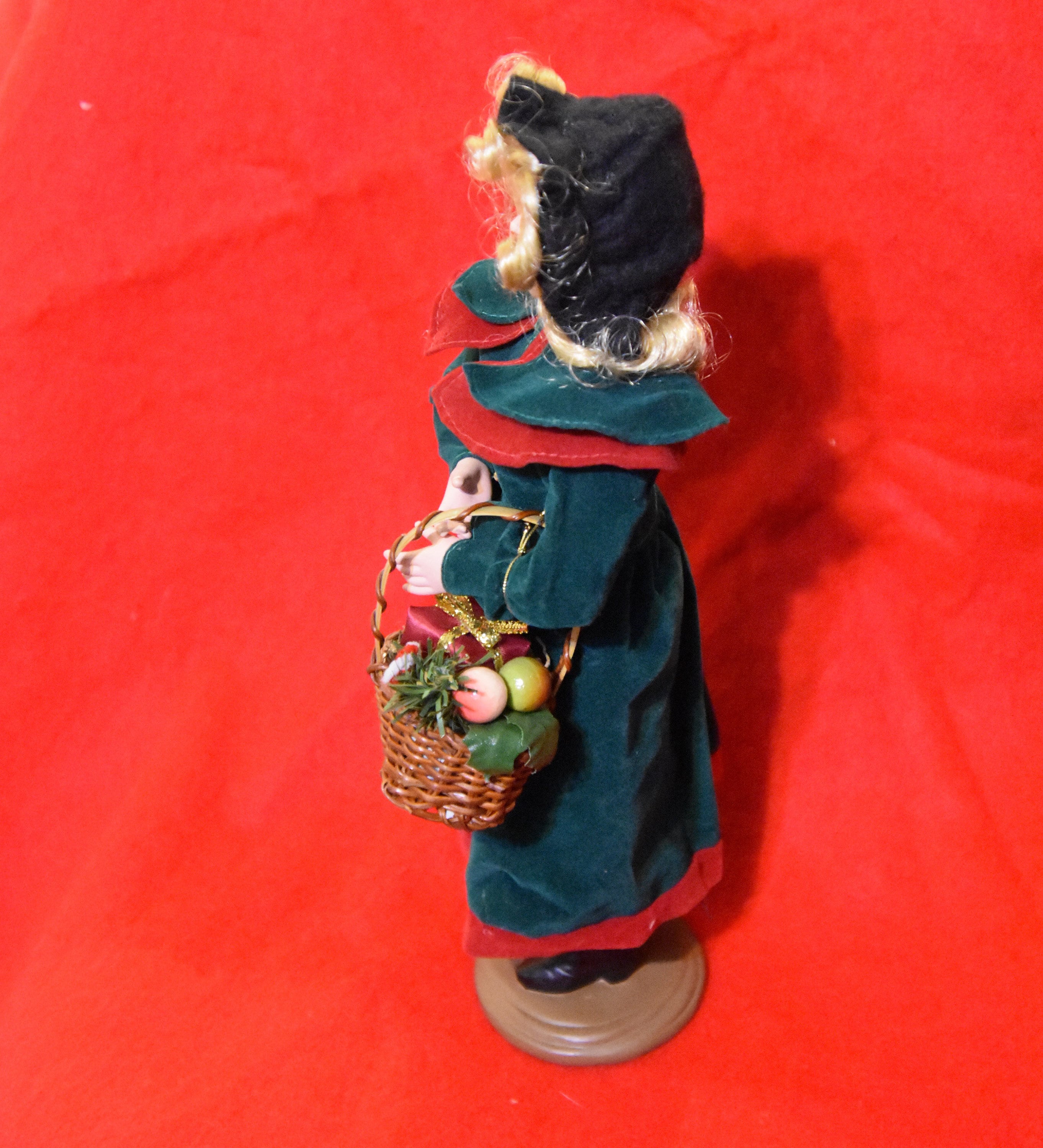 Christmas caroler doll, statue, figurine with wonderful details. Women dressed in a velvet coat, felt hat, with plastic face hands and boots stands at about a foot tall. She is carrying a basket with a fabric wrapped present plastic fruit and a pipe-cleaner candy cane. There are some light spots on the dress and hands, decided not to try to clean as they are not serious - see photos.