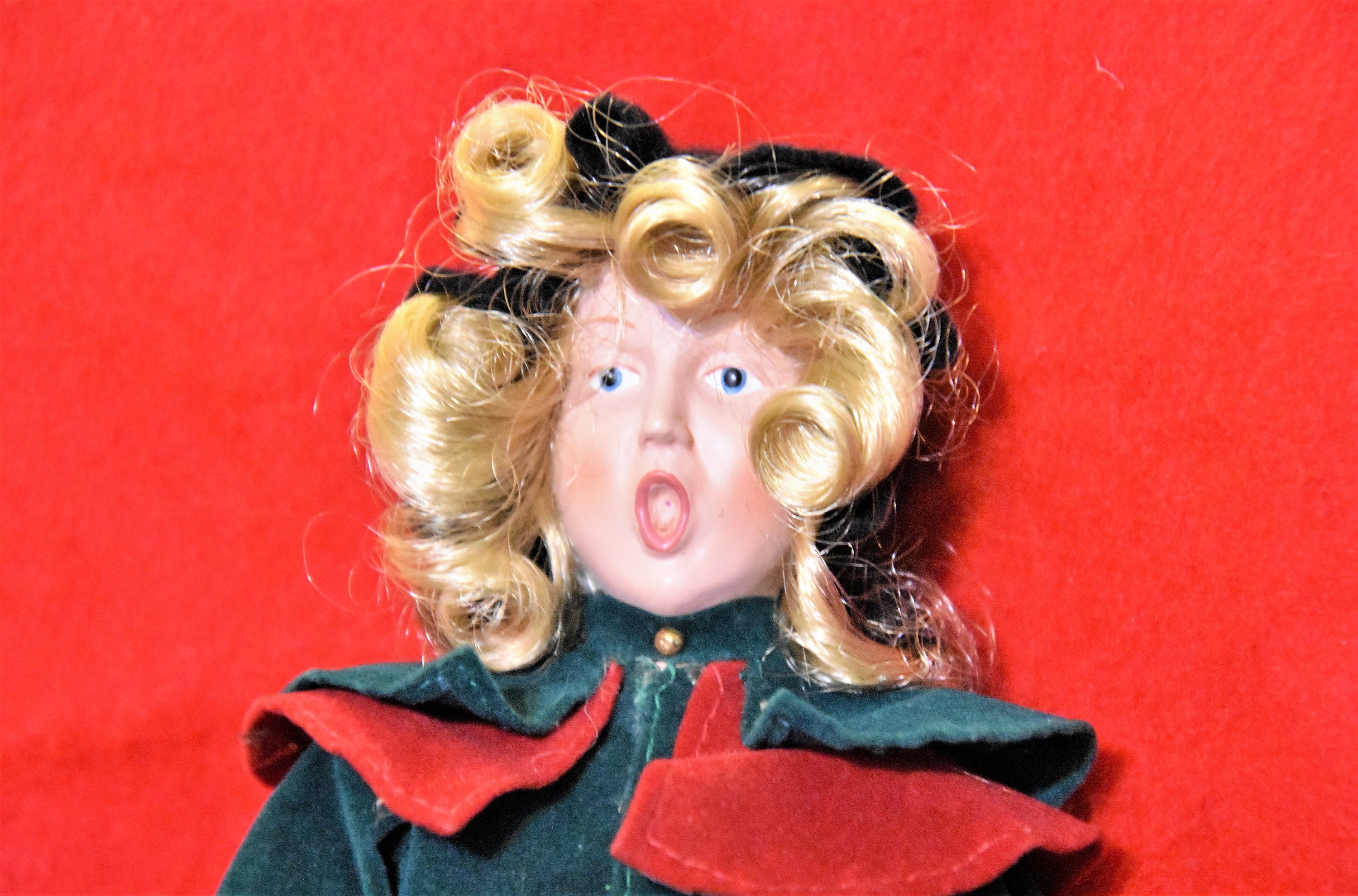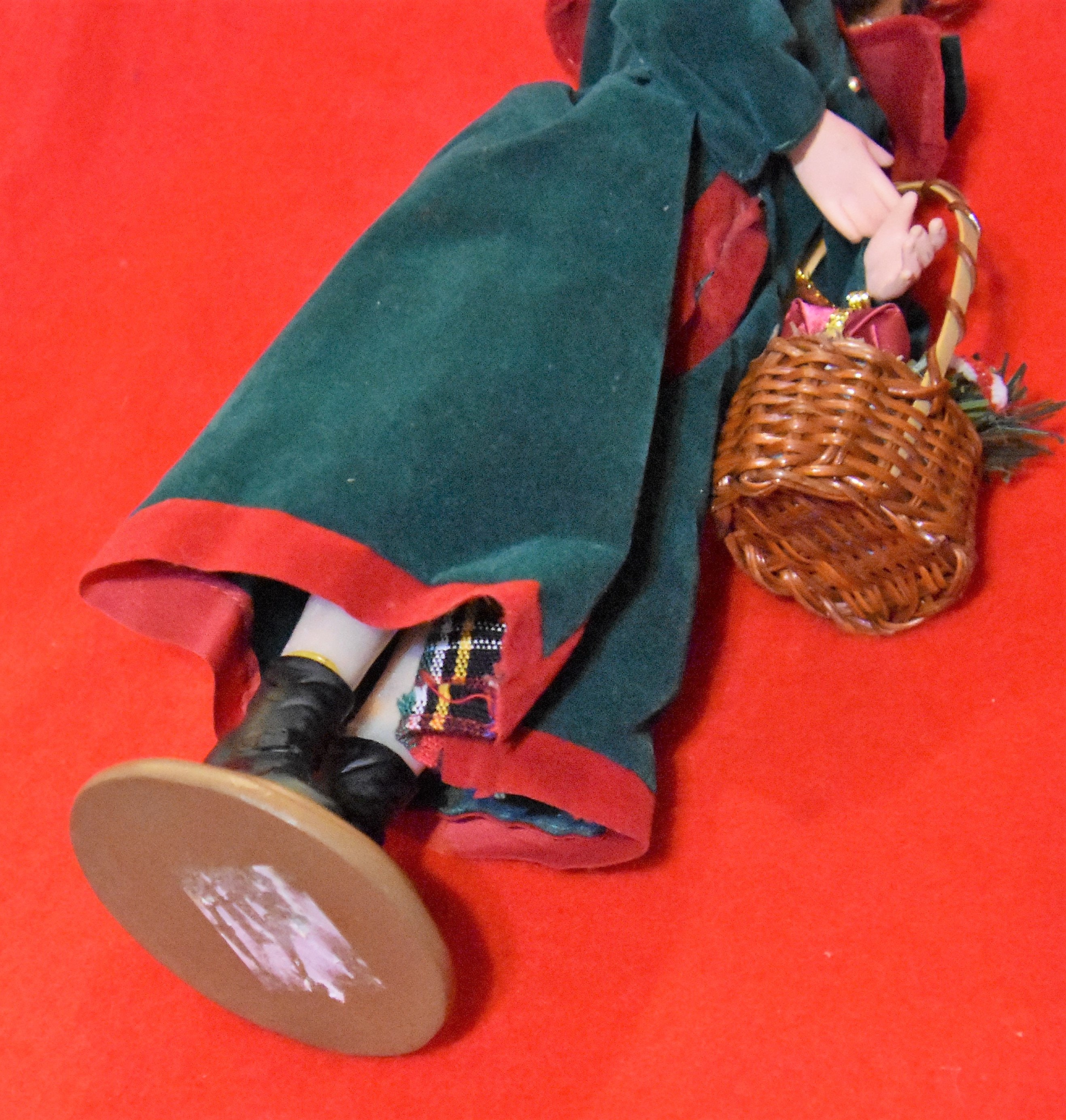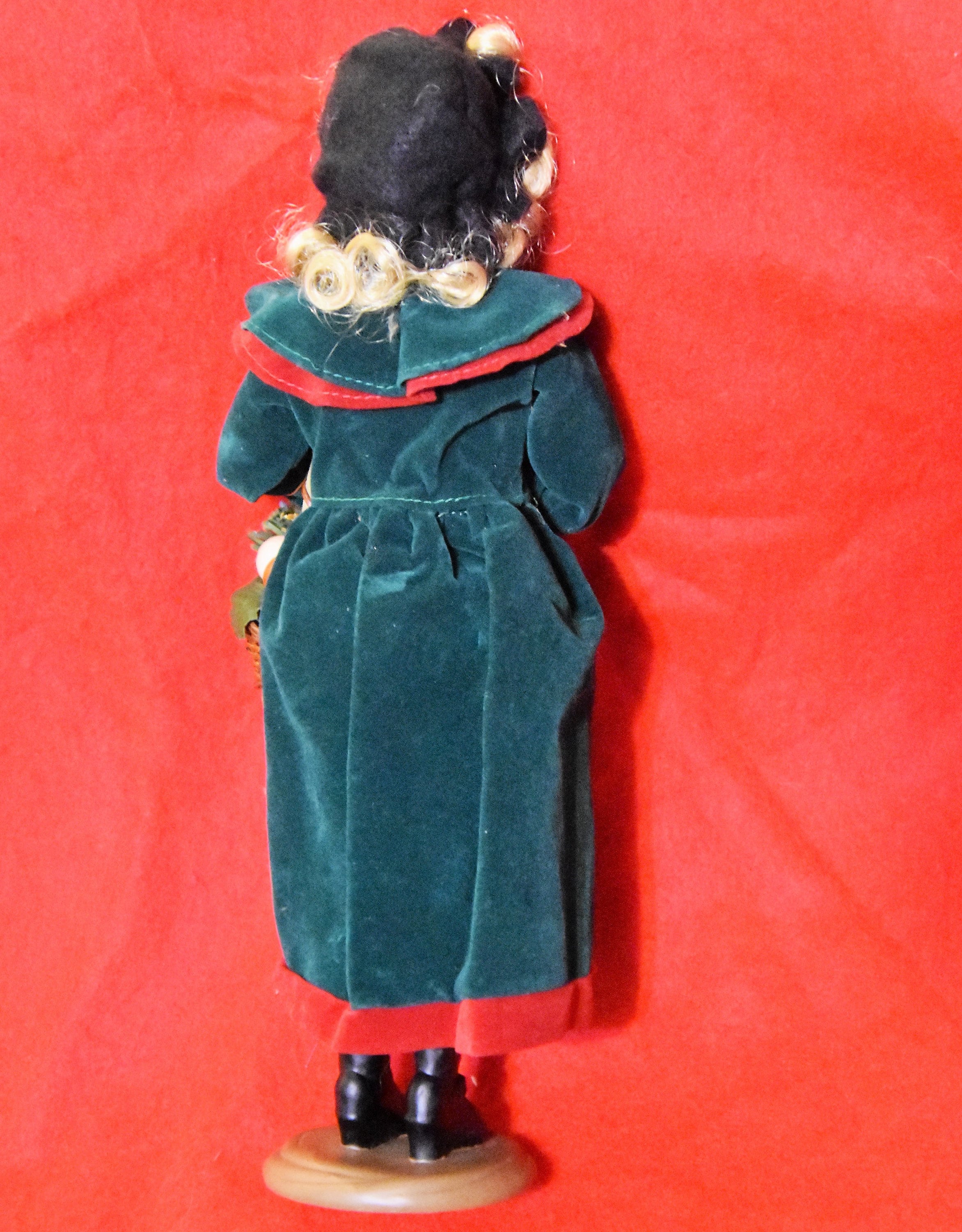 Christmas caroler doll, statue, figurine with wonderful details. Women dressed in a velvet coat, felt hat, with plastic face hands and boots stands at about a foot tall. She is carrying a basket with a fabric wrapped present plastic fruit and a pipe-cleaner candy cane. There are some light spots on the dress and hands, decided not to try to clean as they are not serious - see photos.